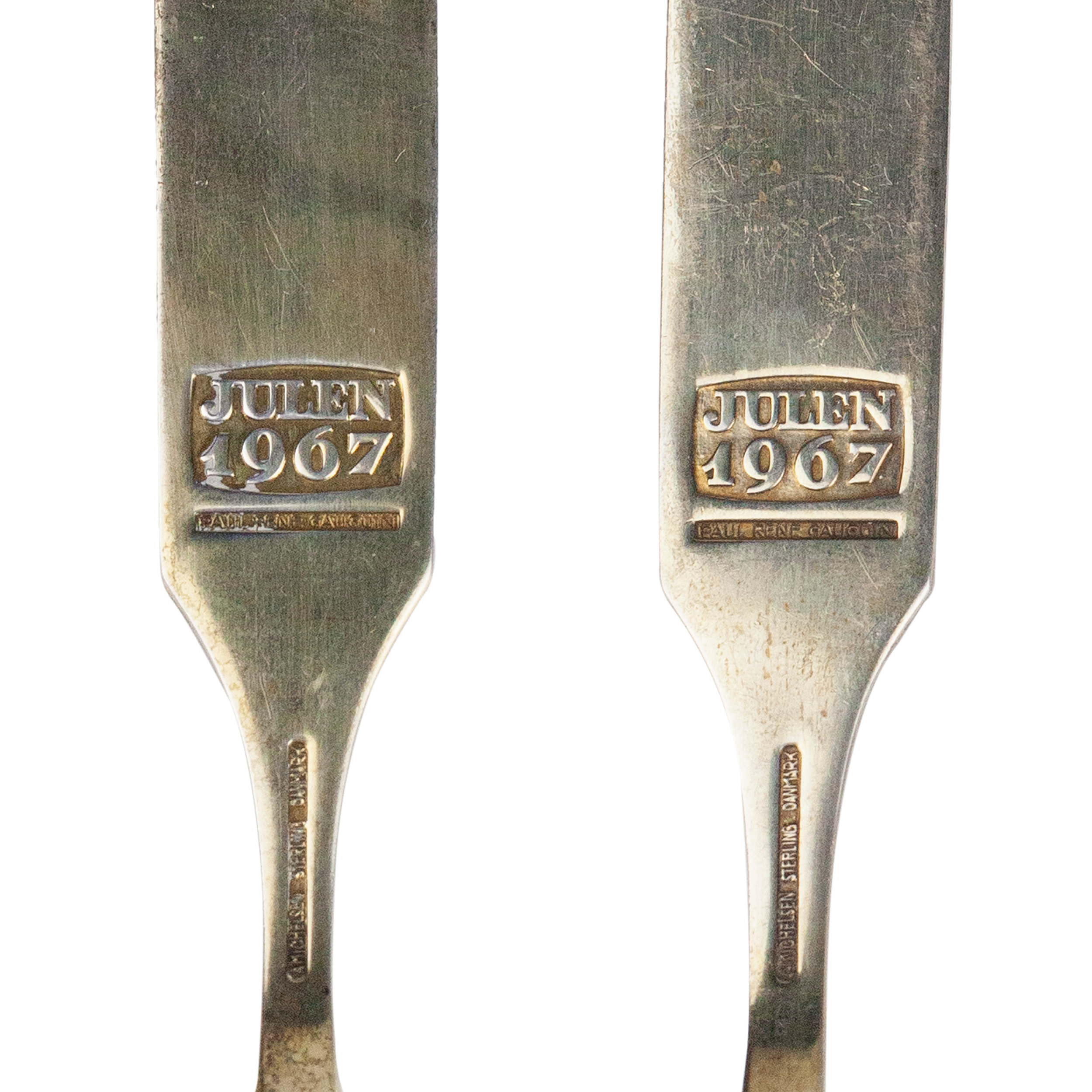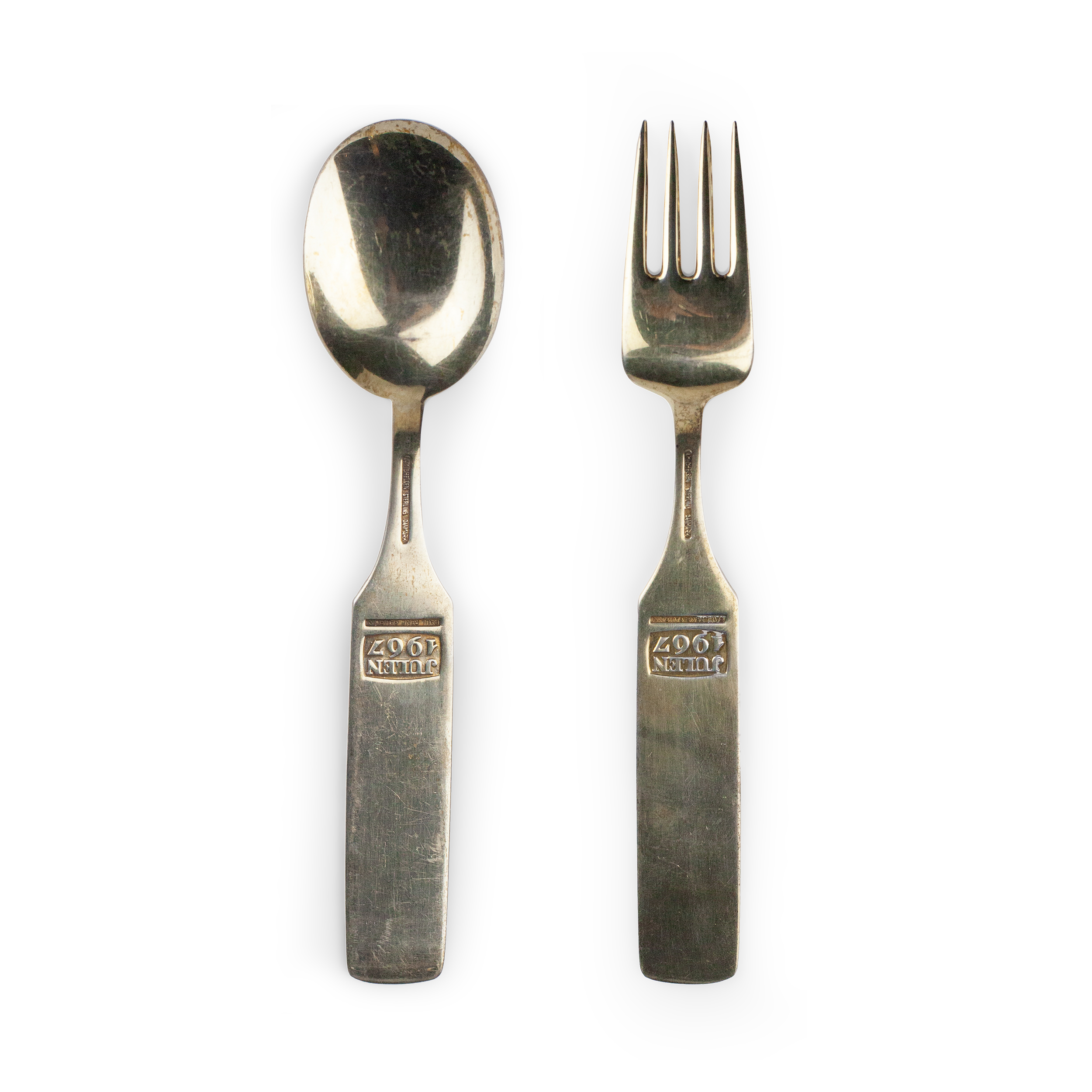 Серебро 925 пробы (с клеймом переопробации), литье, монохромная эмаль, гильоше, золочение, клеймо «A. Michelsen Sterling Danmark» в прямоугольном щитке, на черенке клейма: «Julen 1967», «Paul Rene Gauguin» норвежского живописца, графика, скульптора, книжного иллюстратора и сценографа Поля Рене Гогена (1911 - 1976), мастерская Антона Михельсена, поставщика Датского королевского двора, Копенгаген. Длина ложки – 16,2 см, вилки – 15,9 см, общий вес – 95 грамма.