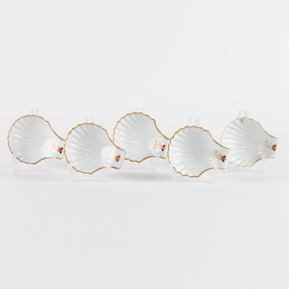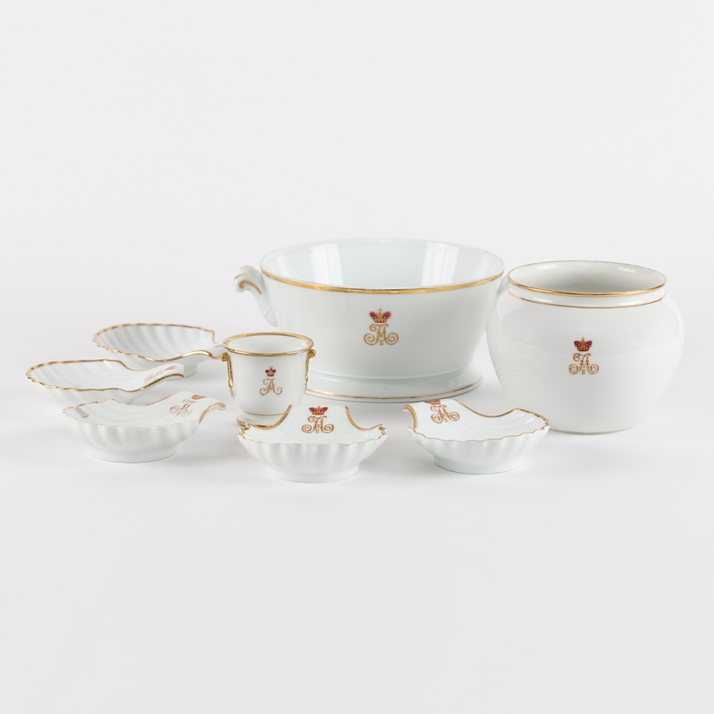 2 винные передачи, 5 икорниц, горчичница, горшок для каши и салатник. Фарфор, рельеф, надглазурная полихромная роспись, золочение, на туловах винных передач и горчичницы – ранний вариант монограммы в. кн. Александра Николаевича, клейма синие подглазурные
