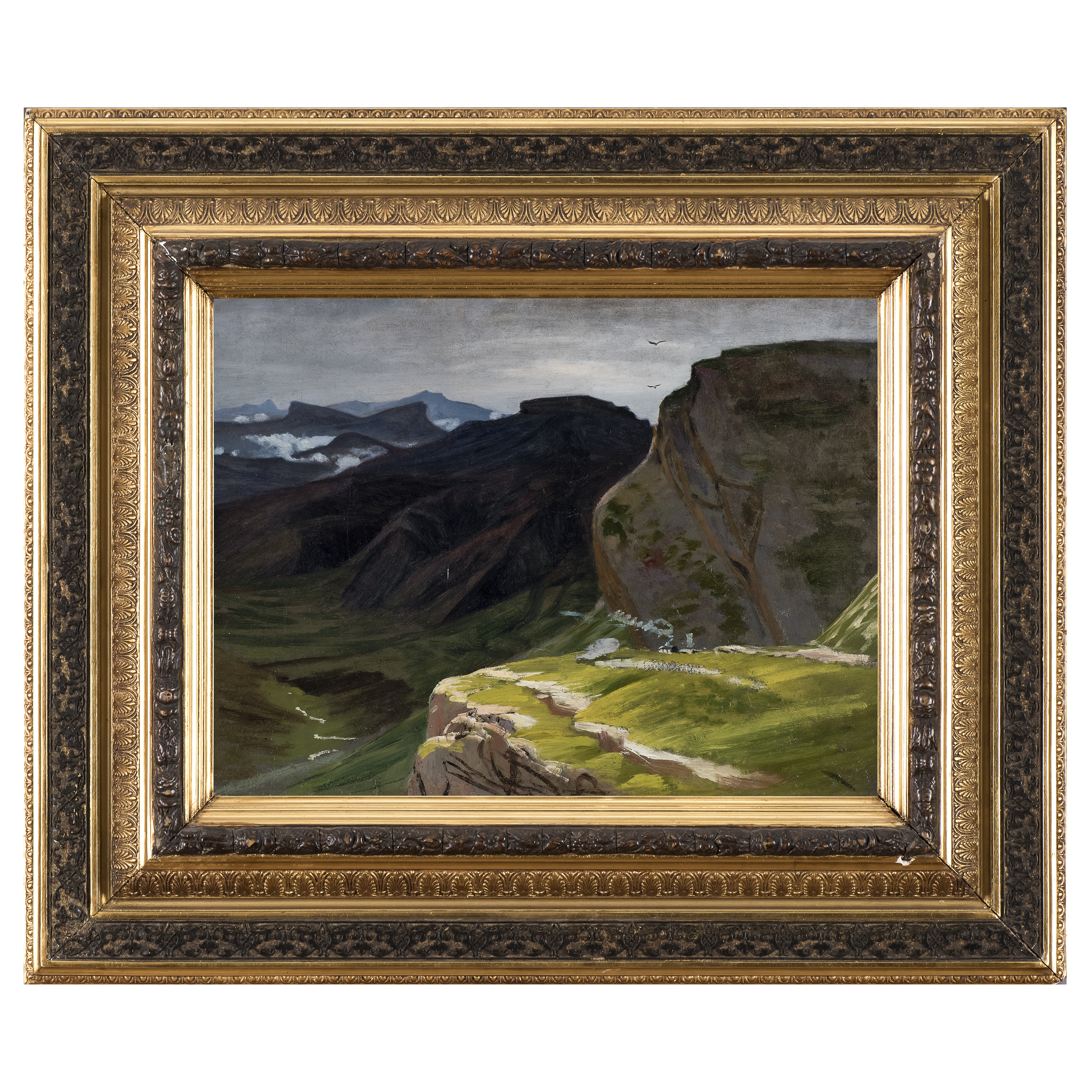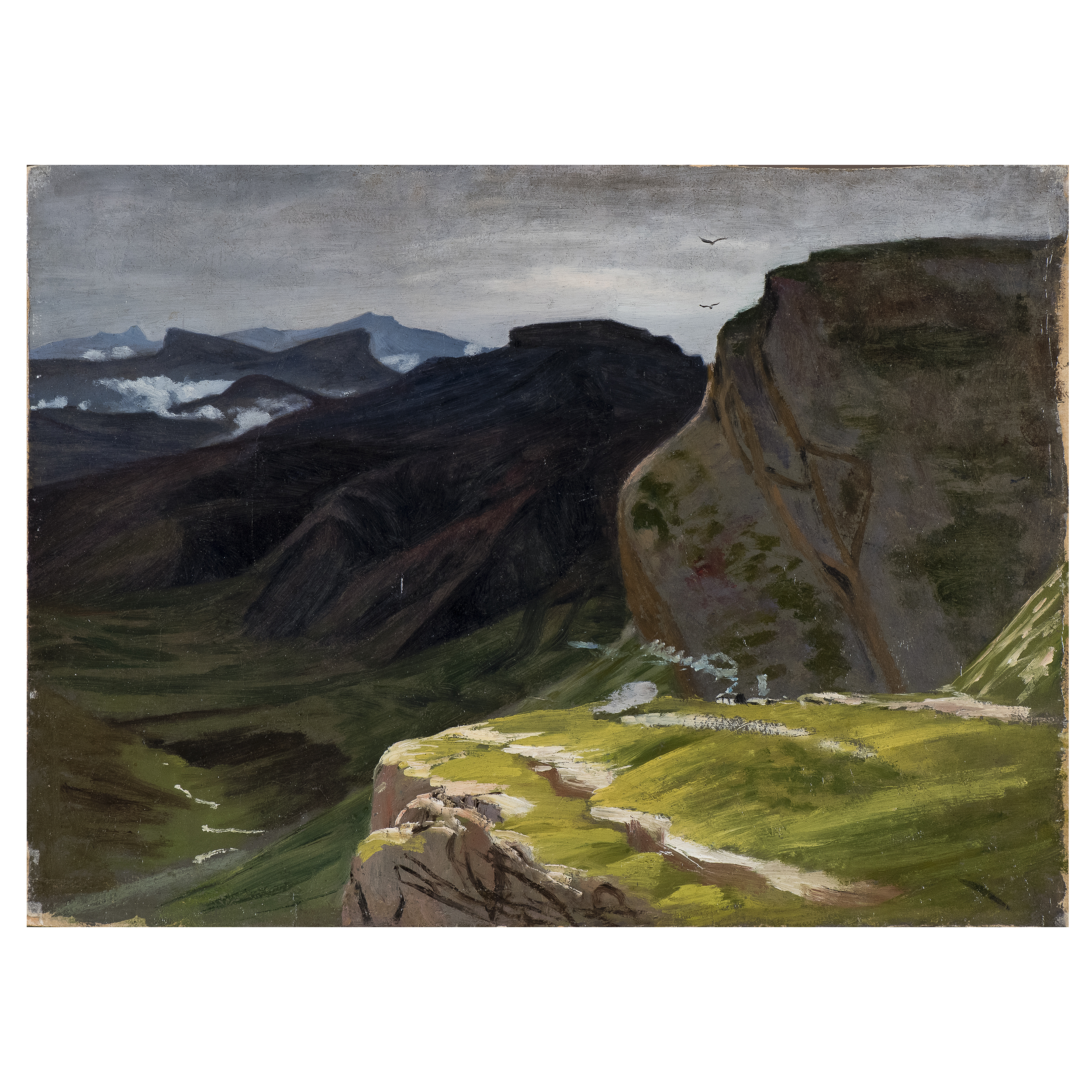 Бумага на картоне, масло, на тыльной стороне дублировочного картона дата «1889 г.», а также печать, подпись Ф. Дубовской – жены художника – и надпись: «В горах утром. Из путешествия по Военно Осетинской дороге», Николай Никанорович Дубовской (1859-1918), Россия, 1889 год, размер (в/ш): 31,5 х 33,5 см, в раме: 55,5 х 66 см. Сопровождается заключением Государственного Русского Музея