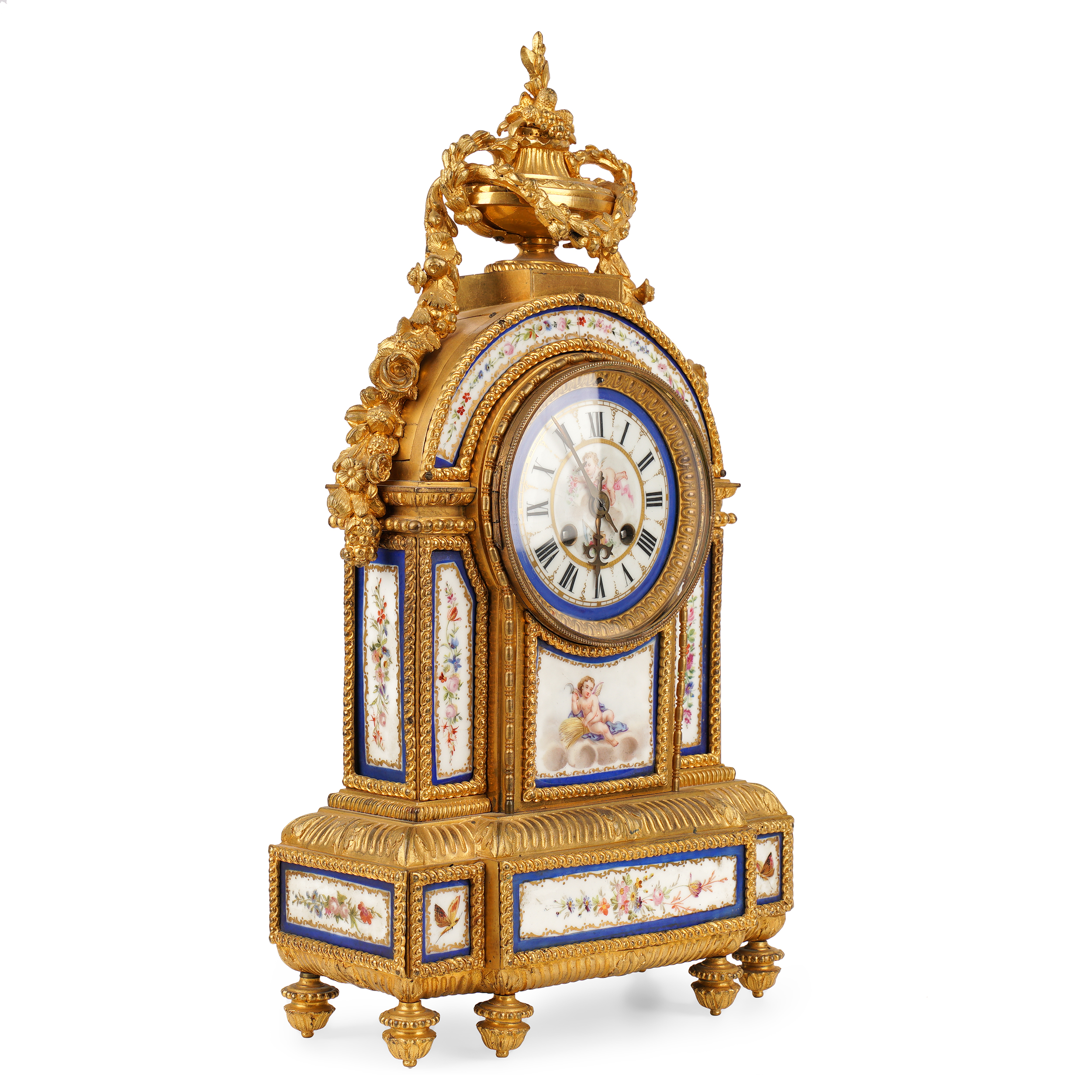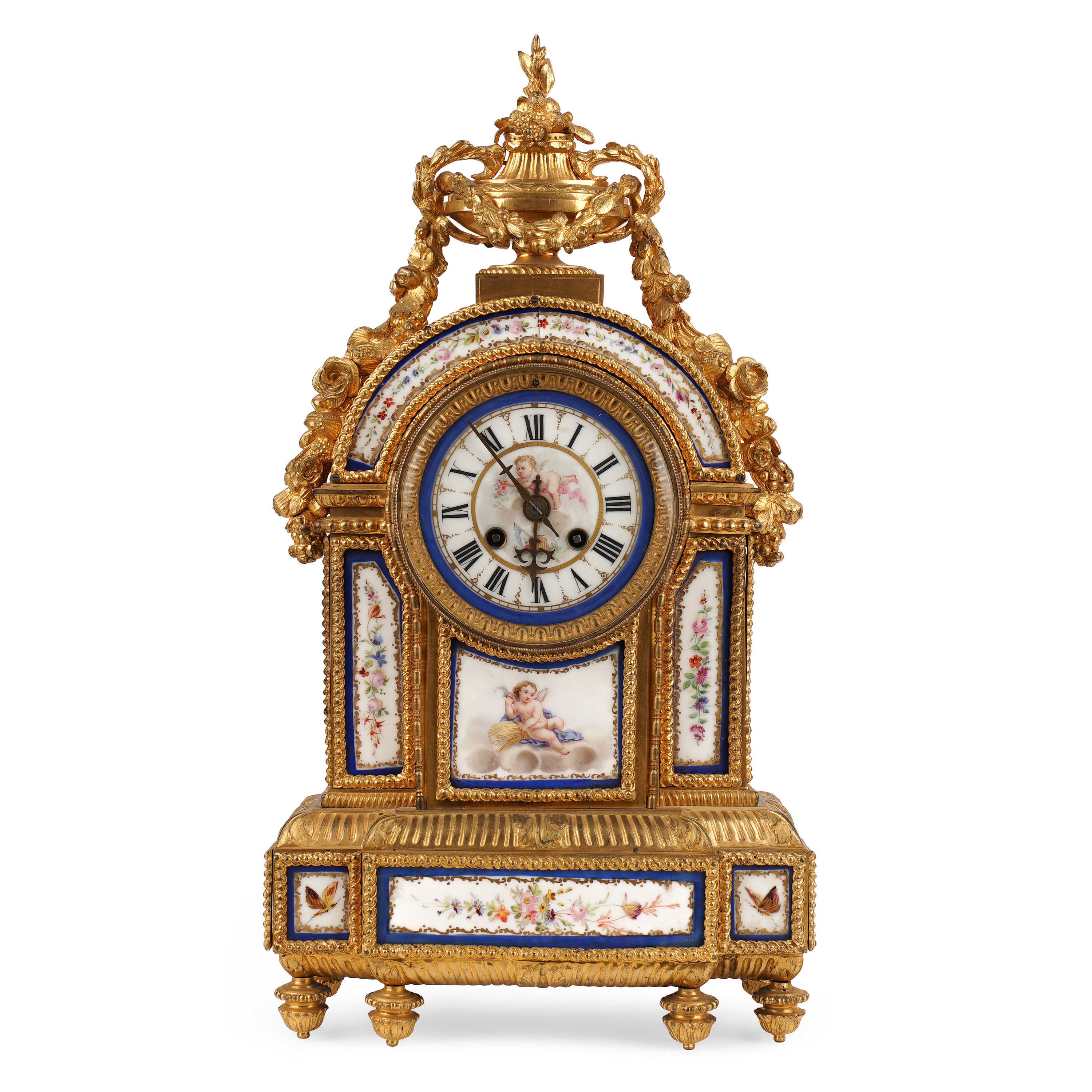 Корпус украшен свисающими по бокам гирляндами дамасских роз и навершием в виде стилизованной вазы. Бронза, литье, золочение, чеканка, фарфор, полихромная роспись, монтировка; эмалевый циферблат с росписью в медальоне, с римскими цифрами часов и делением на минуты, стрелки вороненые, Севрская или Лиможская мануфактура, Франция, 1880-е годы, размер (в/ш/г):