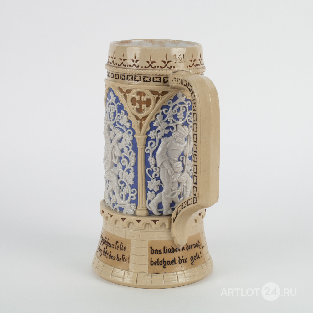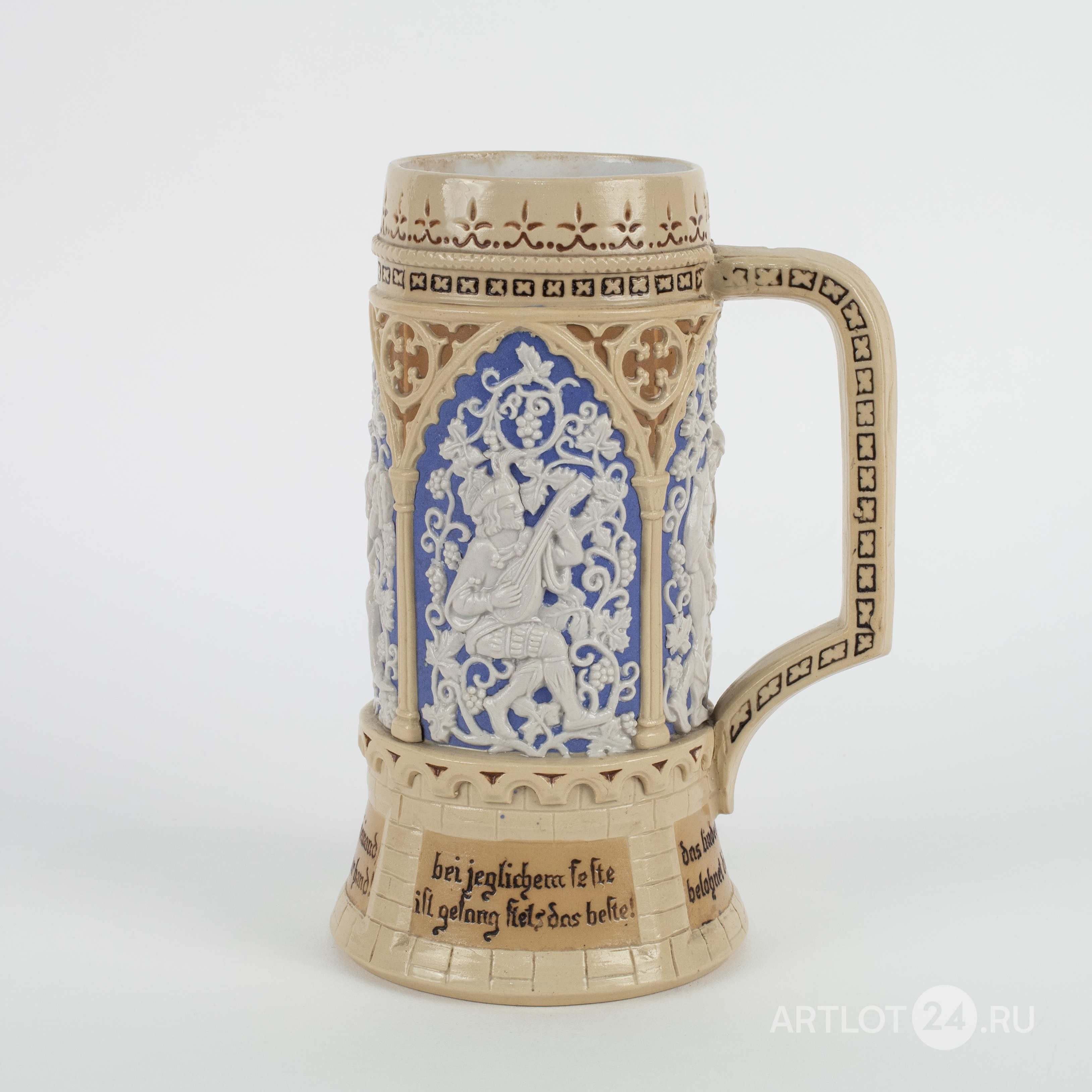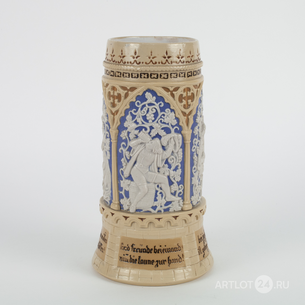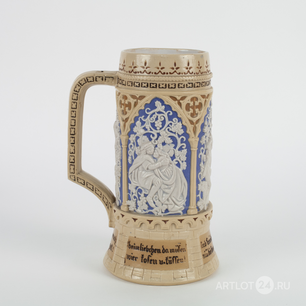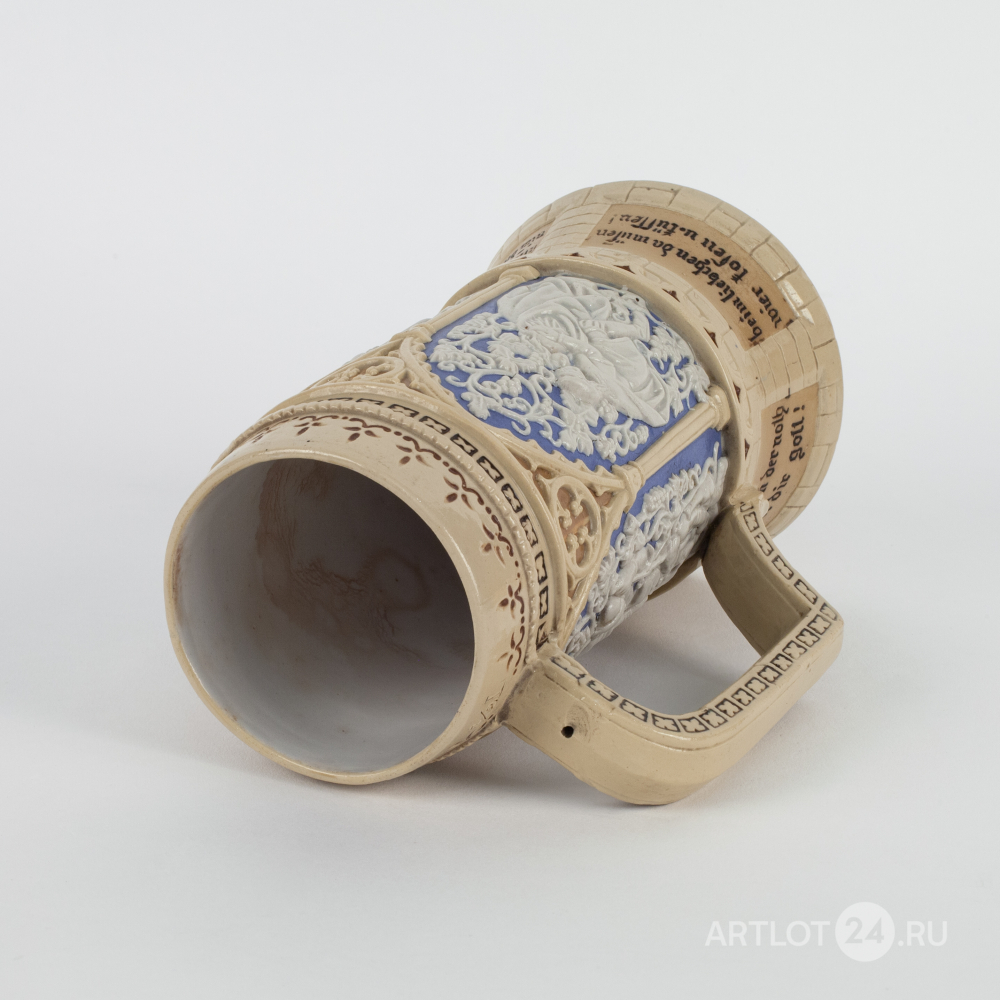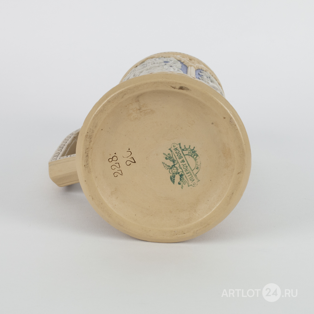 Фаянс, накладной рельеф, полихромная роспись, в основании зеленое клеймо штампом «VILLEROY and BOCH METTLACH», а также «228.», «20.» на ободе «1/2 L» (обозначение объема), олово, литье, Германия, фабрика Виллерой и Бох (Villeroy & Boch), Метлах, 1874-1909 годы, высота – 18 см