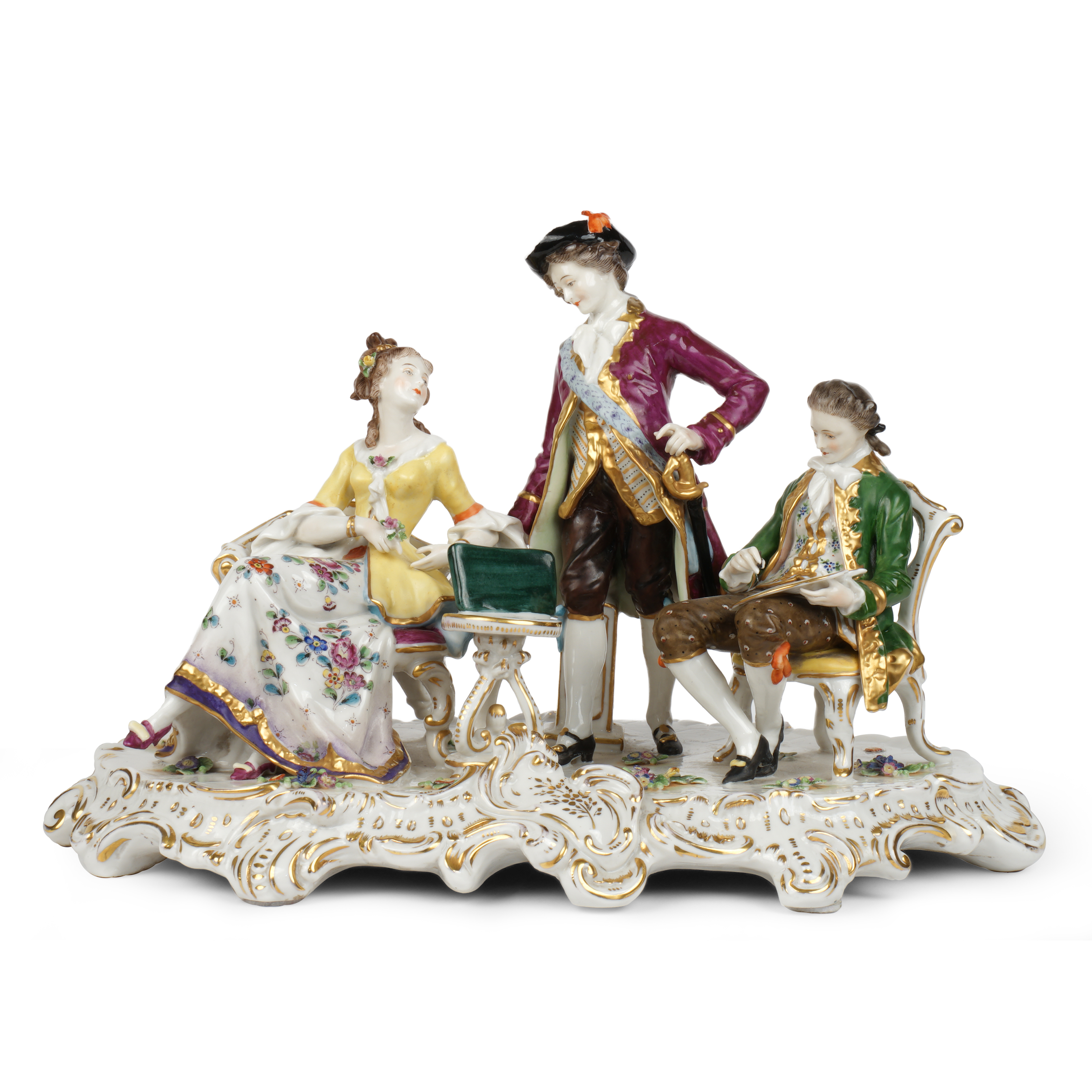 Красочная композиция выполнена из фарфора в лучших традициях мейсенских мастеров. Непринужденность и естественность поз героев этюда – прекрасной дамы и двух ее кавалеров, яркость их нарядов и легкая золотая вязь на белоснежном фоне основания притягивают взгляд, а истинных знатоков и вовсе приведут в искреннее восхищение. Композиция станет яркой нотой, придающей аутентичность интерьеру в стиле классика или барокко.