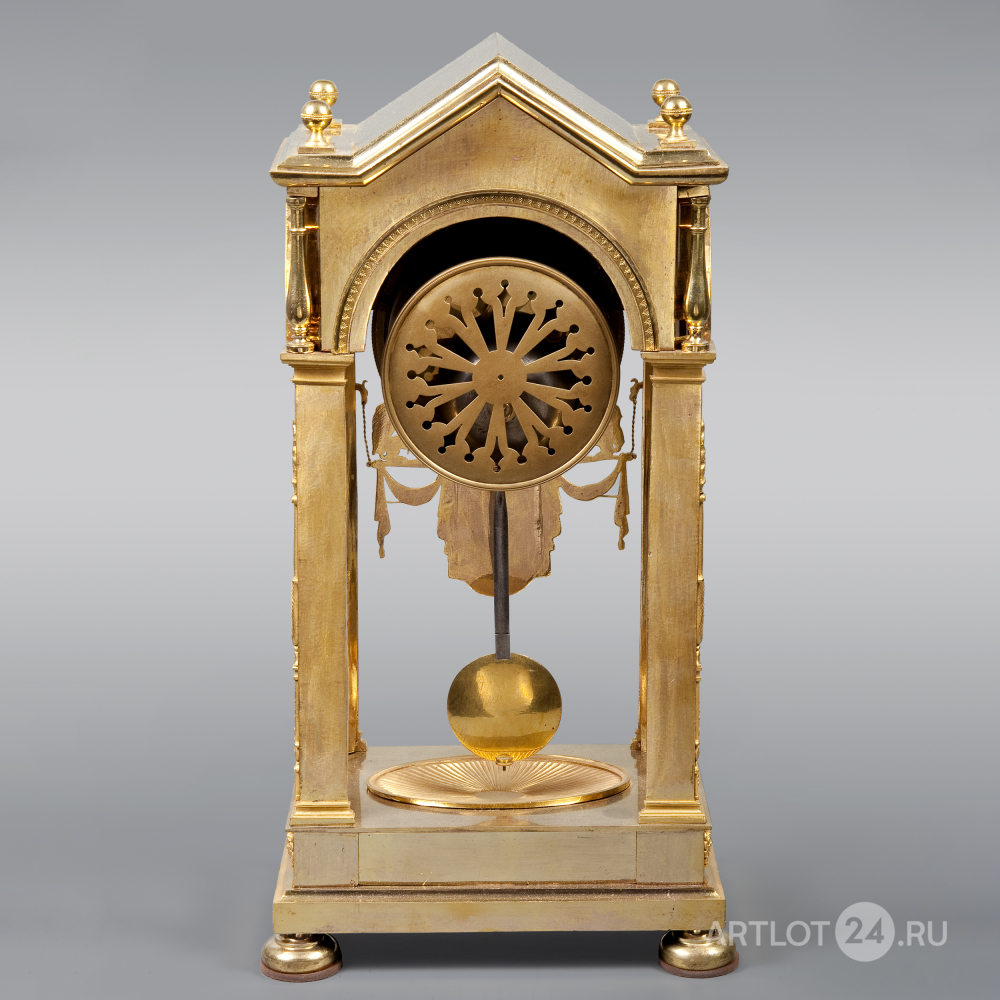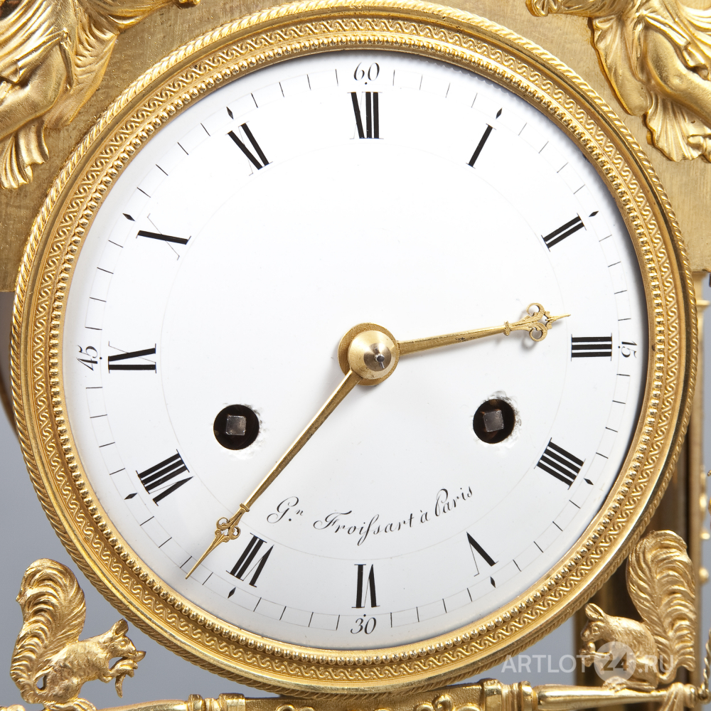 Бронза, литье, чеканка золочение ормулю (d`ormoulu), эмалевый циферблат с римскими цифрами часов и делением на минуты, золоченые стрелки, надпись на циферблате «G. Froissart à Paris», часовщик Фруассар-Делаэй (Froissart-Delahaye), ученик легендарного Абрахама-Луи Бреге, Франция, первая треть XIX века, размер (в/ш/г): 43 х 22,5 х 14 см. Ключ и маятник в комплекте