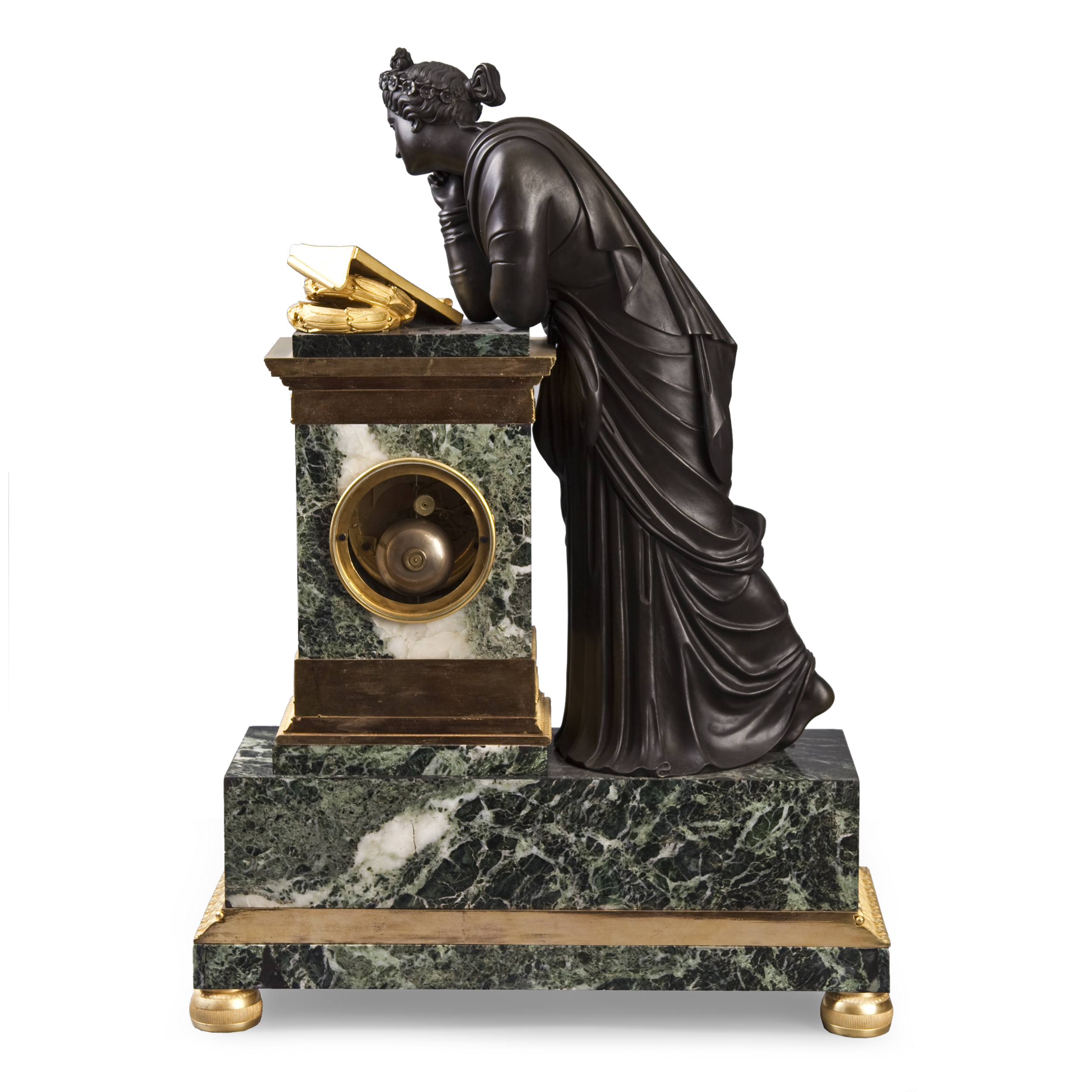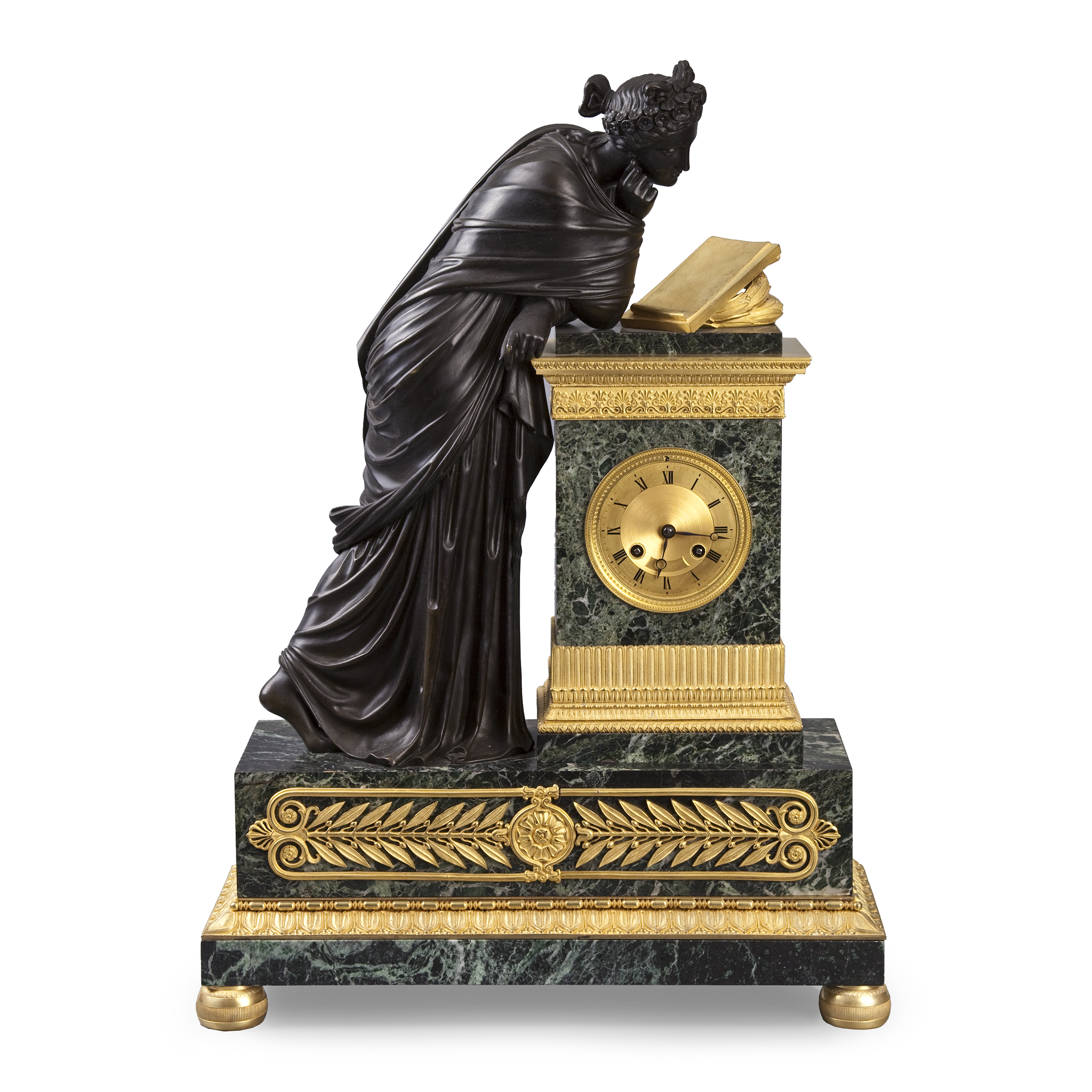 Бронза, литье, чеканка, патинирование, золочение, мрамор «vert du mer», бронзовый циферблат с римскими цифрами и делениями на минуты, стрелки - стальные вороненые, бронзовщик Луи-Станислас Ленуар-Раврио, Франция, Париж, около 1820- 1825 годов, размер (в/ш/г): 63 х 47 х 17 см.
