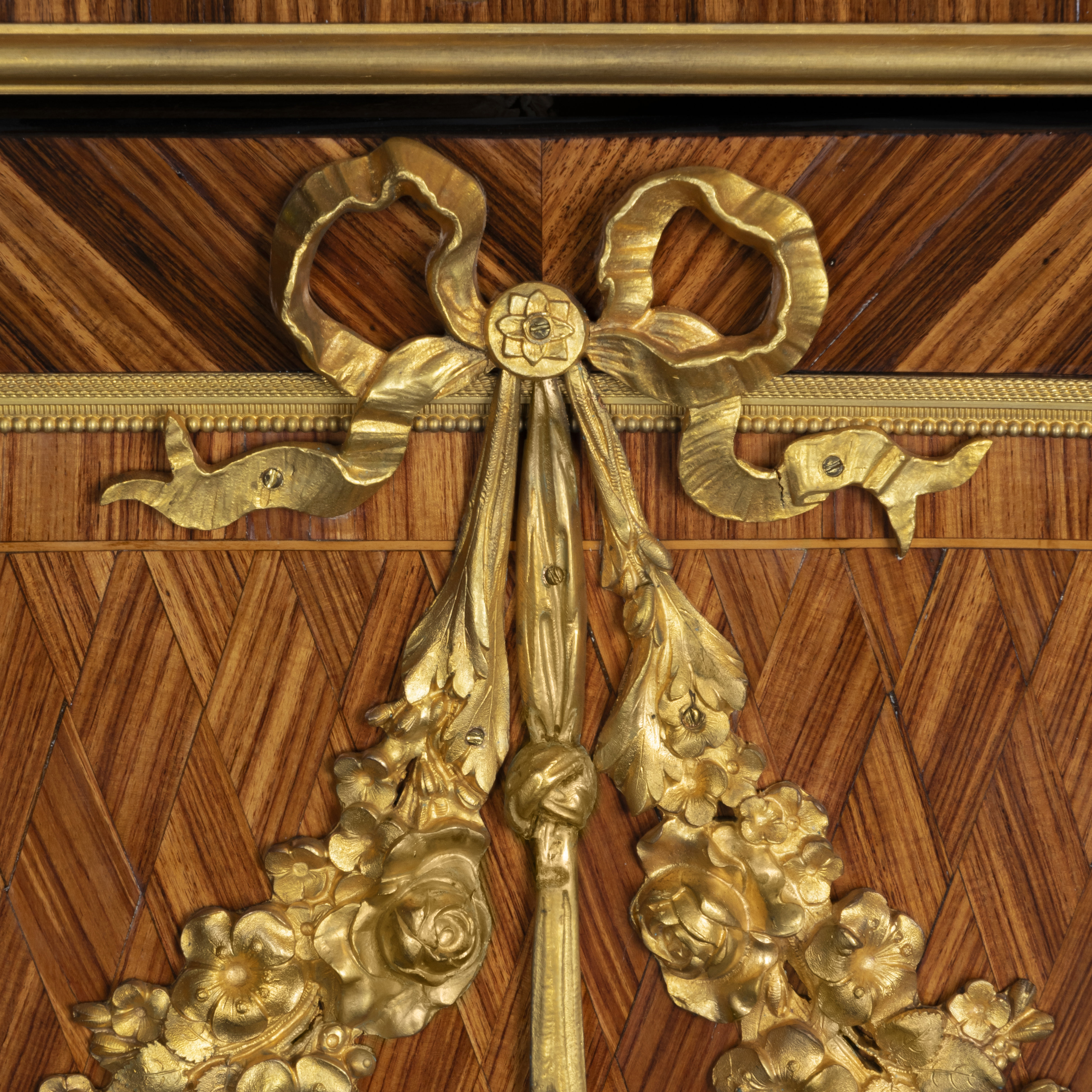 Красное дерево, кингвуд, паркетри, тюльпановое дерево, мрамор, стекло, бронза, золочение. Выполнена в манере Франсуа Линке (1855-1946). На замочной пластине клеймо Duvivier/77, St. Antoine/Paris, circ". Размер 158х144х42,5 см.