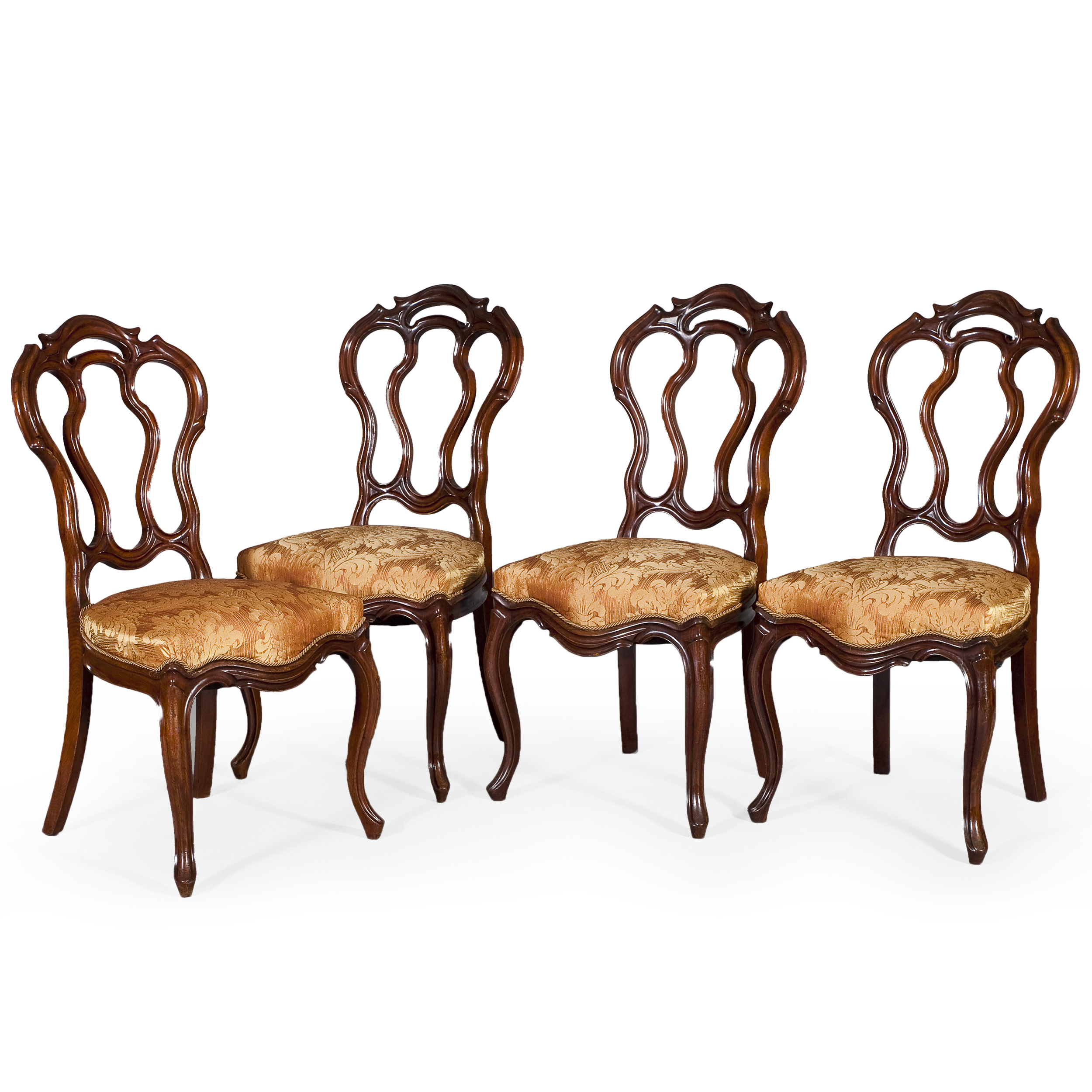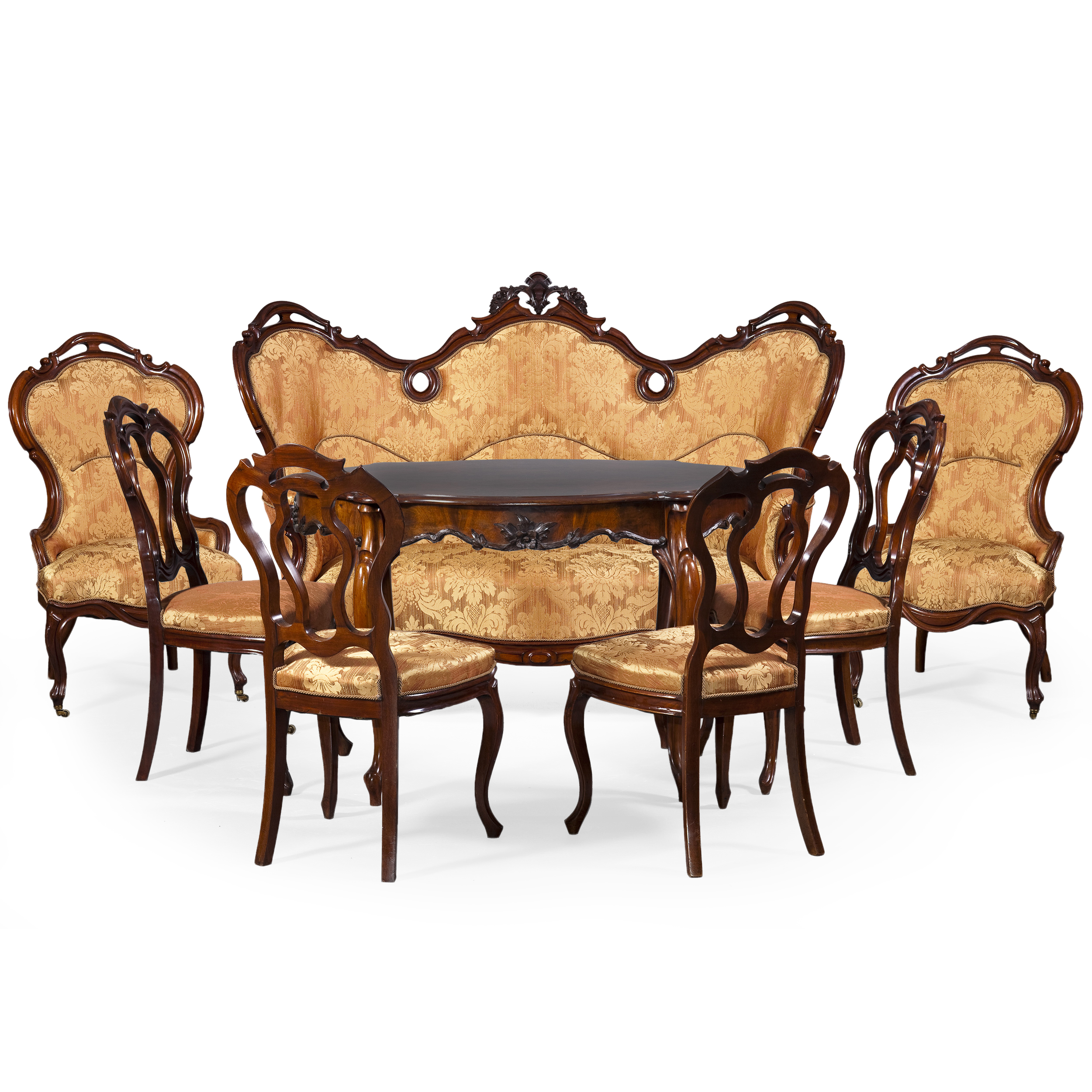 Каркасы мебели изготовлены из благородной породы дерева - ореха, покрытого светлой, тёплой тонировкой, подчёркивающей природный рисунок древесины. Искусная ручная резьба выполнена с безупречным вниманием к деталям — каждый завиток, каждый растительный мотив проработан с особым вкусом, в духе лучших французских традиций. Диван, центральный элемент гарнитура, притягивает внимание своей широкой, изогнутой спинкой, плавно переходящей в подлокотники, украшенные асимметричными завитками и листами аканта. Ножки в форме «кабриоль» дополнены стилизованными резными раковинами — характерным символом рококо. Мягкое сиденье обито тканью с богатым тиснёным узором в сложном оттенке золотистой охры в духе эпохи. Кресла повторяют силуэт дивана в миниатюре, но отличаются особой изысканностью в деталях: слегка зауженные спинки придают конструкции лёгкость, а скруглённые подлокотники поддерживают общую плавность линий. Подобные кресла традиционно именовались bergères и были популярны в гостиных и салонах французских дворян конца XVIII века. Стулья с высокими, резными спинками и изогнутыми ножками словно продолжают тему утончённости, подчеркивая симметрию и единство ансамбля. На спинках прослеживаются мотивы раковин, цветочных гирлянд и рокайльных завитков. Форма стола гармонично повторяет изгибы остальной мебели. Края закруглены, стол имеет форму вытянутого овала, по периметру украшен резными флоральными узорами.