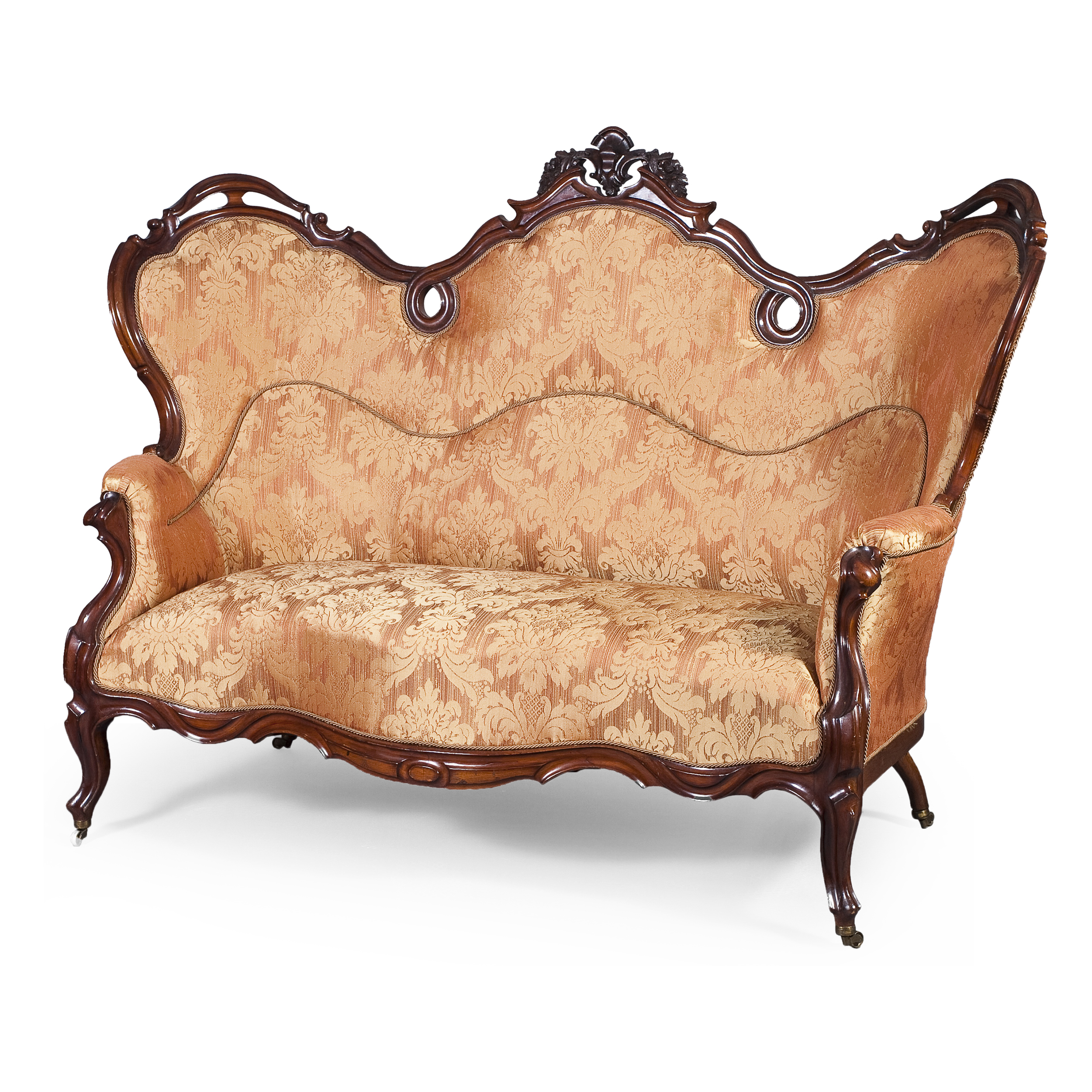 Мебельный гарнитур в стиле рококо — истинное воплощение элегантности, декоративного изящества и высокой школы резной мебели. Этот уникальный комплект, датируемый второй половиной XIX века, был создан мастерами, вдохновлёнными утончёнными формами и эстетикой французского рококо XVIII века, и в полной мере отражает дух неорокайльного возрождения. Каждый предмет представленного гарнитура выдержан в едином художественном ключе и представляет собой образец декоративного искусства с тончайшими резными элементами, плавными линиями и изогнутыми контурами, характерными для подлинного рокайльного орнамента.