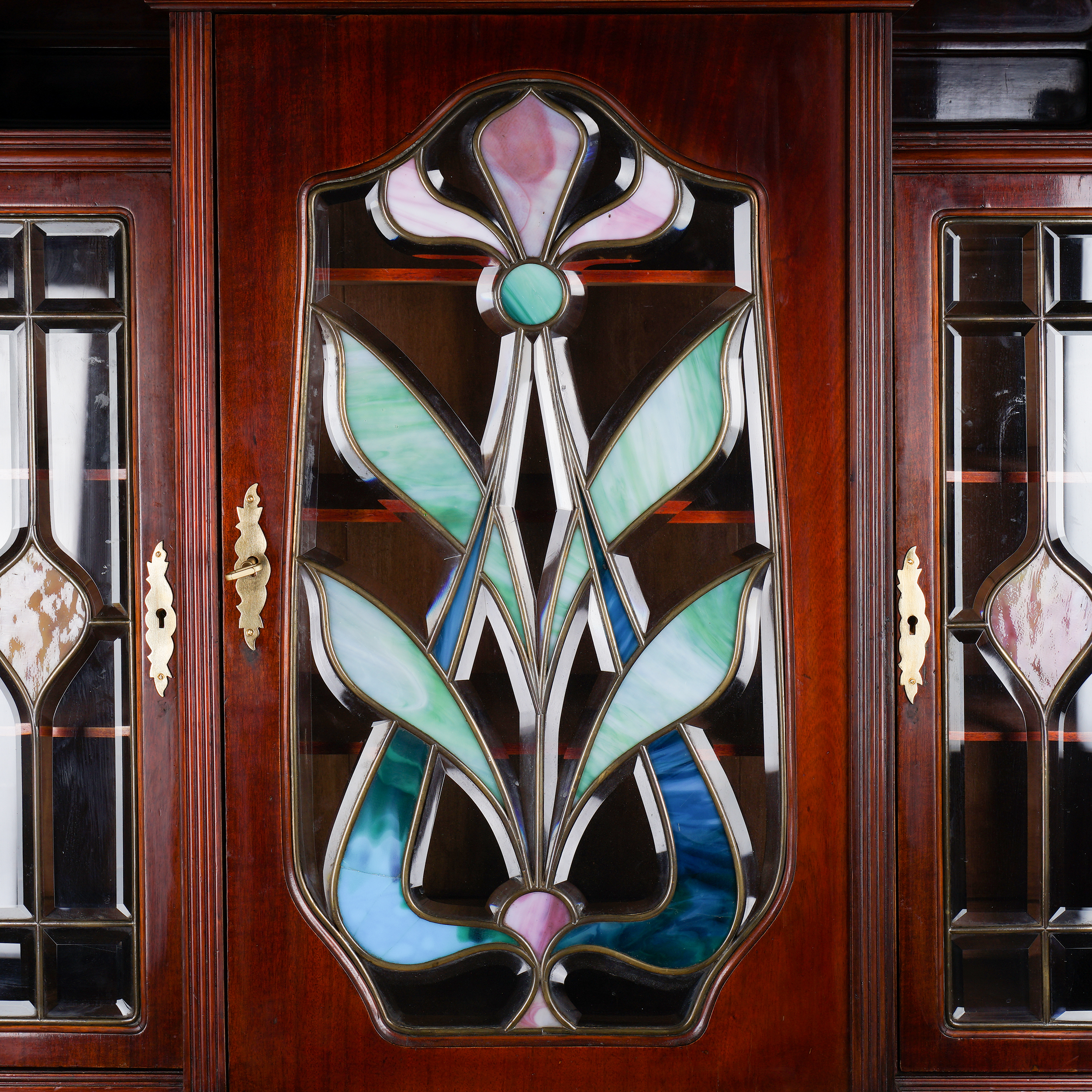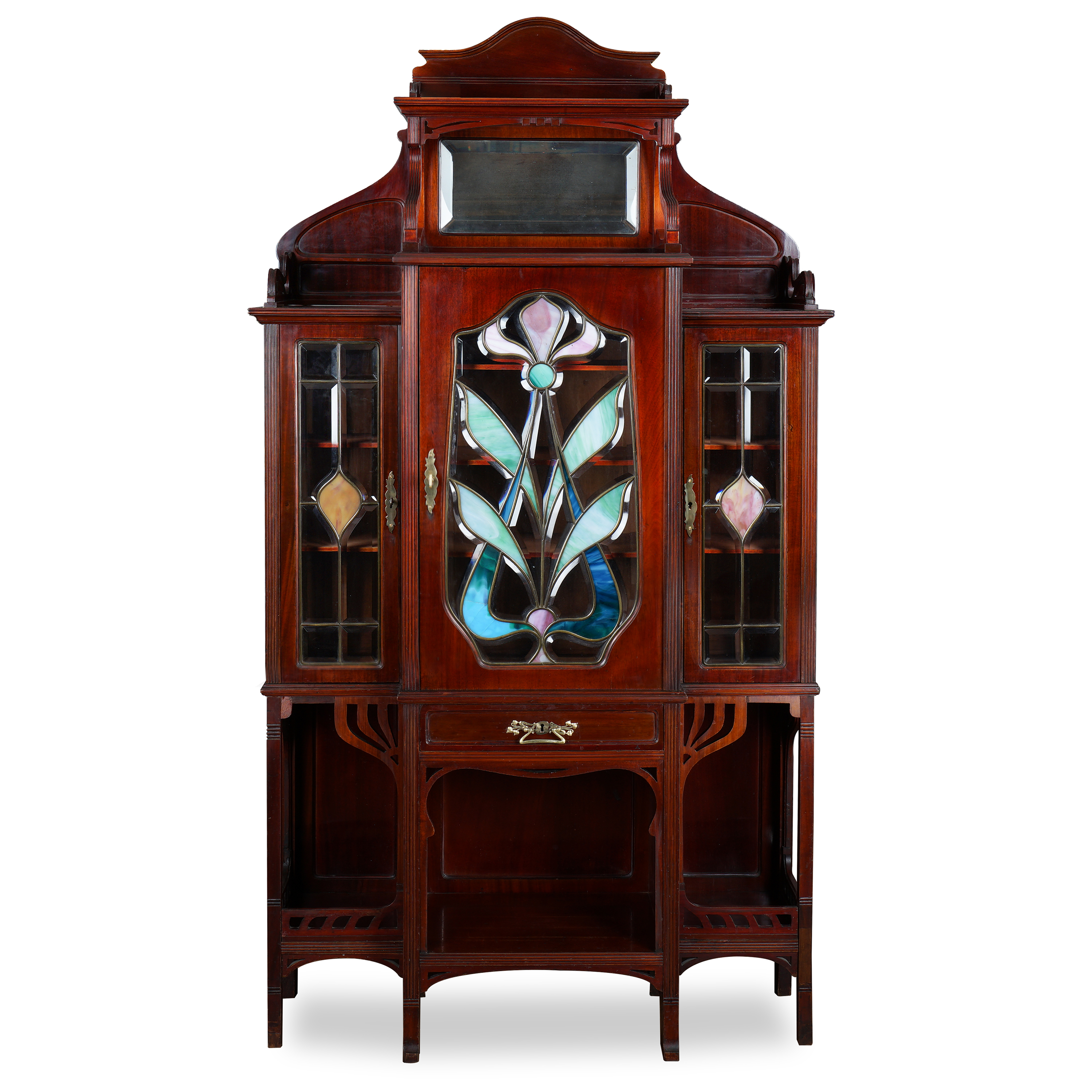 Красное дерево (фанеровка), хвойные породы (основа), резьба, прозрачное и цветное фацетное стекло, зеркальное стекло, бронза