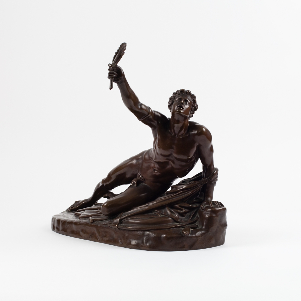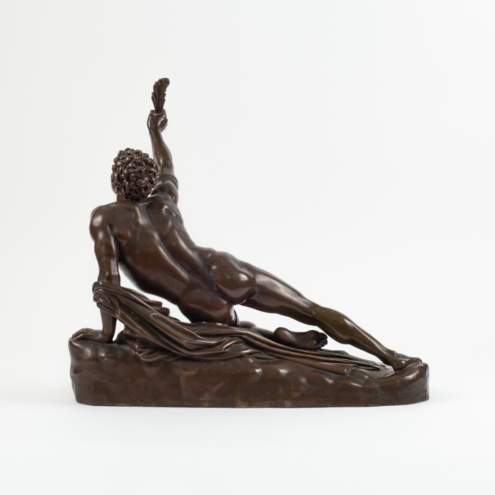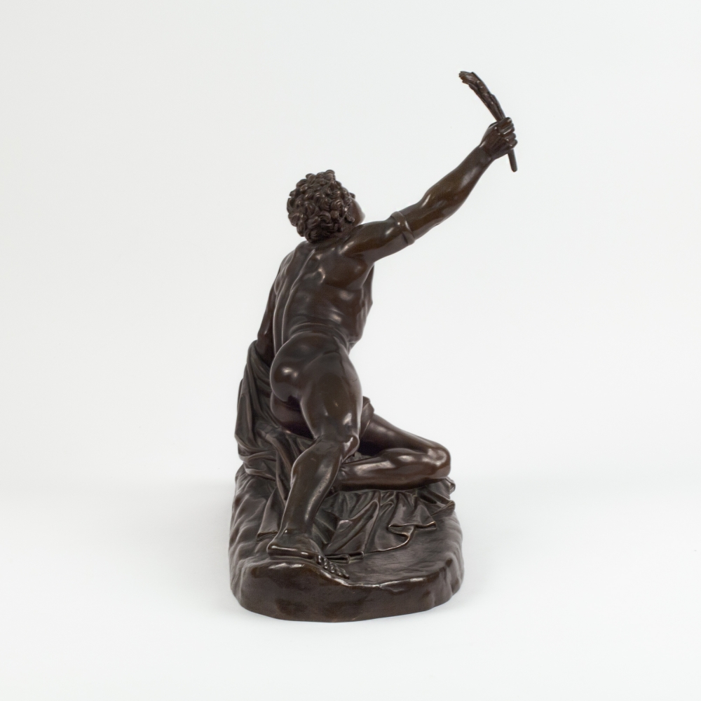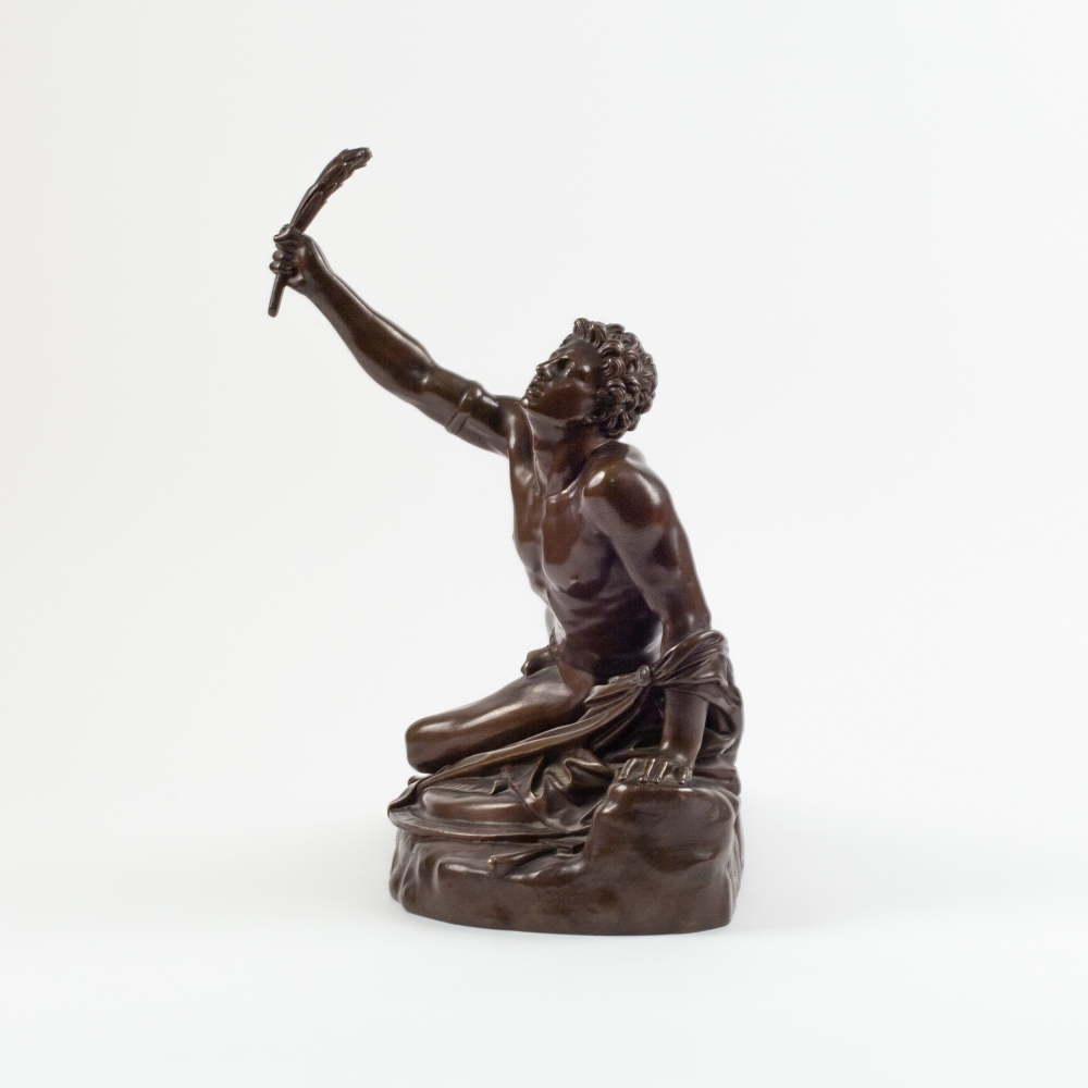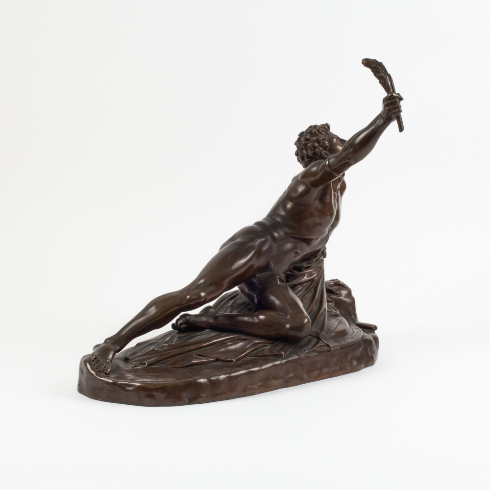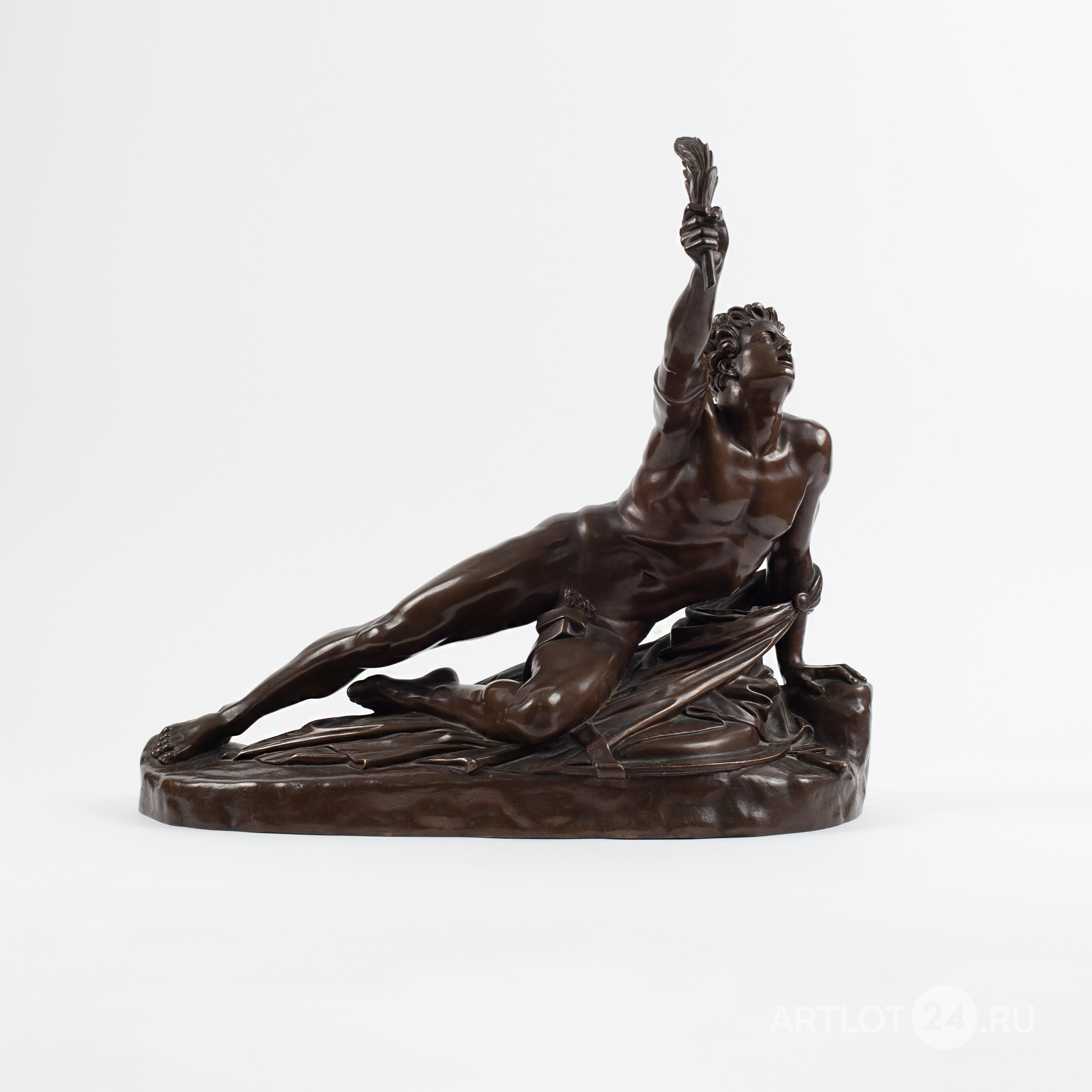 Выполнена по модели французского скульптора Жан-Пьера Корто (Jean-Pierre Cortot, 1787-1843 Paris). Оригинальное название «Марафонский солдат, возвещающий о Победе». Бронза, литье, патинирование, клейма: фабрики «F. Barbedienne Fondeur», круглое «Reduction mecanique. A.Collas», Франция, 1900-1930-е годы, размер: 42 х 37 см