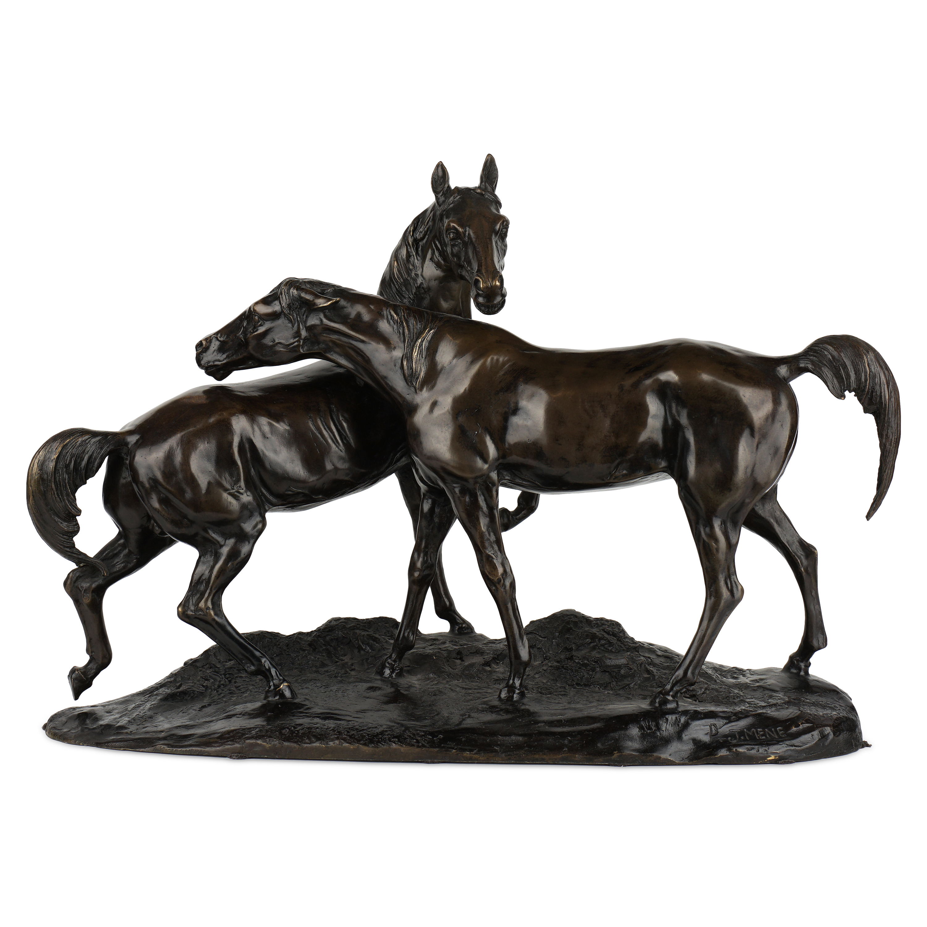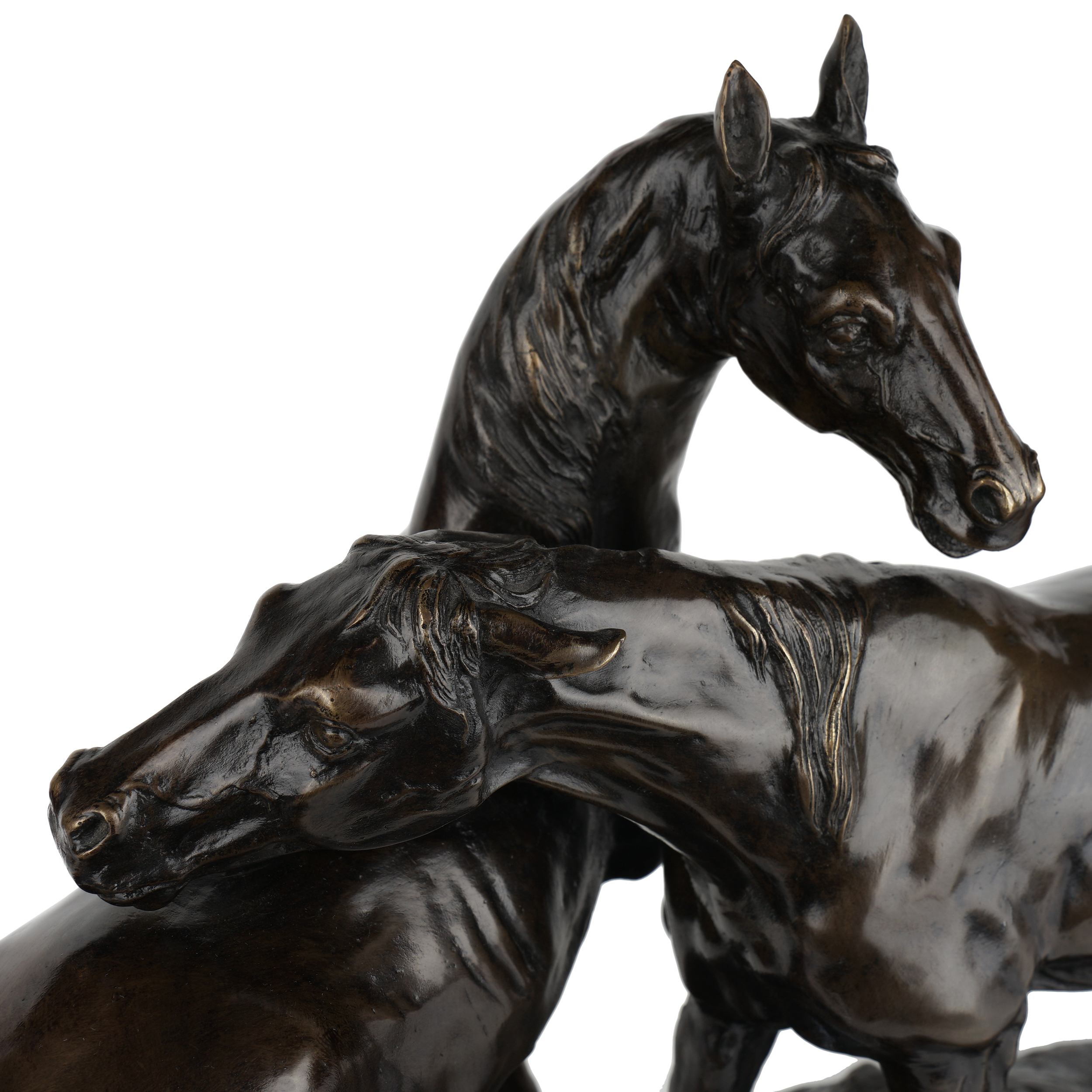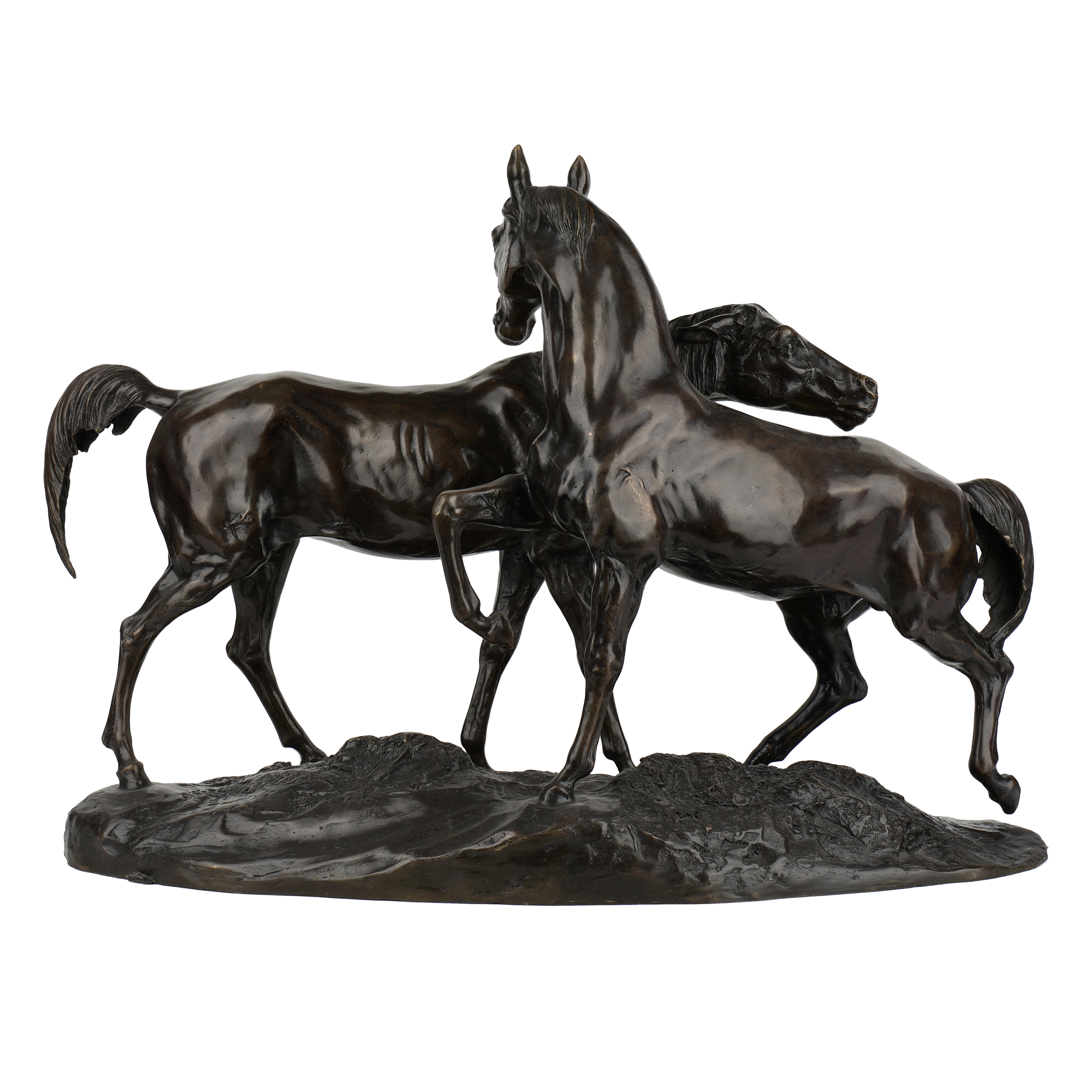 Выполнена по модели французского скульптора Пьера Жюля Мене (Pierre-Jules Mеne, 1810-1871). Бронза, литье, чеканка, патинирование, в основании факсимиле подписи скульптора: «P.J. Mene», размер (в/ш/г): 40 х 56 х 24 см.