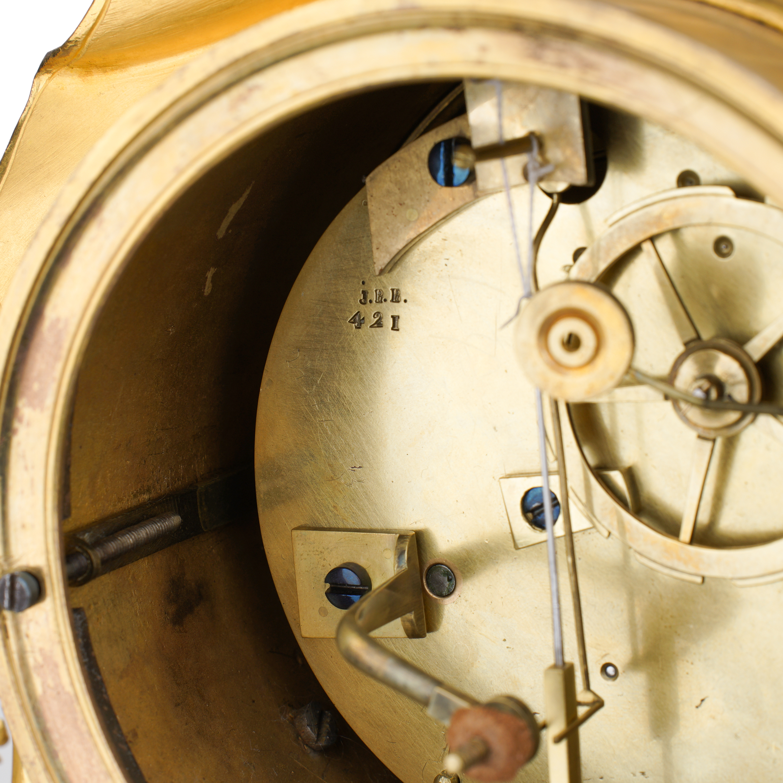 Бронза, литье, чеканка, золочение, белый эмалевый циферблат с римскими цифрами и делениями на минуты, стальные вороненые стрелки, размер (в/ш/г): 46,5 х 37,5 х 14 см.