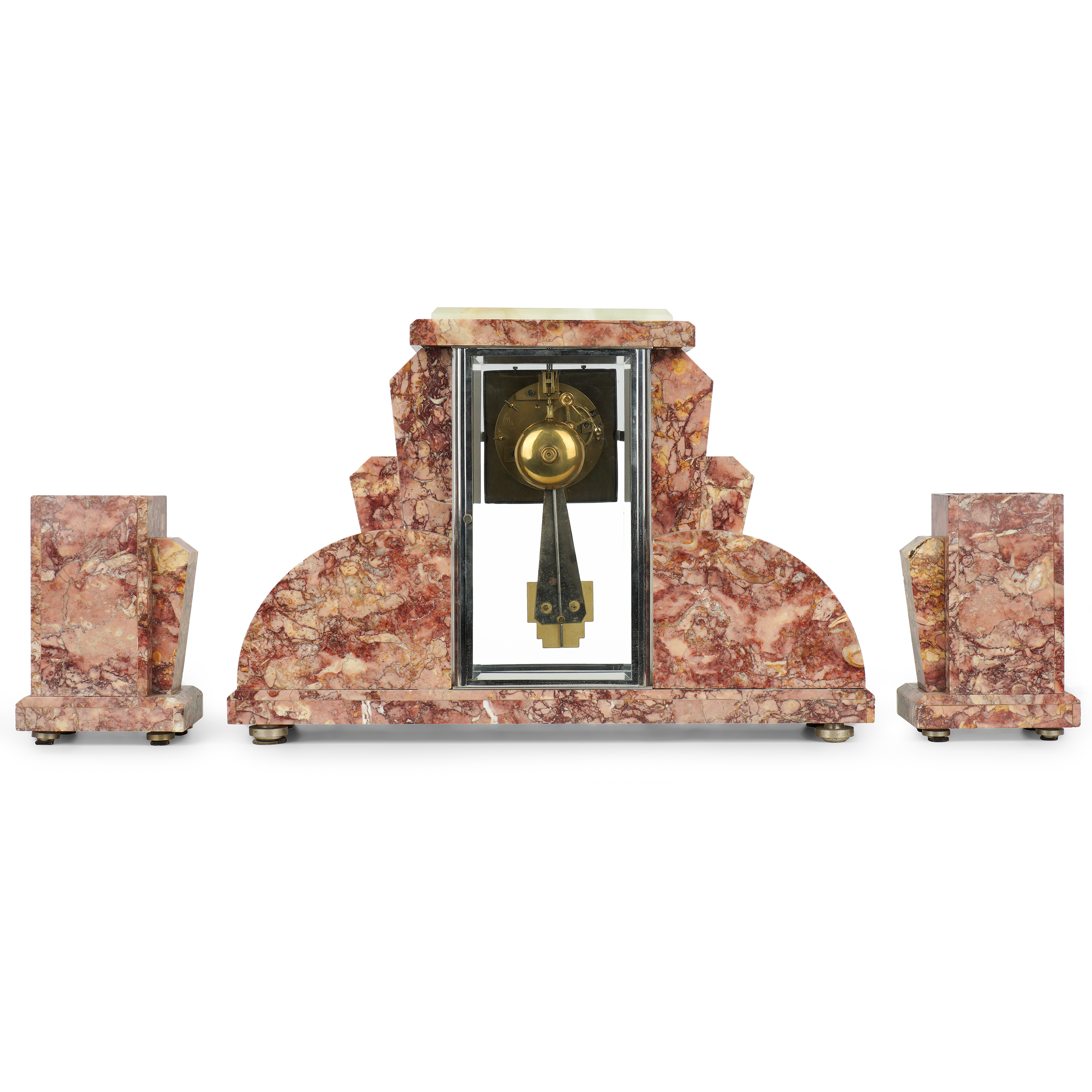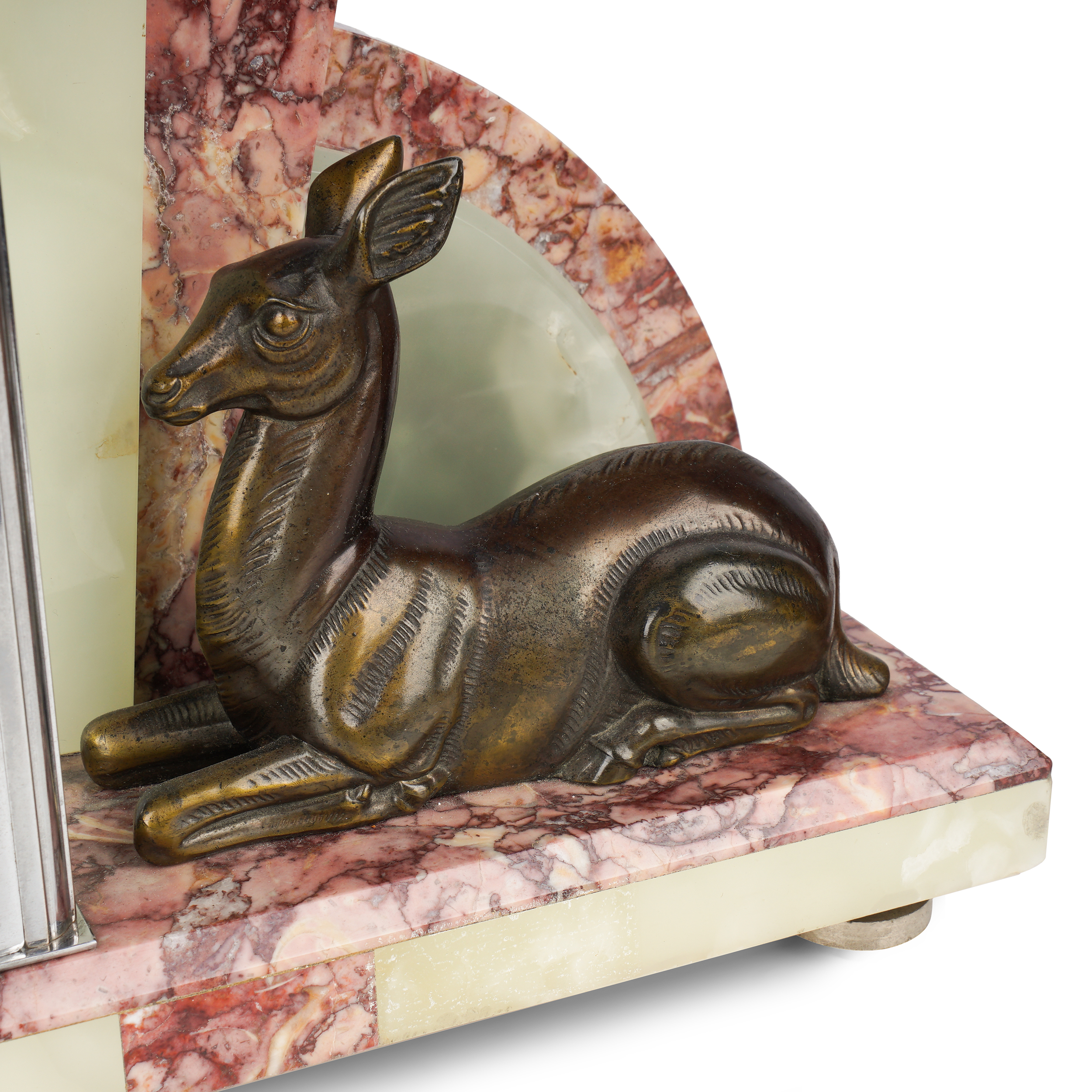 Мрамор и оникс, бронза, литье, прочеканка, патинирование, металл, стекло, на циферблате «Lecocqs Amiens», Европа, Франция (?), 1930-е годы, размер (в/ш/г): часы - 32 х 48 х 10 см, вазы - 19 х 12,5 х 9 см