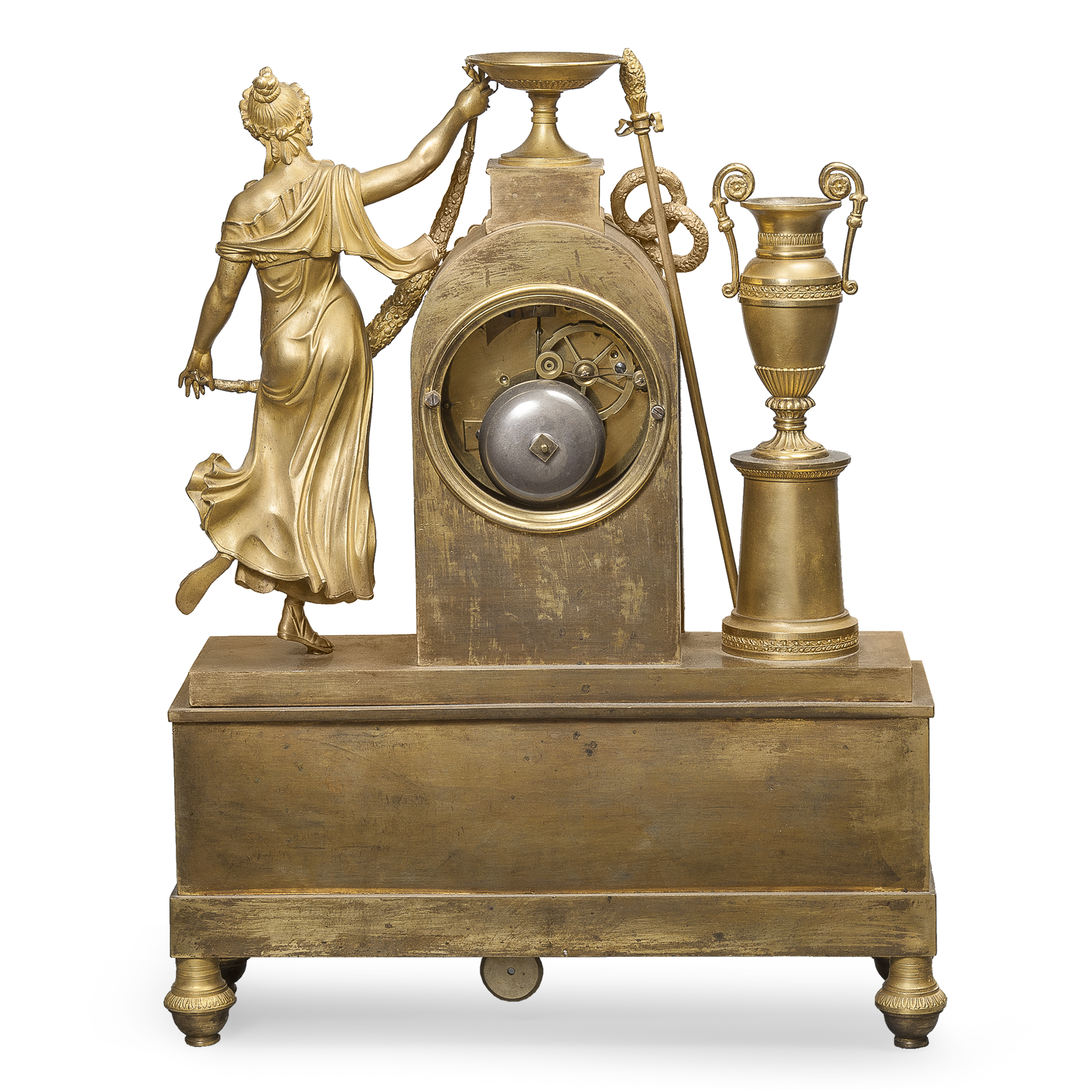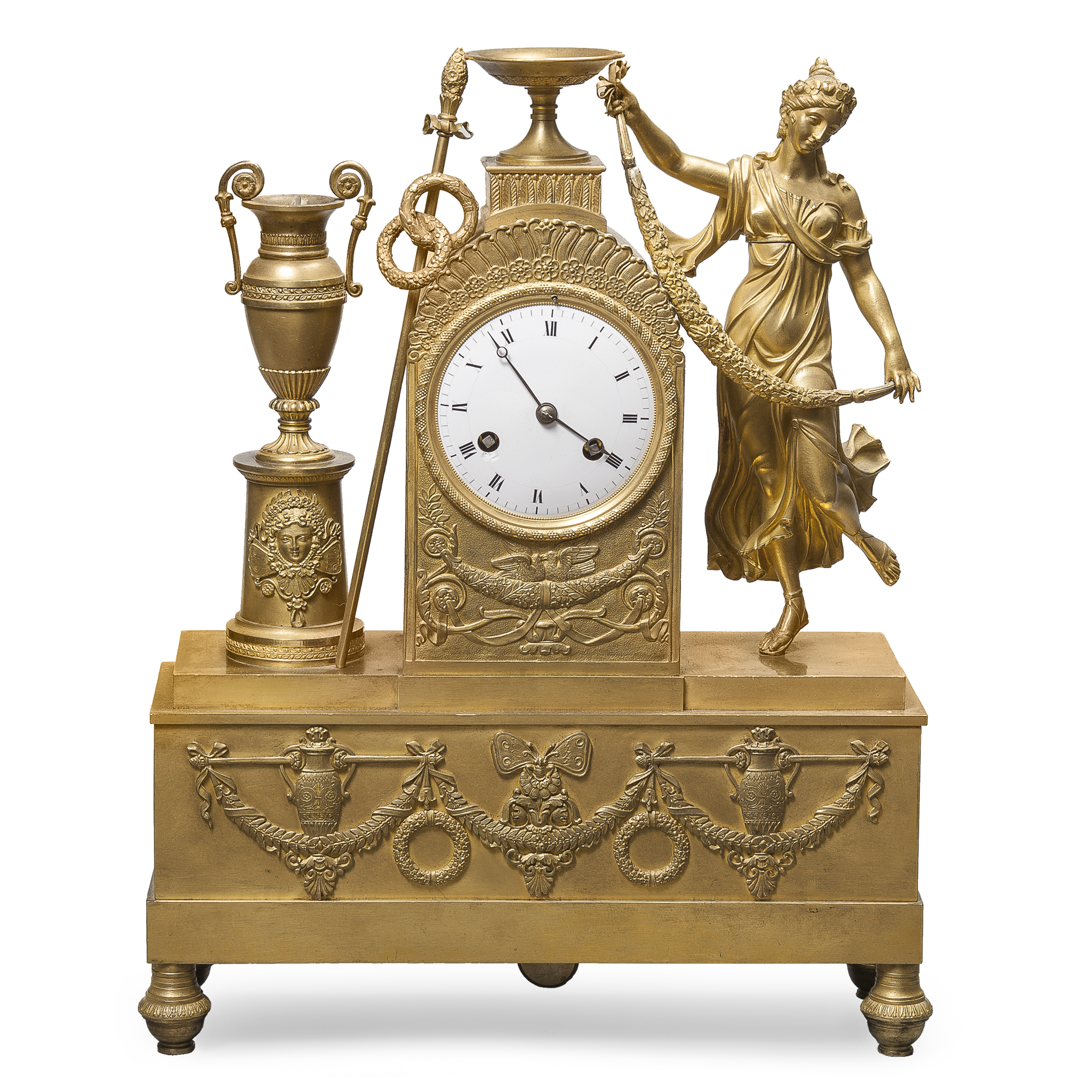 Бронза, литье, чеканка, золочение, белый эмалевый циферблат с чёрными римскими цифрами на часовых метках, стальные вороненые стрелки, размер (в/ш/г): 37 х 30 х 9 см