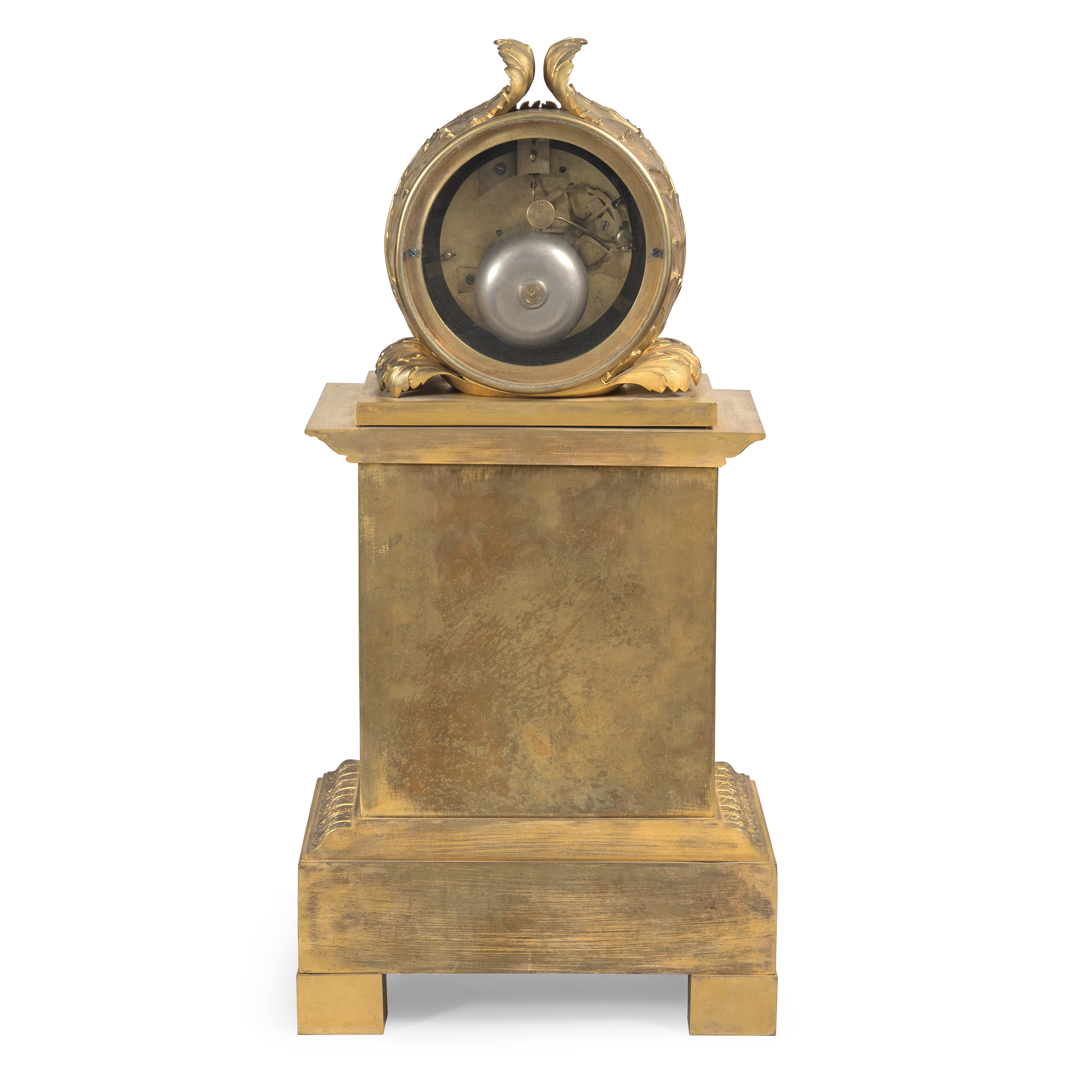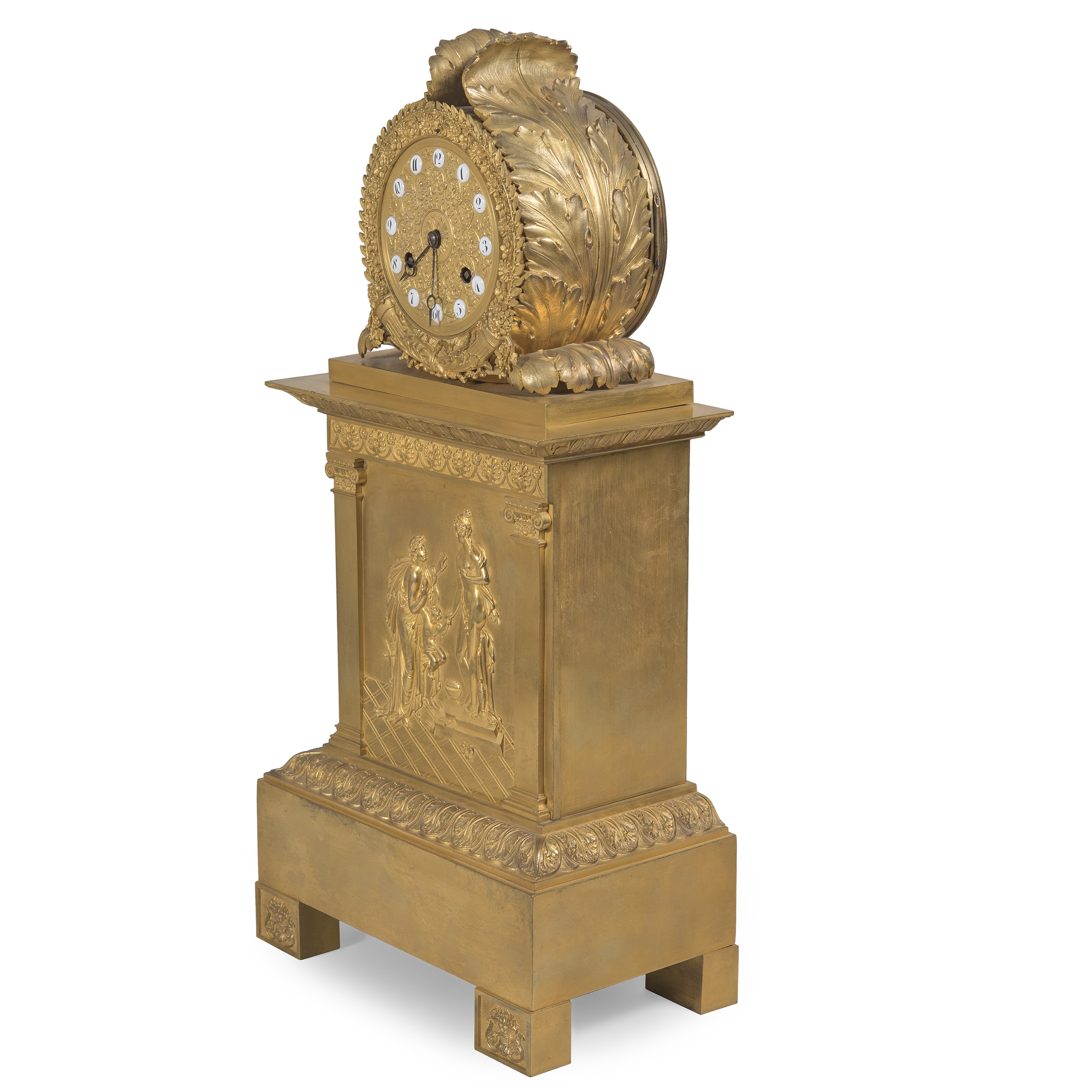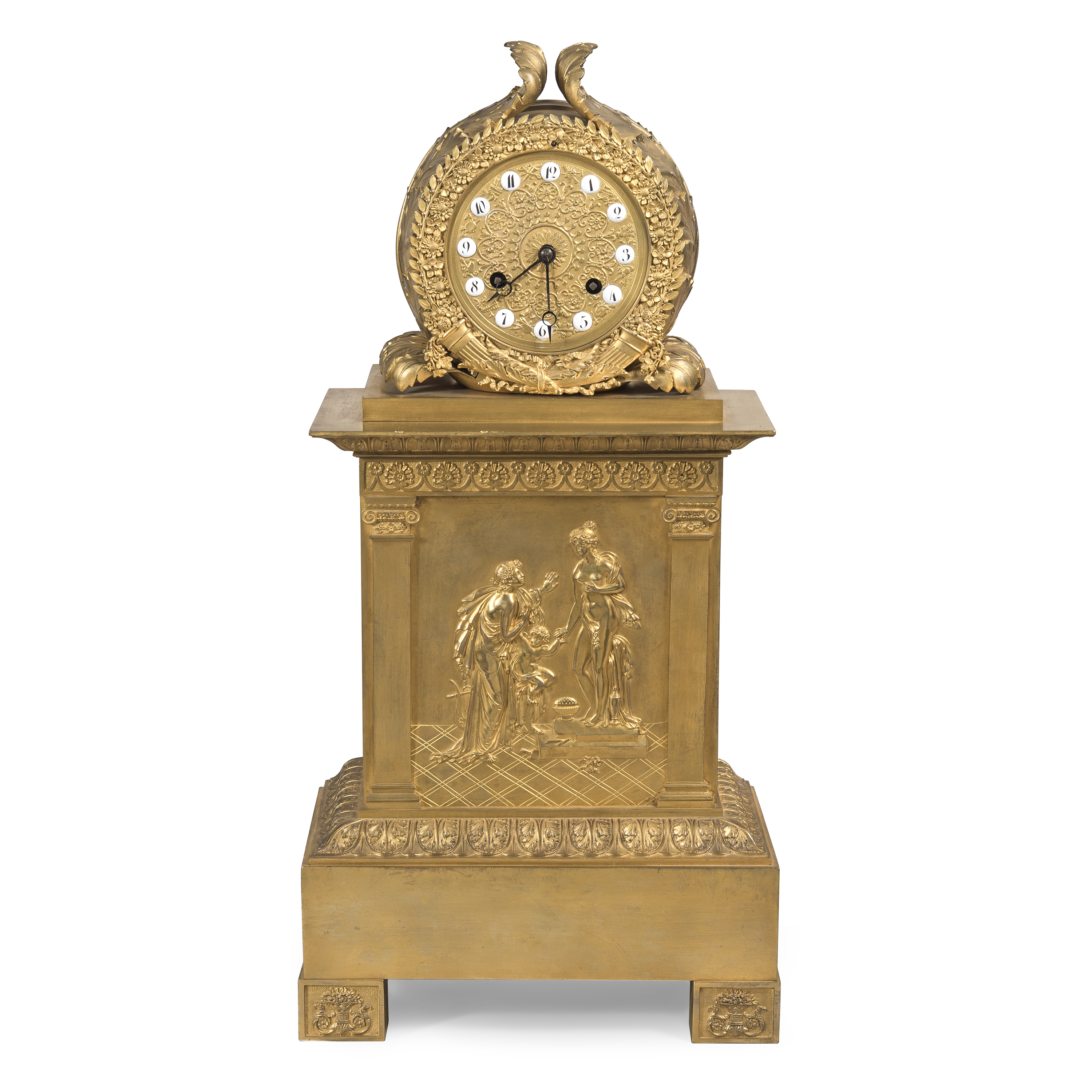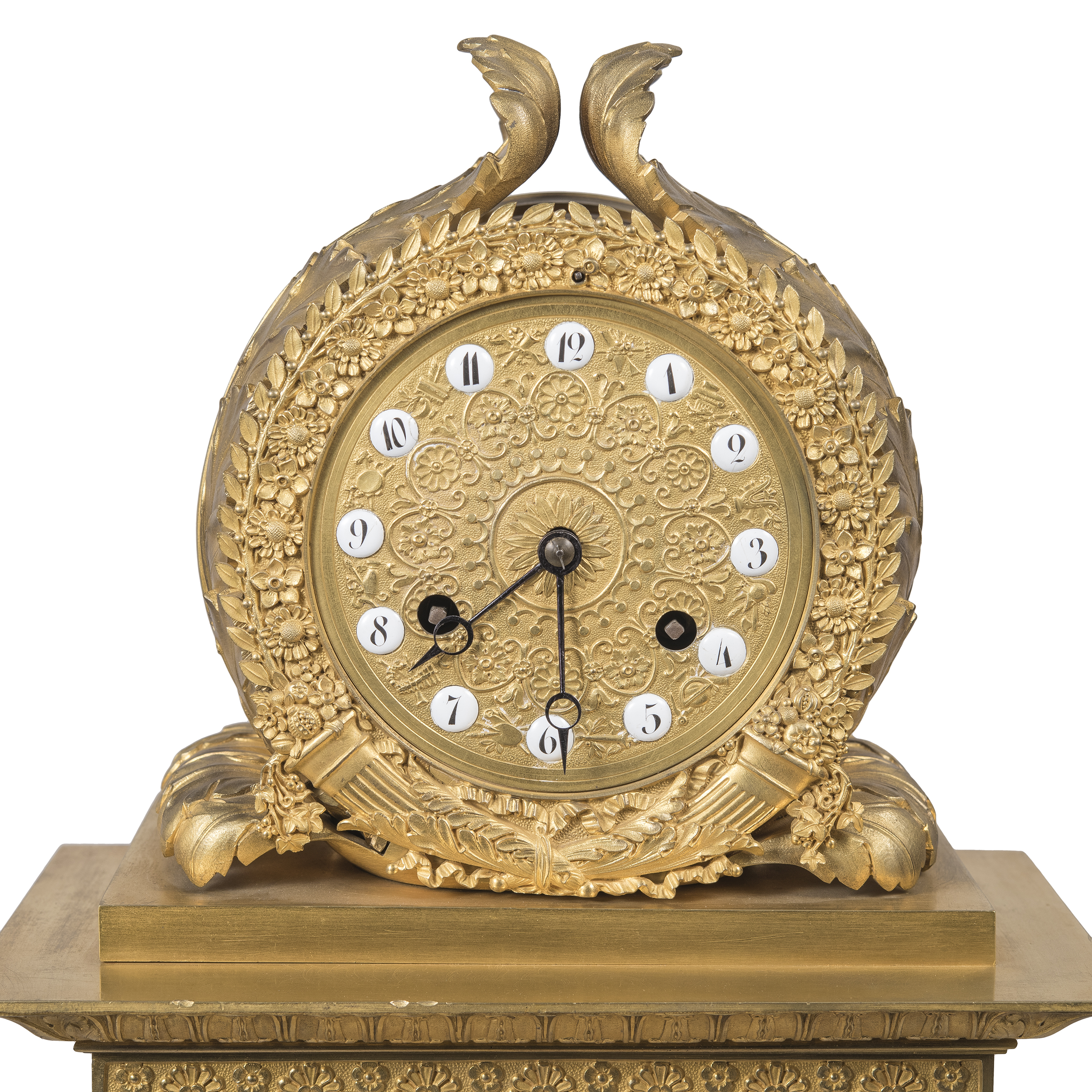 Бронза, литье, чеканка, золочение; циферблат золоченой бронзы с вкладными белыми эмалевыми вставками с арабскими цифрами, нанесёнными черной эмалью, оформлен рельефным цветочным венком и скрещенными рогами изобилия; стальные вороненые стрелки простой формы, Франция, 1820-е годы, эпоха французской Реставрации. Размер (в/ш/г):
