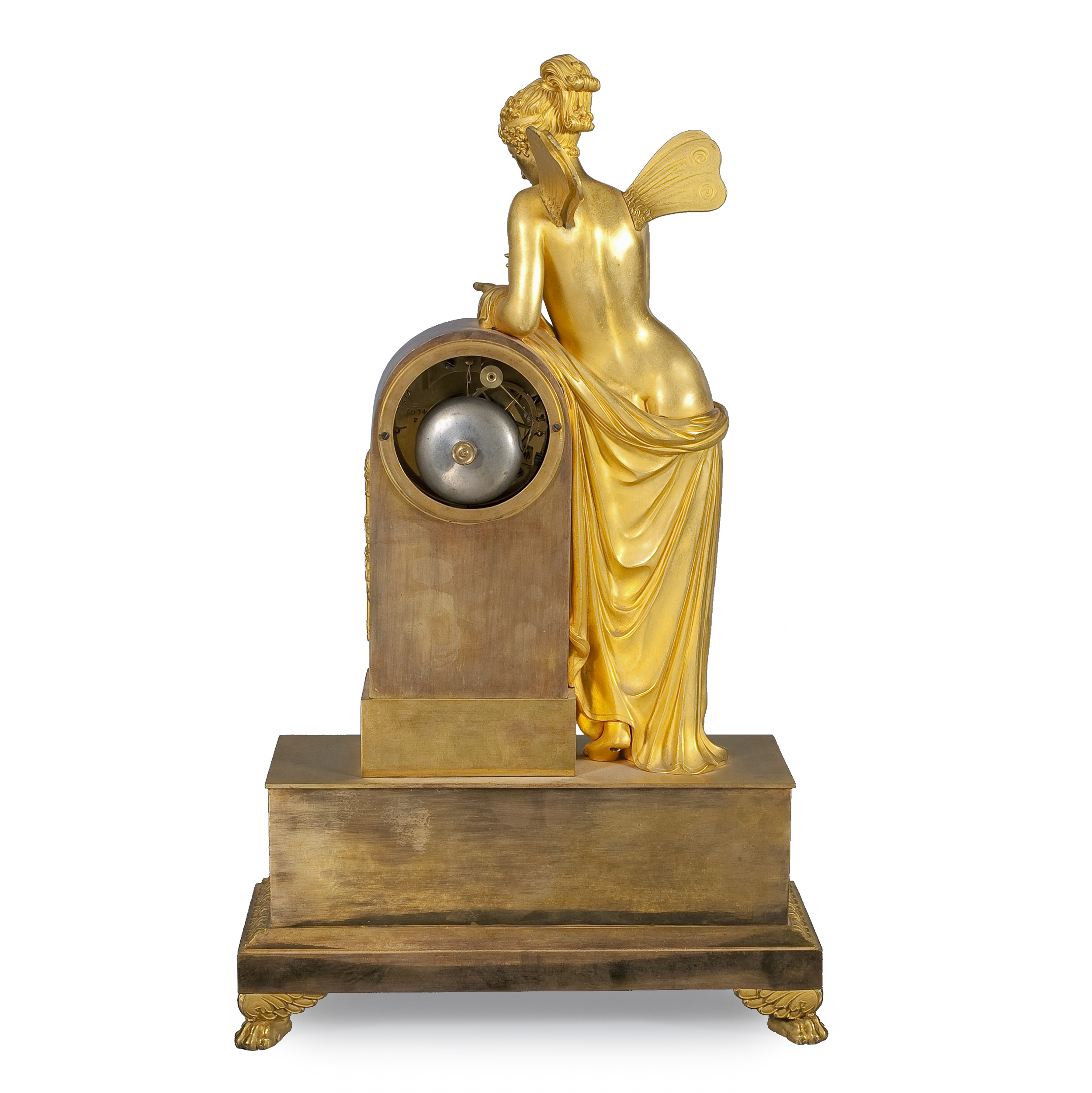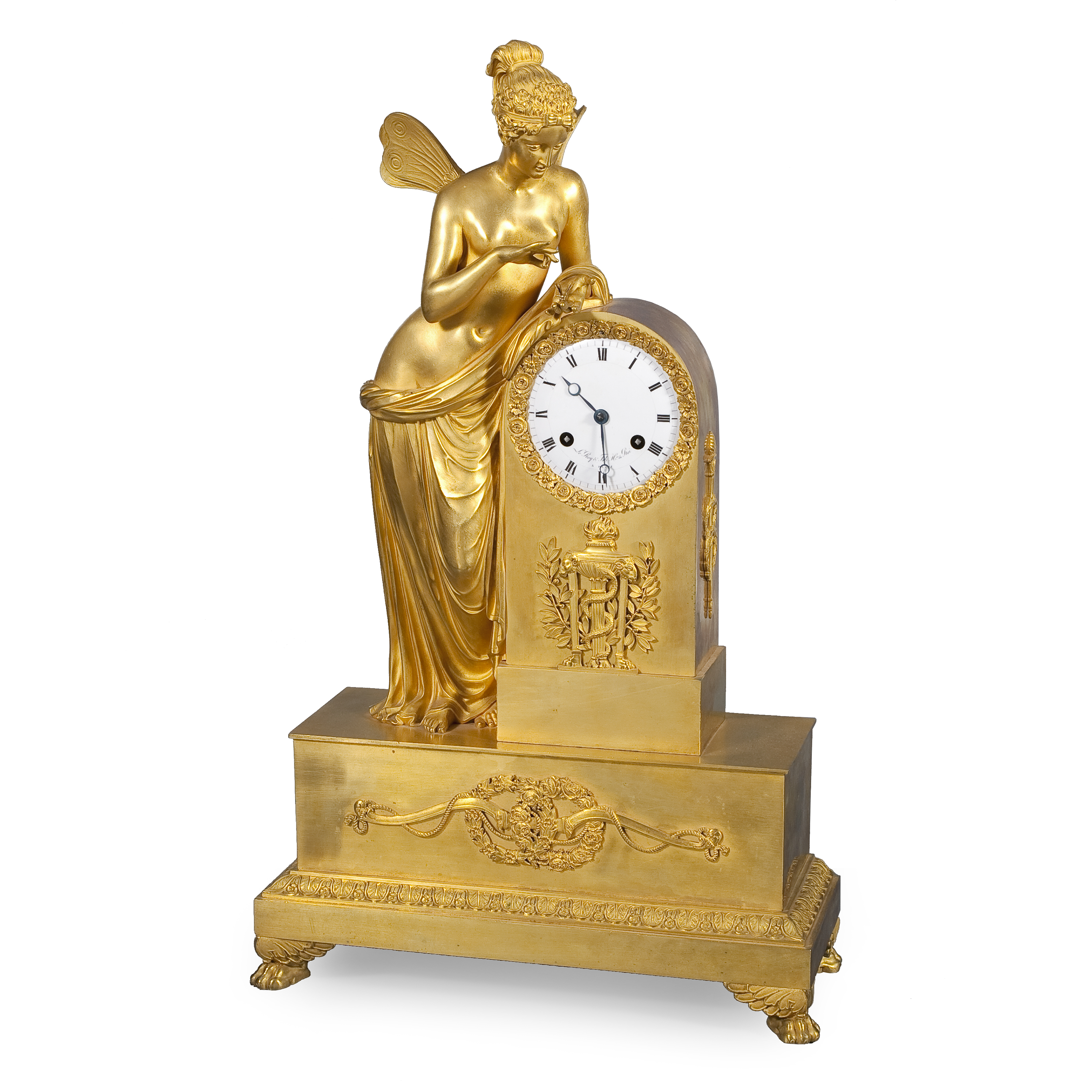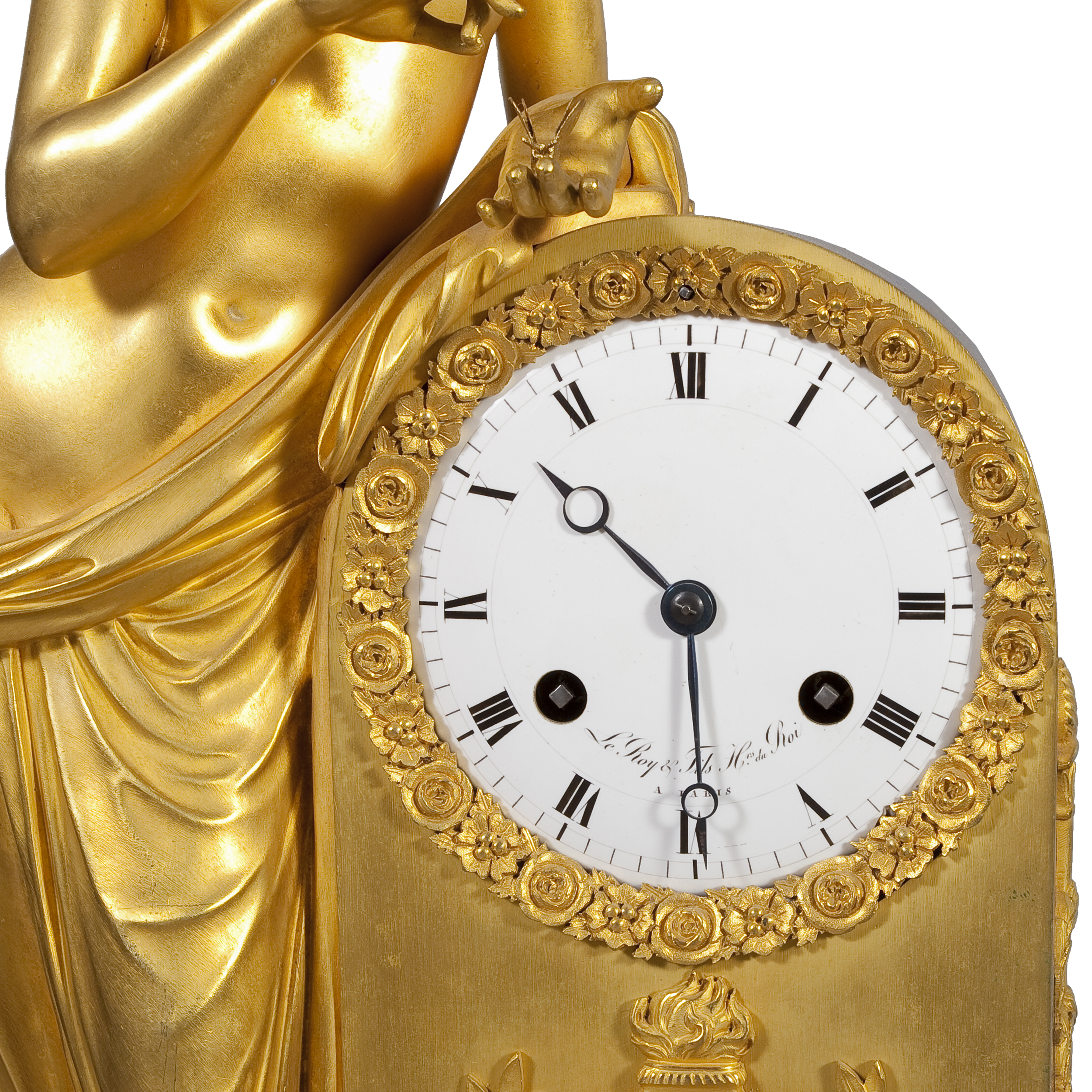 Бронза, литье, чеканка, золочение ормулю (d`ormoulu), эмалевый циферблат с римскими цифрами часов и делением на минуты, стальные вороненые стрелки, надпись на циферблате «Le Roy and Fils/Le Roy Hr du Roi / A Paris», Франция, начало XIX века, размер (в/ш/г): 55,3 х 34 х 13 см. Ключ и маятник в комплекте