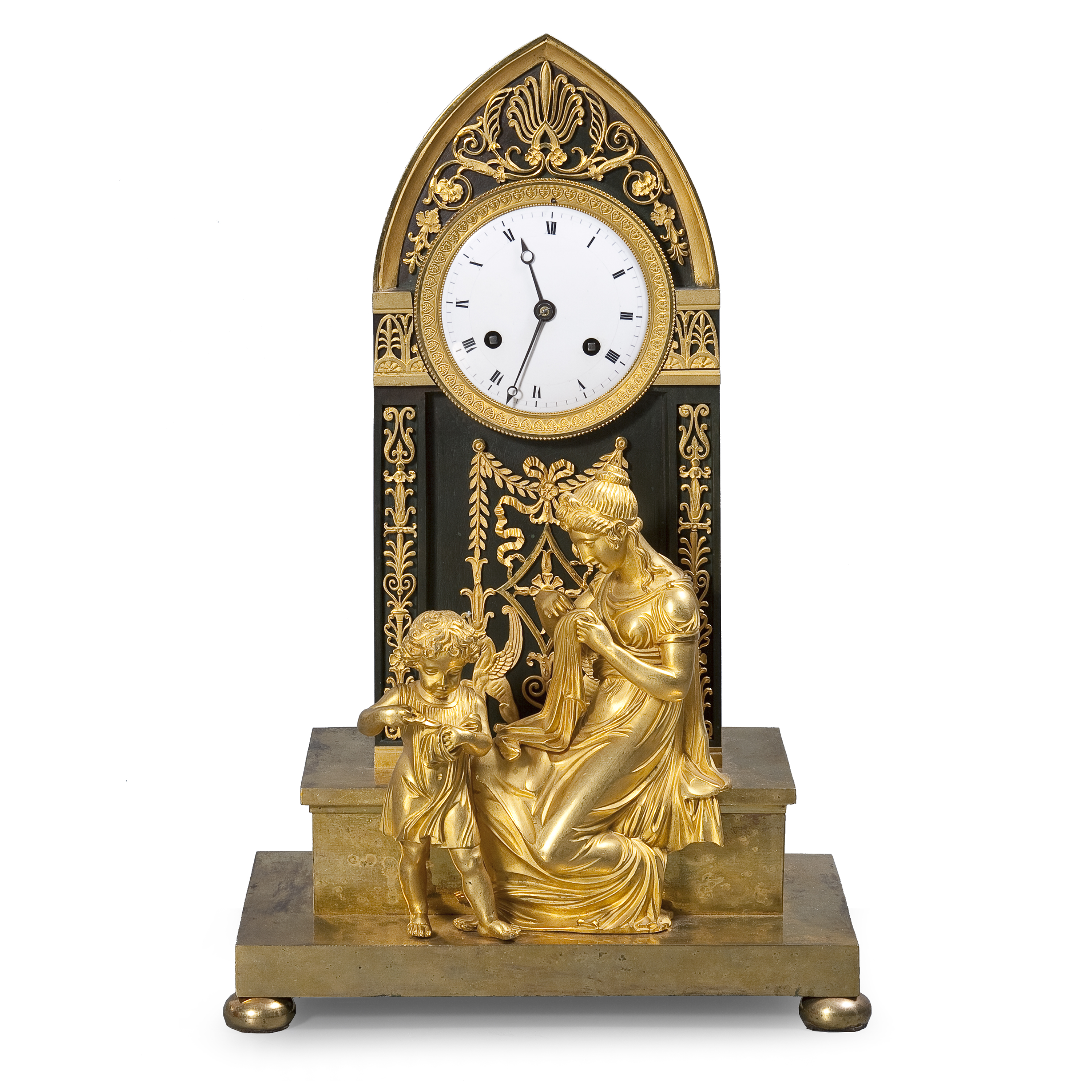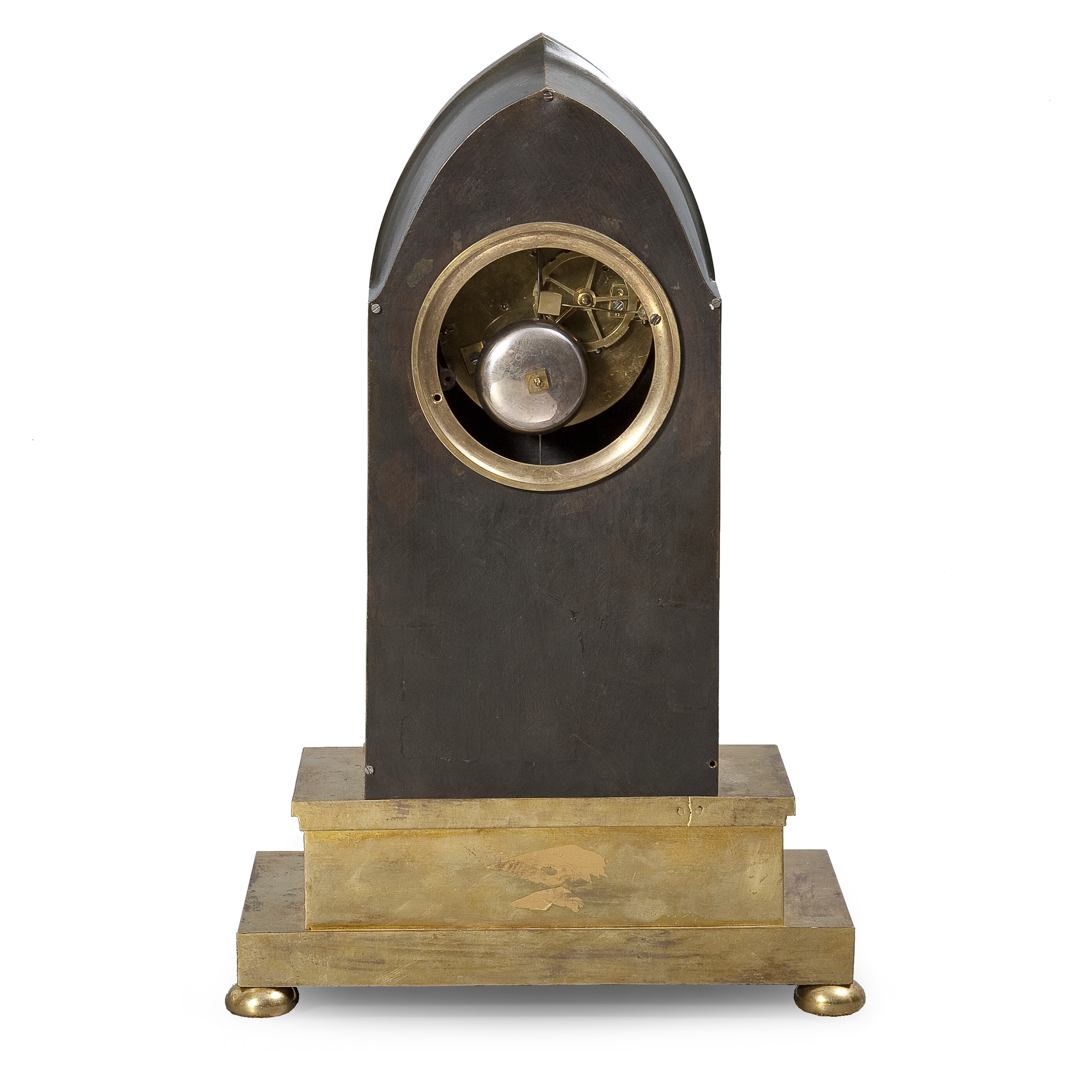 Корпус часов выполнен в виде арочного свода, украшенного накладными декоративными накладками в виде растительного орнамента. Бронза, литье, чеканка, золочение, чернение; эмалевый циферблат с римскими цифрами и делением на минуты, стальные вороненые стрелки; Париж, размер (в/ш/г): 43 х 29 х 18 см.