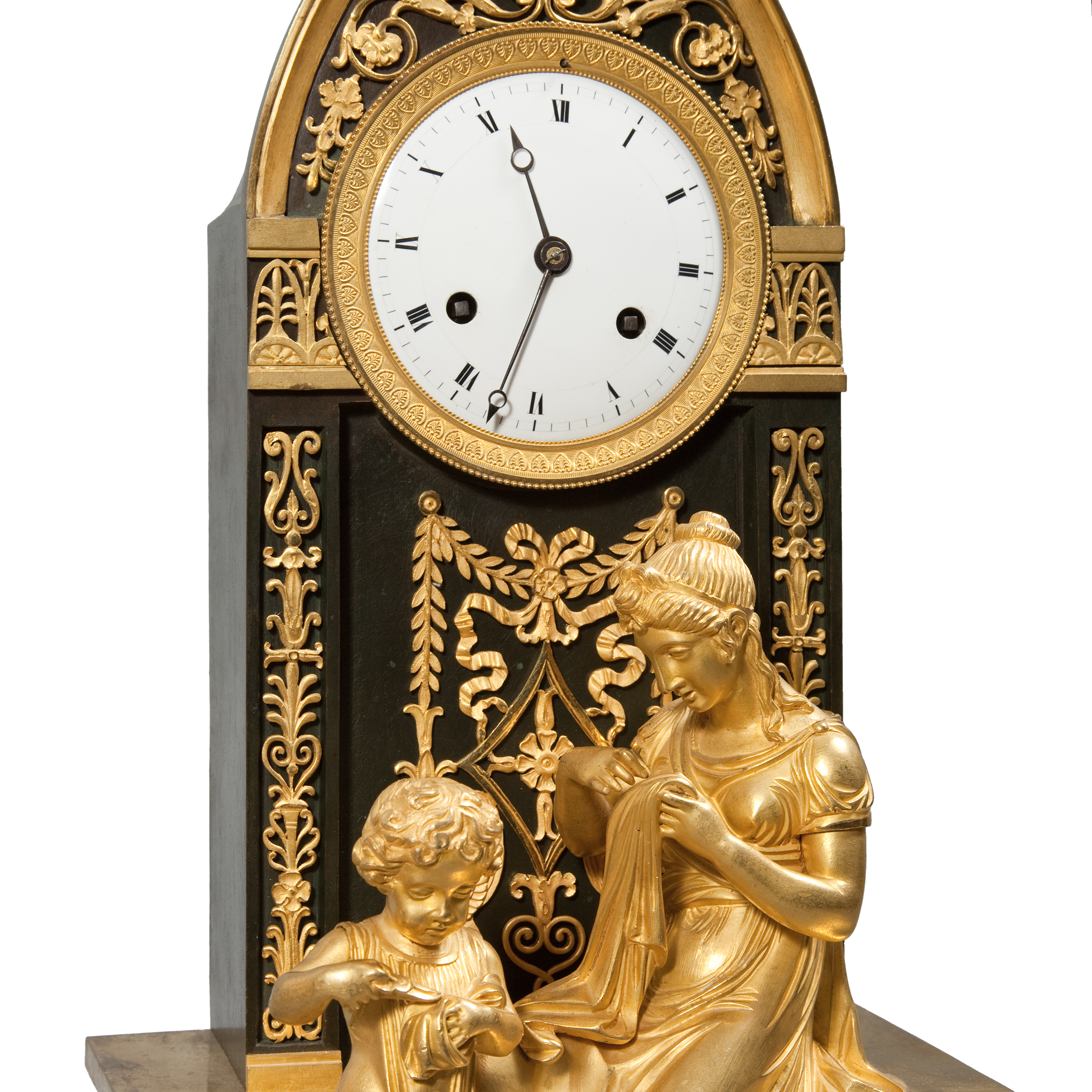 Каминные часы с фигурой женщины и ребенком, подлинный шедевр французского мастера. Это удивительный предмет декоративно-прикладного искусства с изящной художественной композицией.