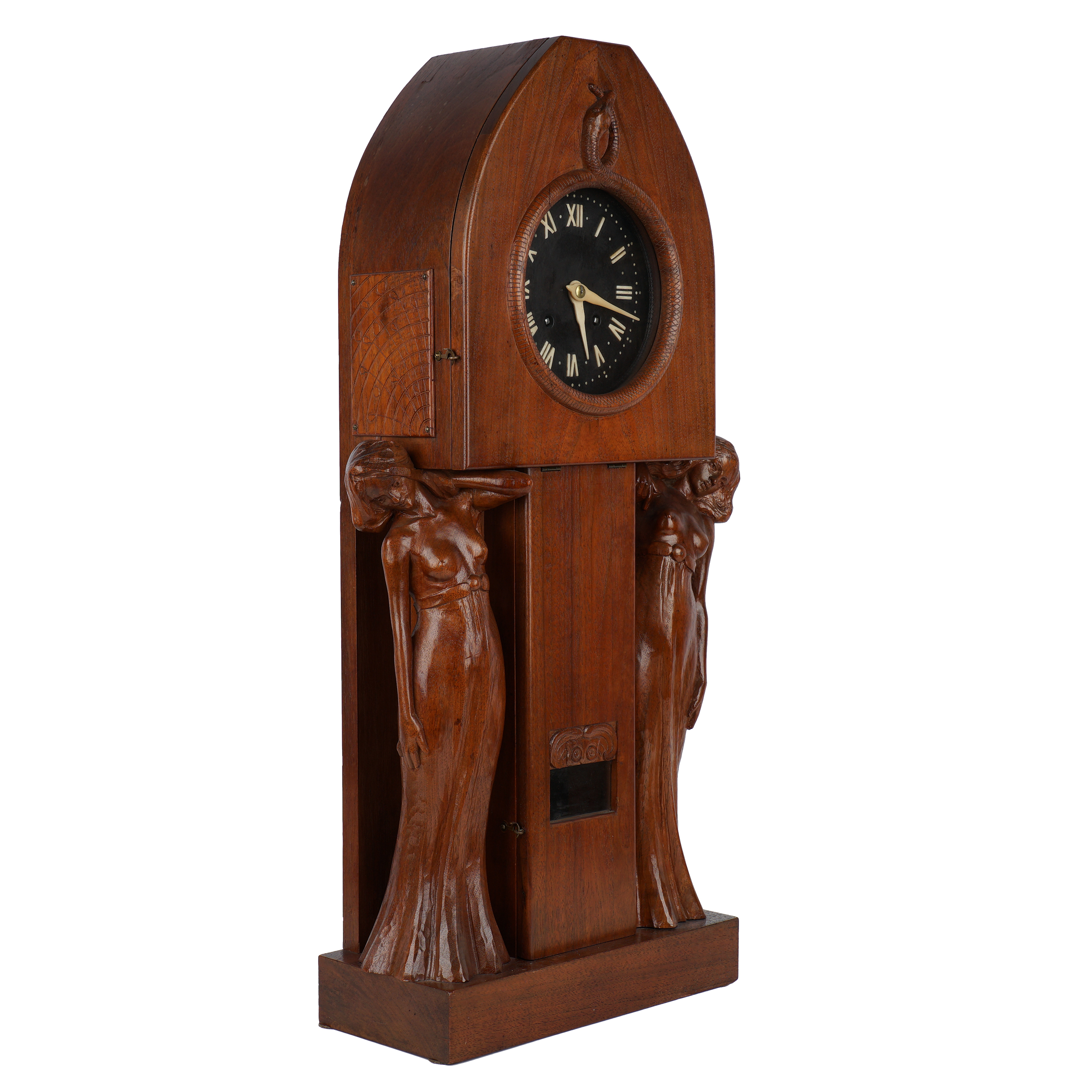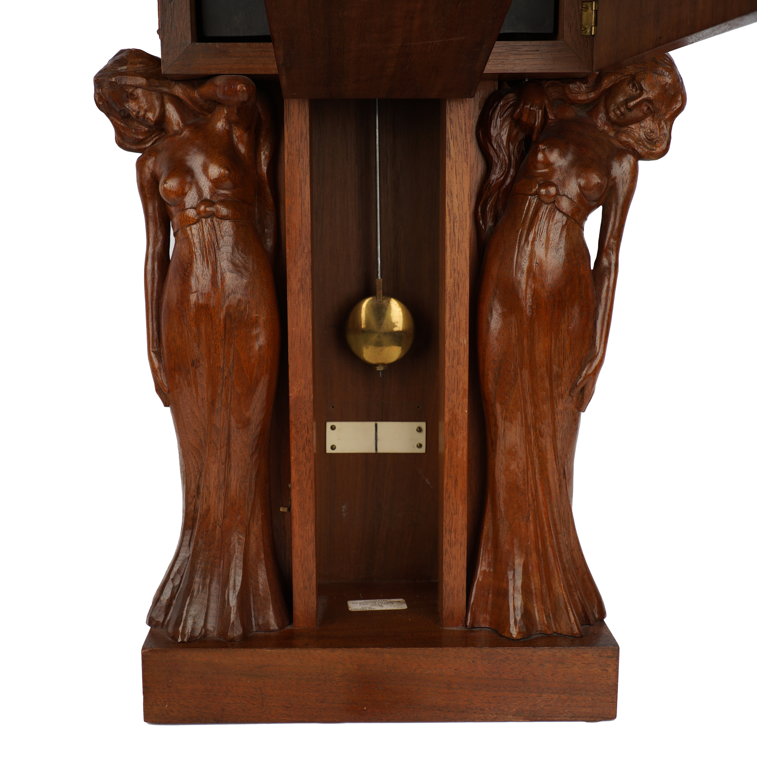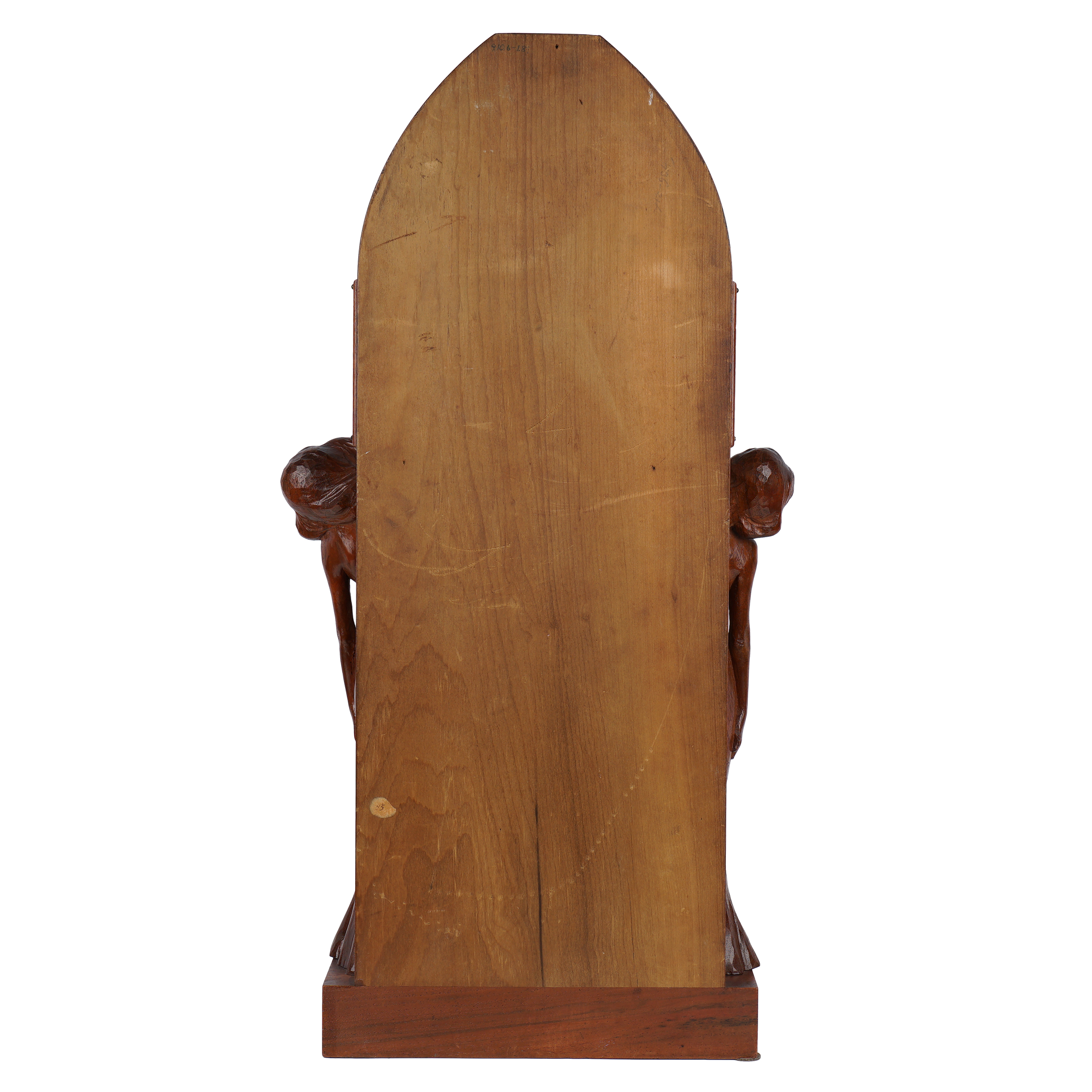 Красное дерева, резьба, часовой мастер - Густав Беккер (Gustav Becker), подпись «FRIEDLBURG 1904», черный циферблат с римскими цифрами часов и делением на минуты, Германия, Фридебург, начало ХХ века, размер (в/ш/г): 70 х 29,5 х 14 см. Ключ и маятник в комплекте