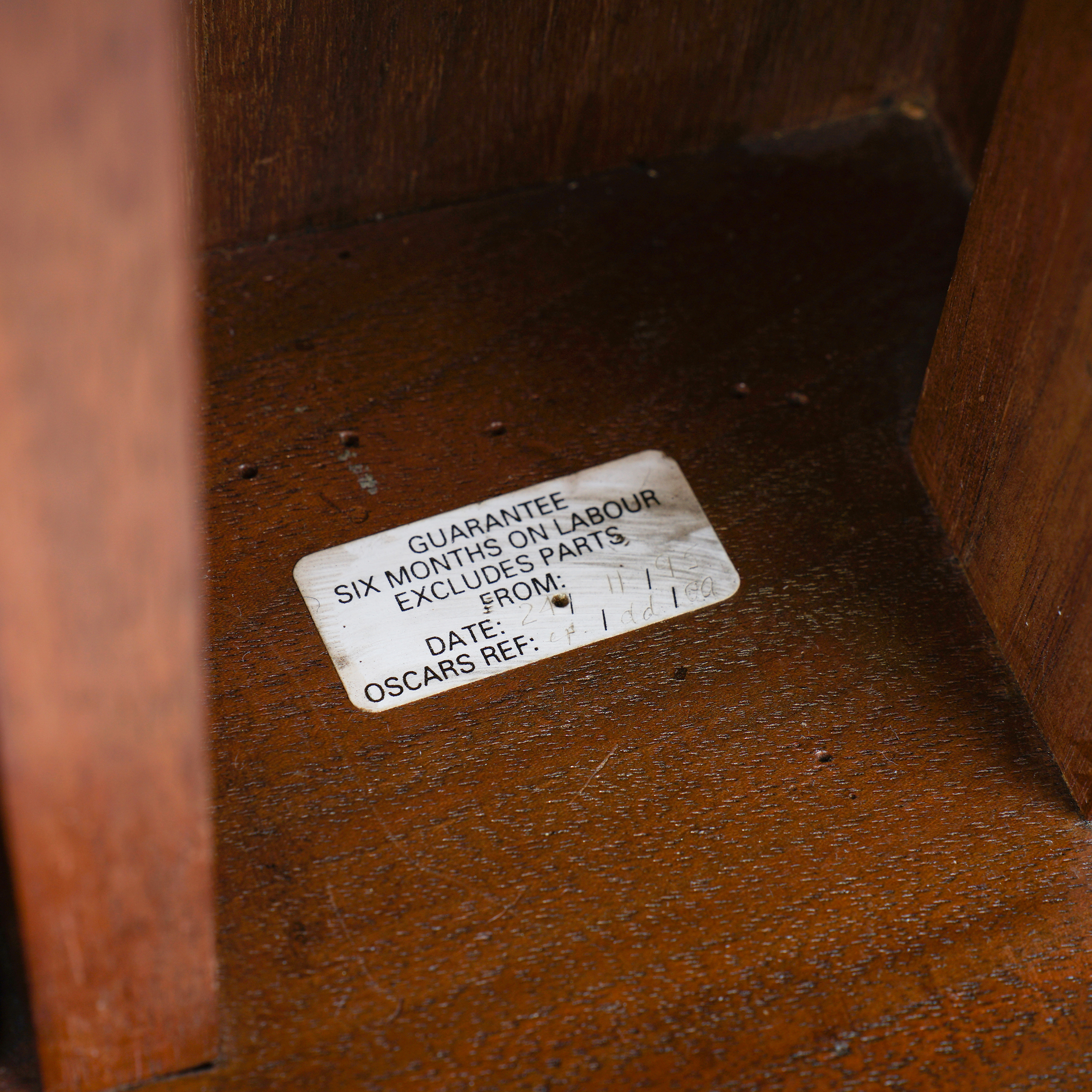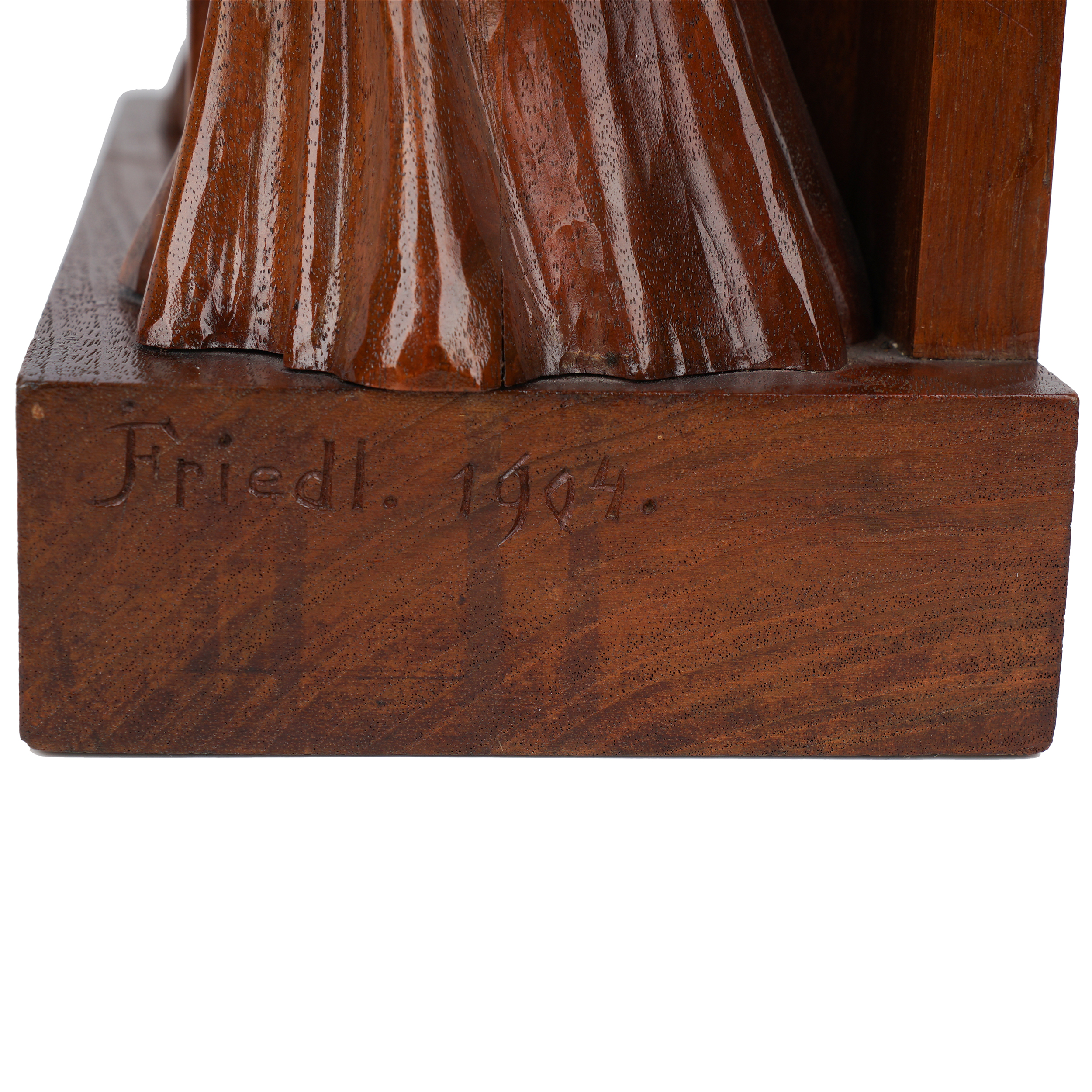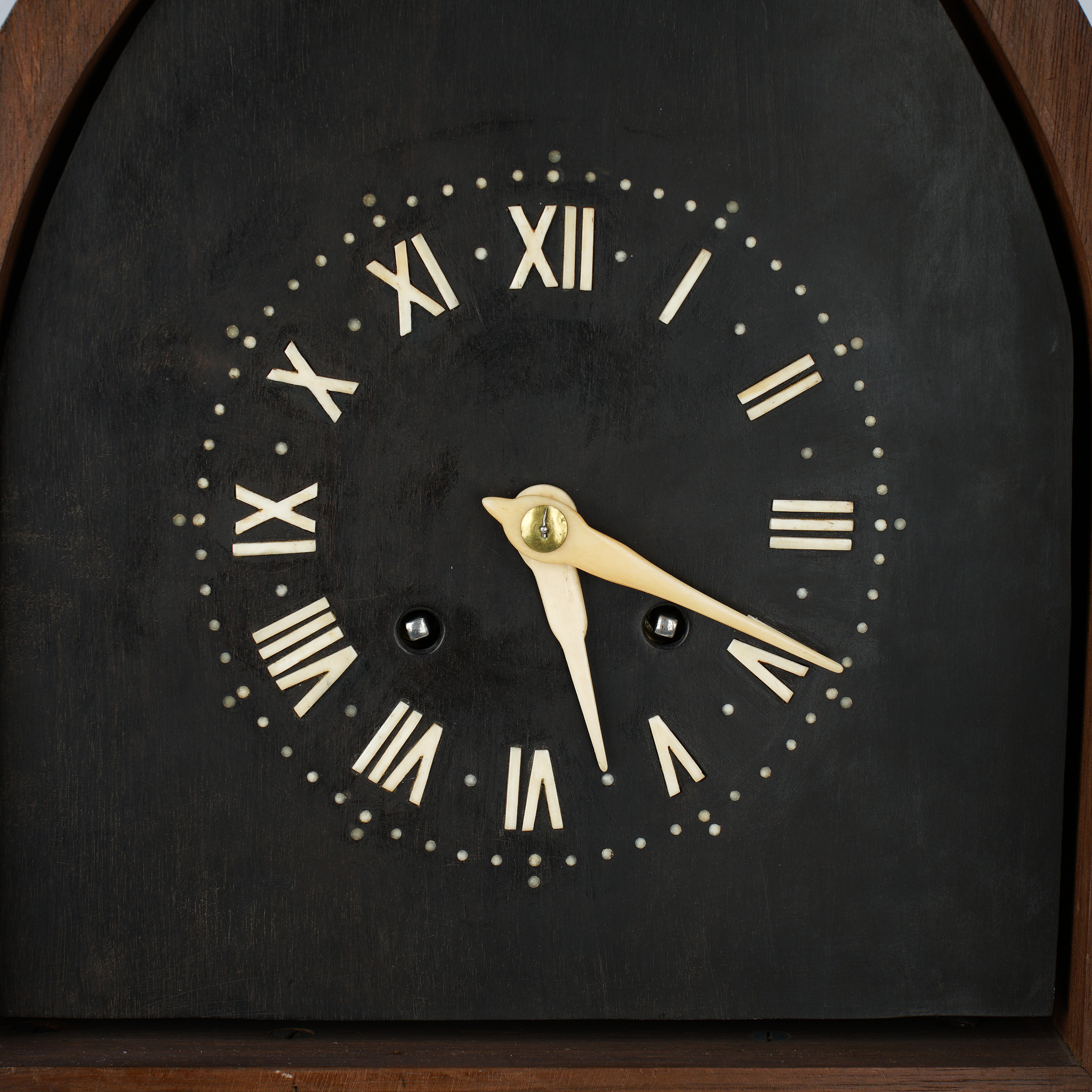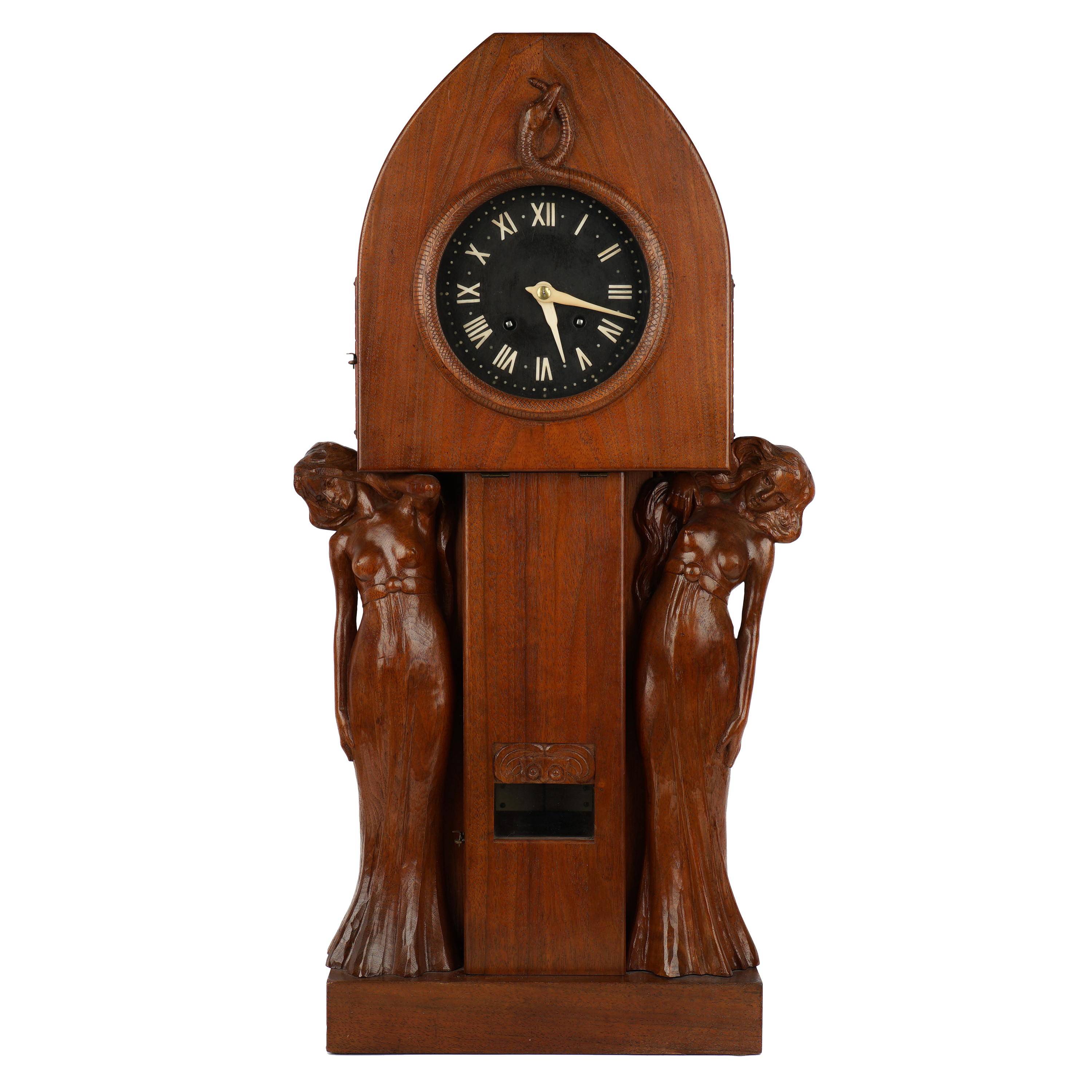 Красное дерева, резьба, часовой мастер - Густав Беккер (Gustav Becker), подпись «FRIEDLBURG 1904», черный циферблат с римскими цифрами часов и делением на минуты, Германия, Фридебург, начало ХХ века, размер (в/ш/г): 70 х 29,5 х 14 см. Ключ и маятник в комплекте
