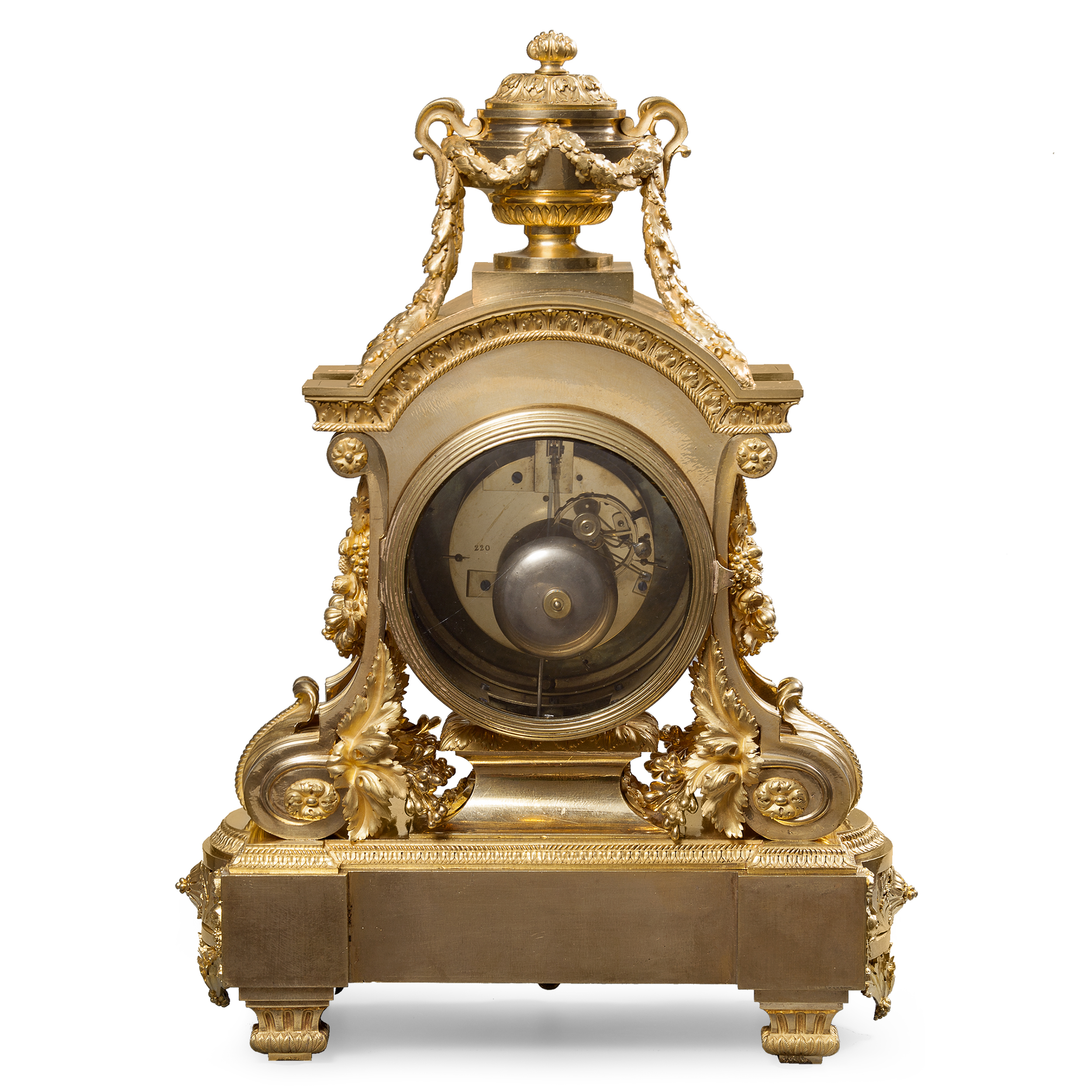 Часы выполнены по модели 1782-1783 годов. Бронза, литье, чеканка, золочение ормулю (d`ormoulu), эмалевый циферблат с арабскими цифрами для обозначения часов и минут, золоченные резные стрелки в стиле «Louis XIV», защитное стекло; на циферблате надпись: «Ferdinand Berthoud a Paris», на плате часового механизма «Ferdinand Berthoud A PARIS BY», Париж, бронзовый корпус выполнен в мастерской по производству художественных предметов из бронзы и красного дерева потомственного антиквара Альфреда Бёрделея (1847-1919); размер (в/ш/г): 54 х 36 х 16 см.