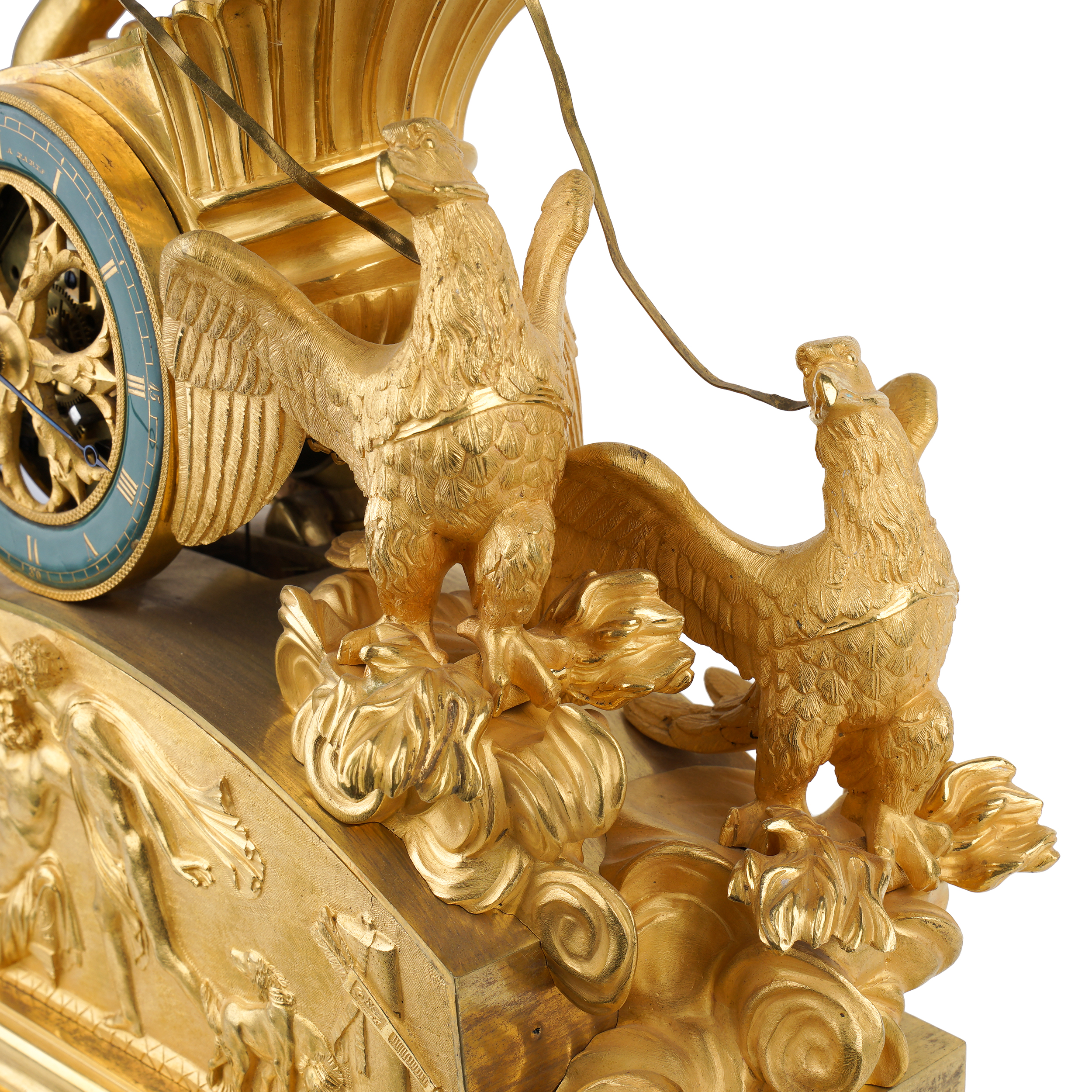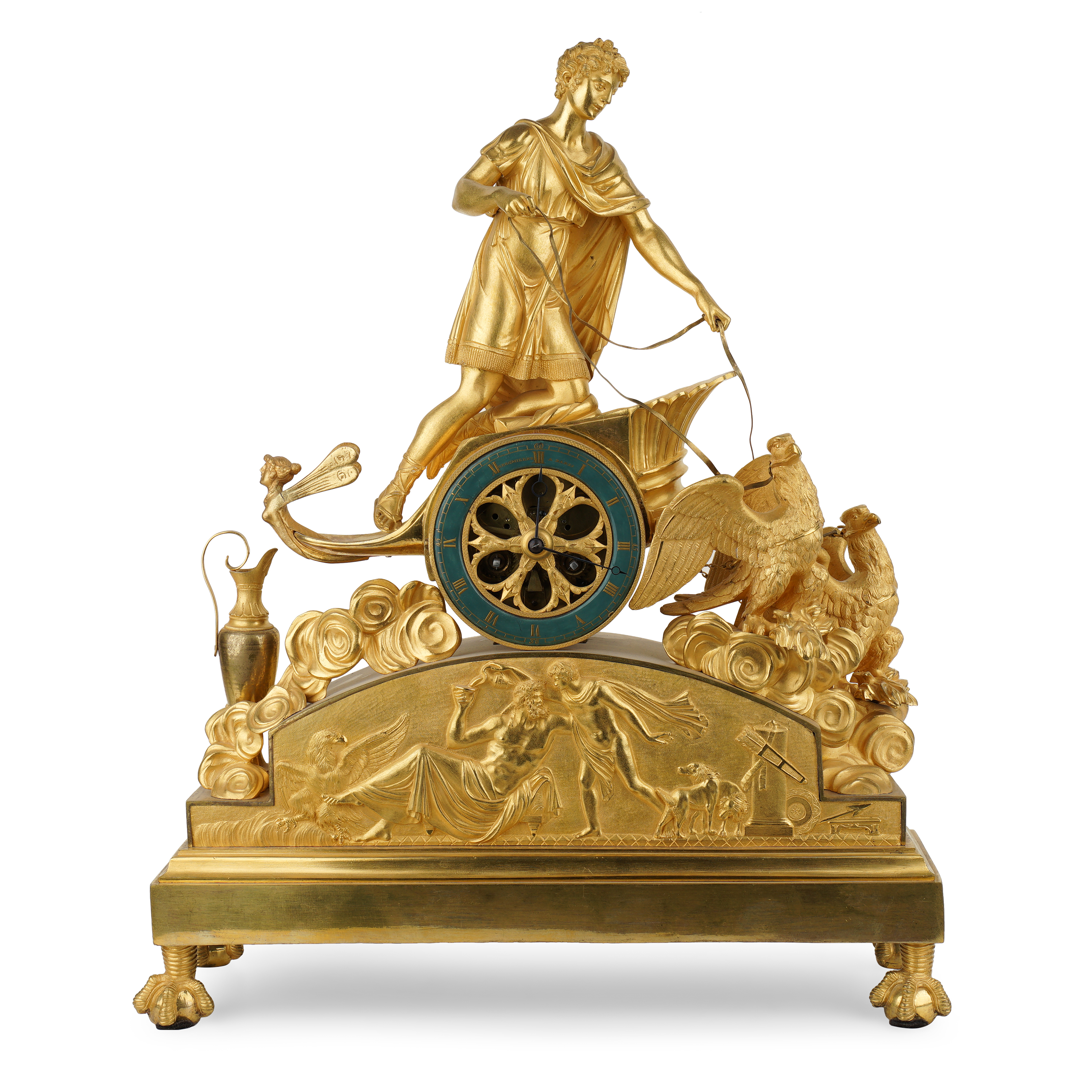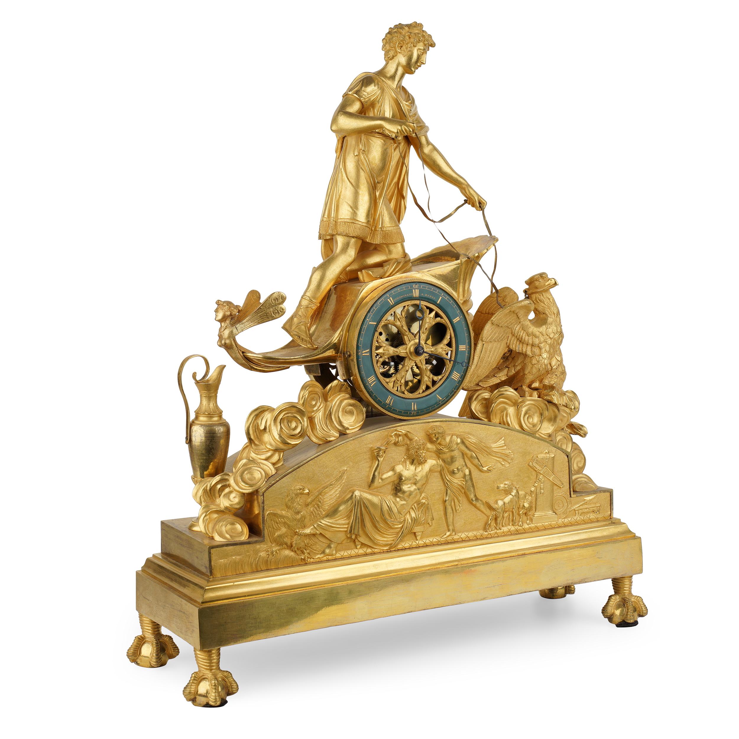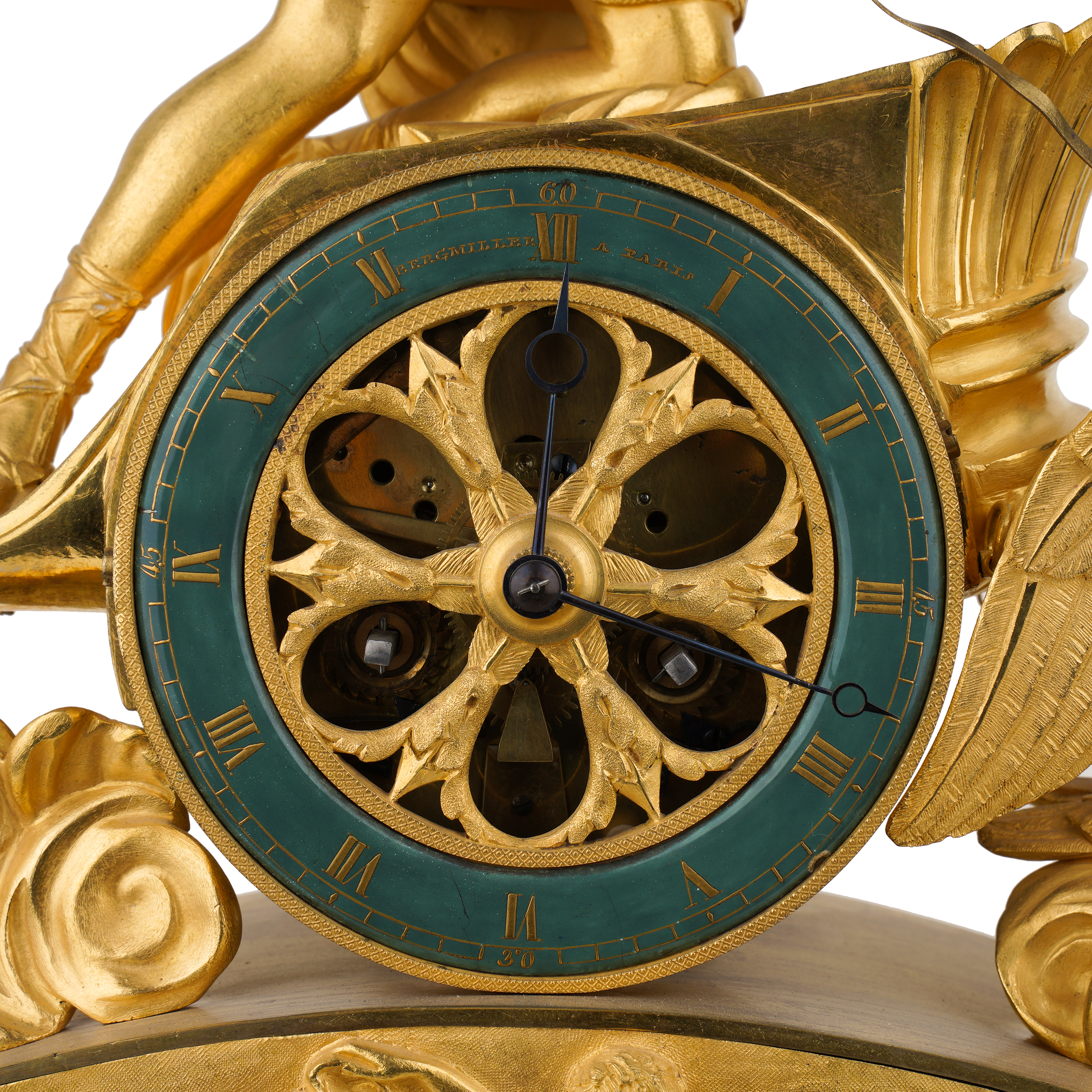 Бронза, литье, чеканка, золочение ормулю (d`ormoulu); кольцеобразный циферблат с открытым механизмом, с римскими цифрами для часов и делением на минуты, стальные вороненые стрелки, на циферблате подпись золотом: «Bergmiller a Paris» по зелёной эмали часовщика Бергмиллера (работал с 1810 по 1830 год); Париж, размер (в/ш/г): 52 х 43 х 15 см.