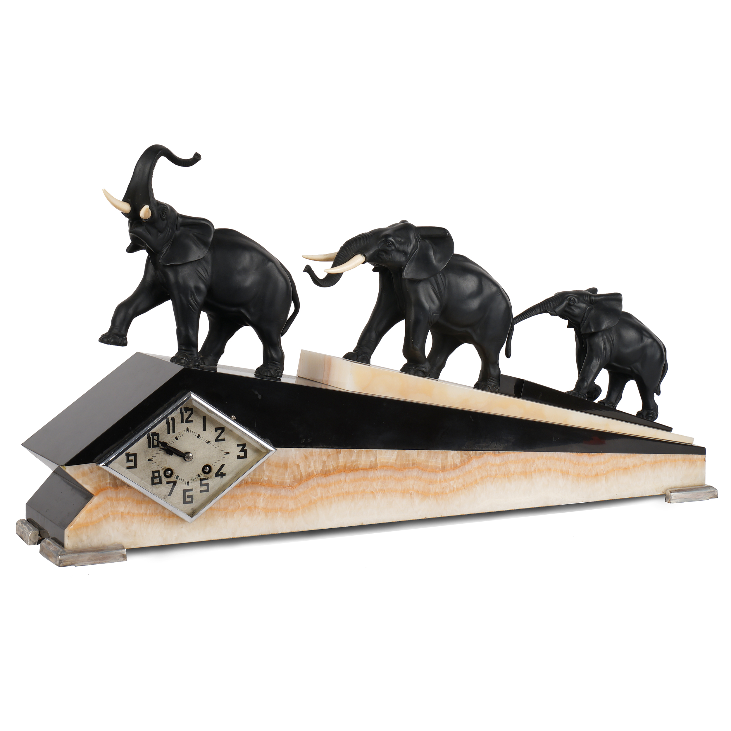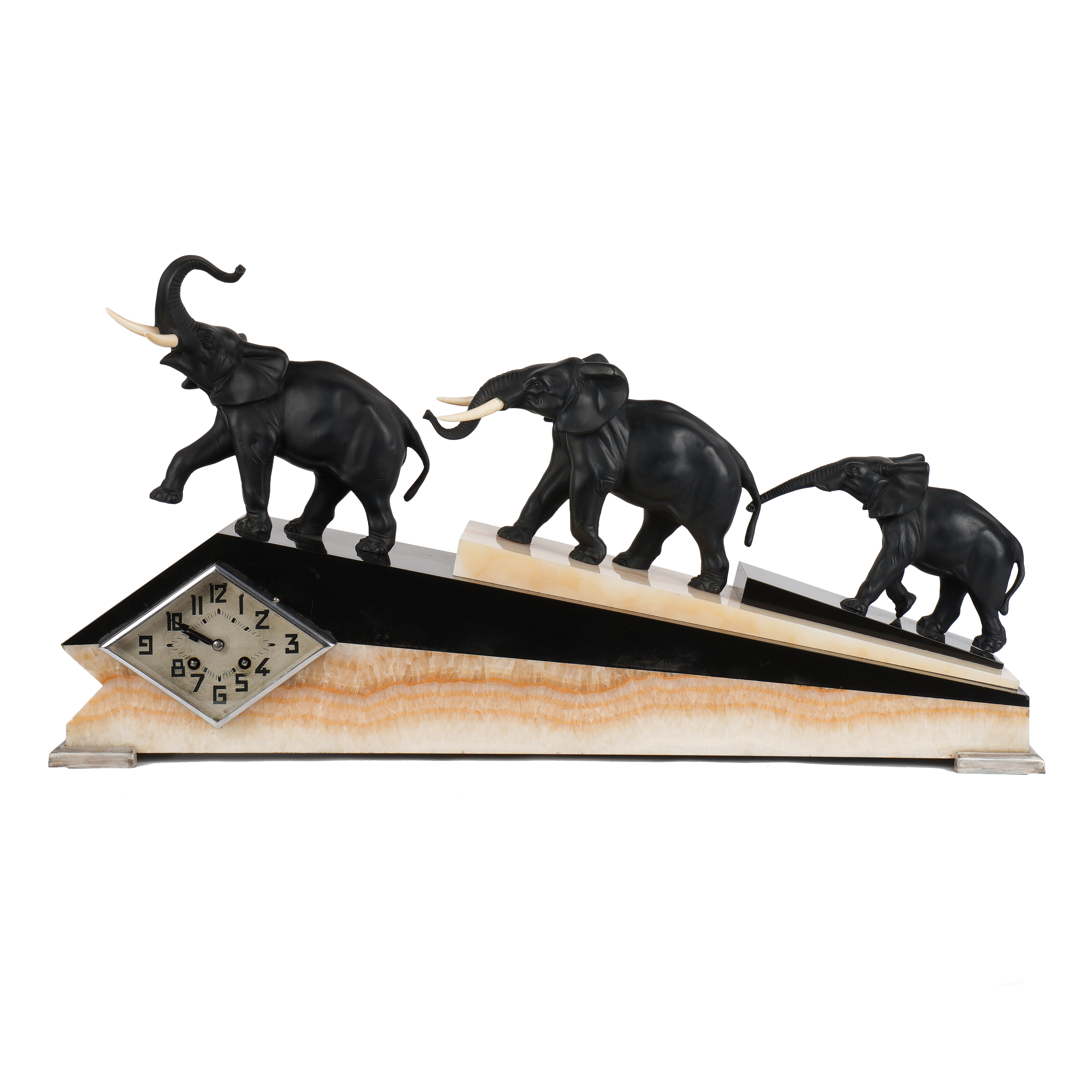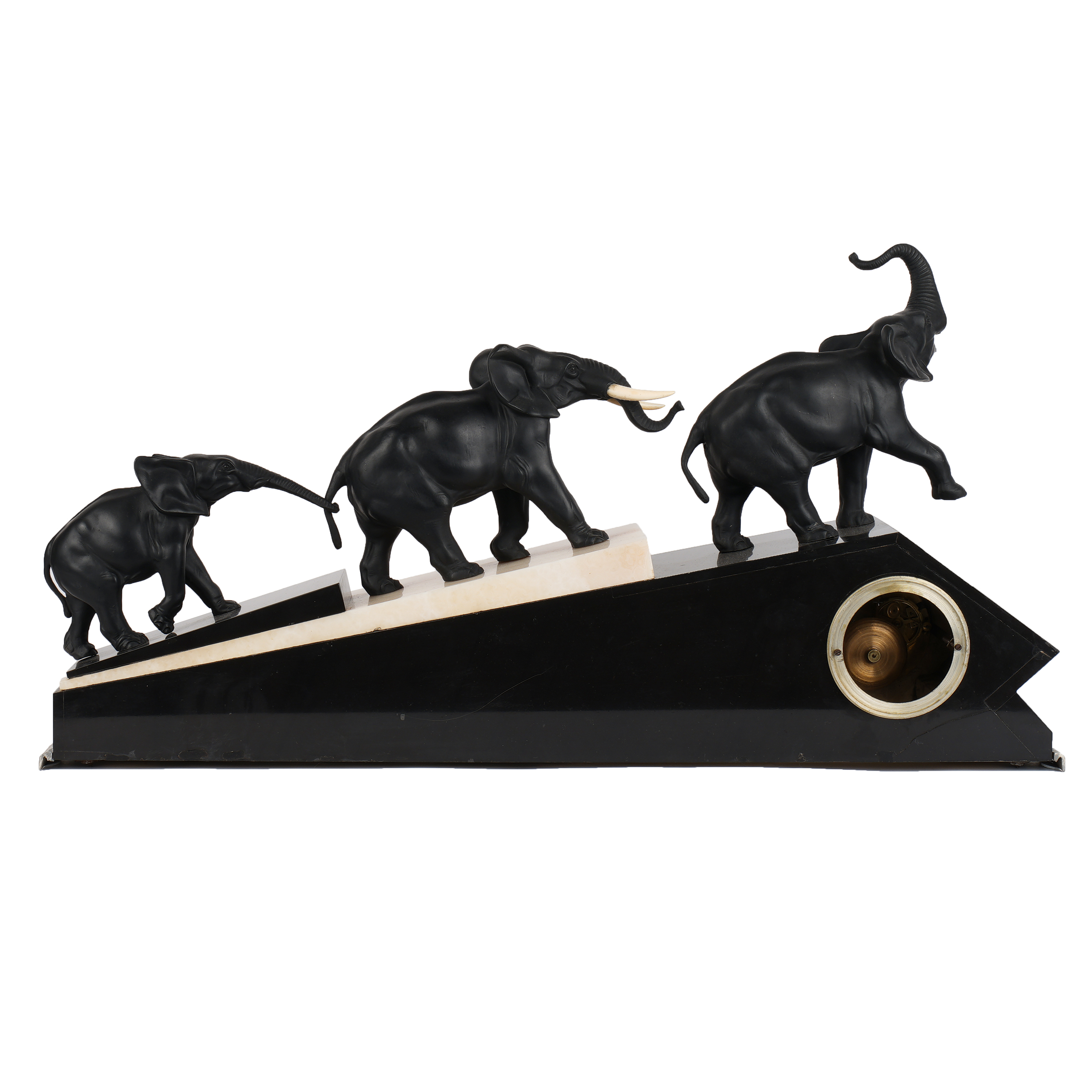 Французские часы в стиле ар-деко. Фигуры слонов выполнены в манере французского скульптора-анималиста Жоржа Гарде (GEORGES GARDET,1863-1939). Бронза, литье, патинирование, чёрный мрамор, оникс, Европа, около 1930 года, размер (в/д/г): 39 х 72 х 16 см