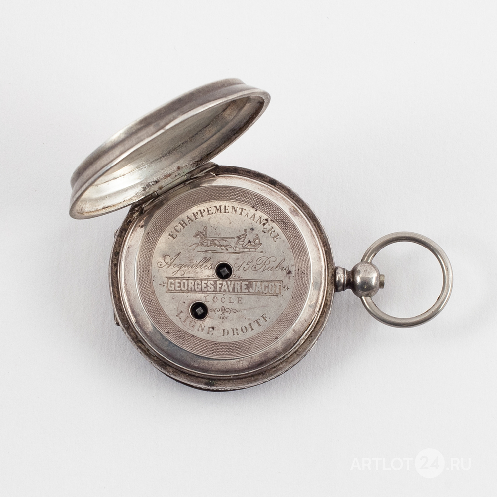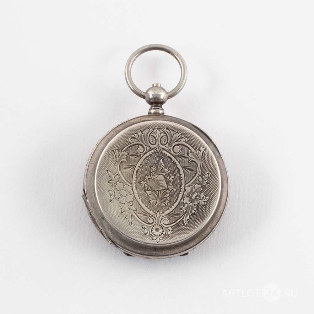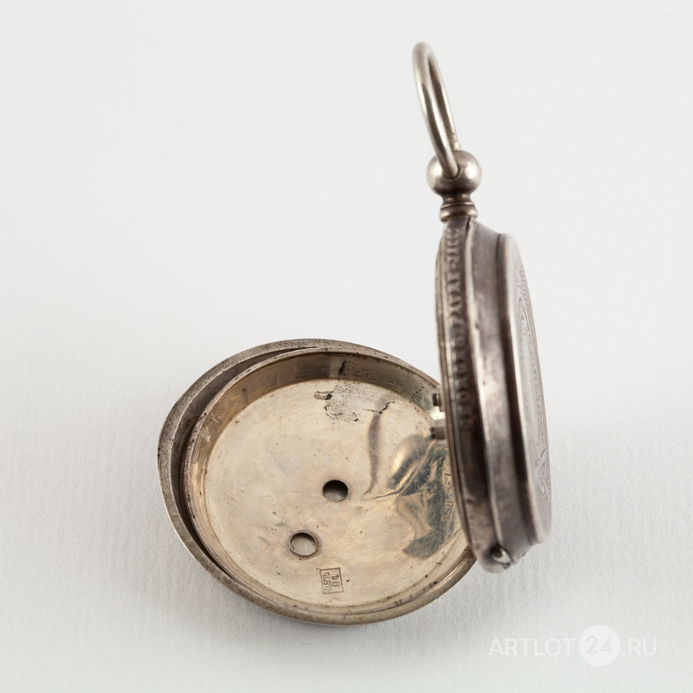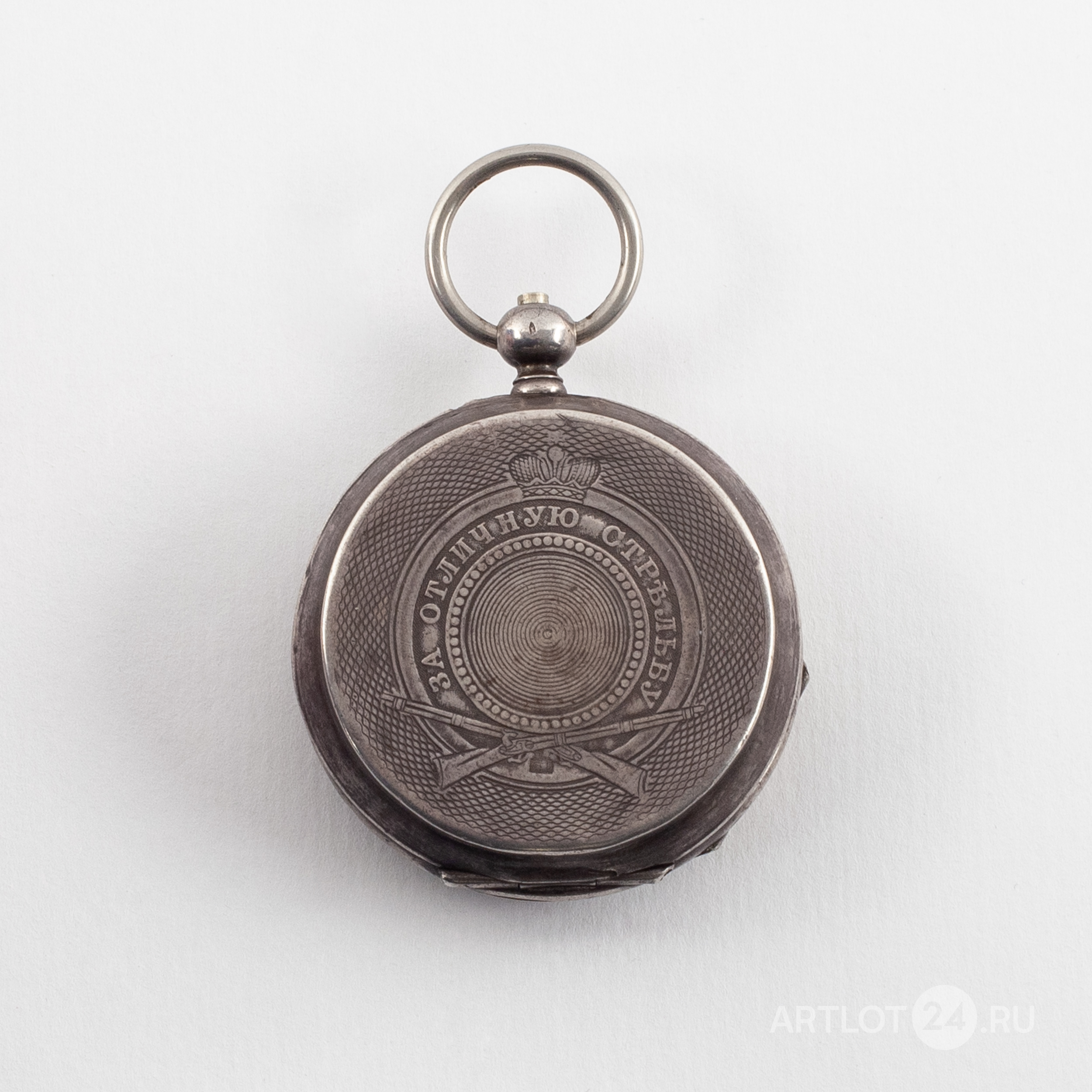 Белый металл (84 проба), штамп, гильоше, тип корпуса «барабан», завод ключом. На верхней крышке штампованное изображение мишени с кругами, увенчанной императорской короной, с перекрещенными винтовками и надписью: «За отличную стрельбу». Швейцария, Ле-Локл