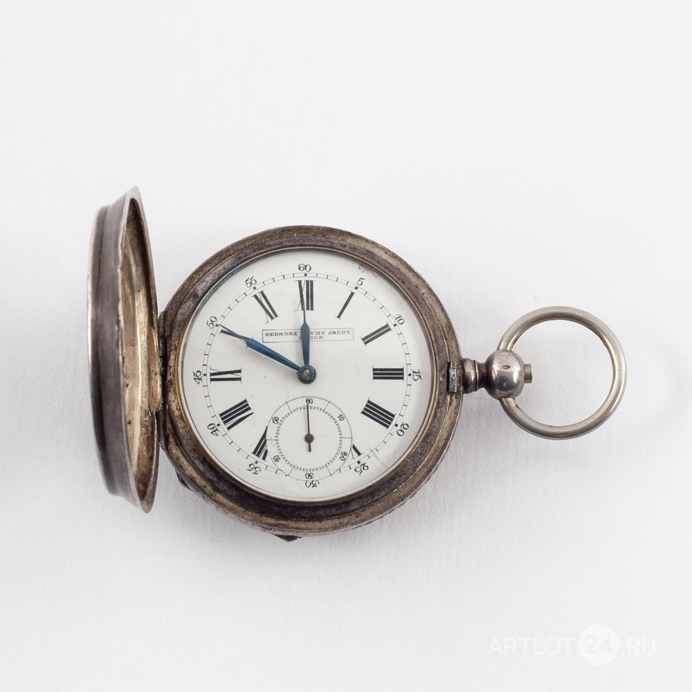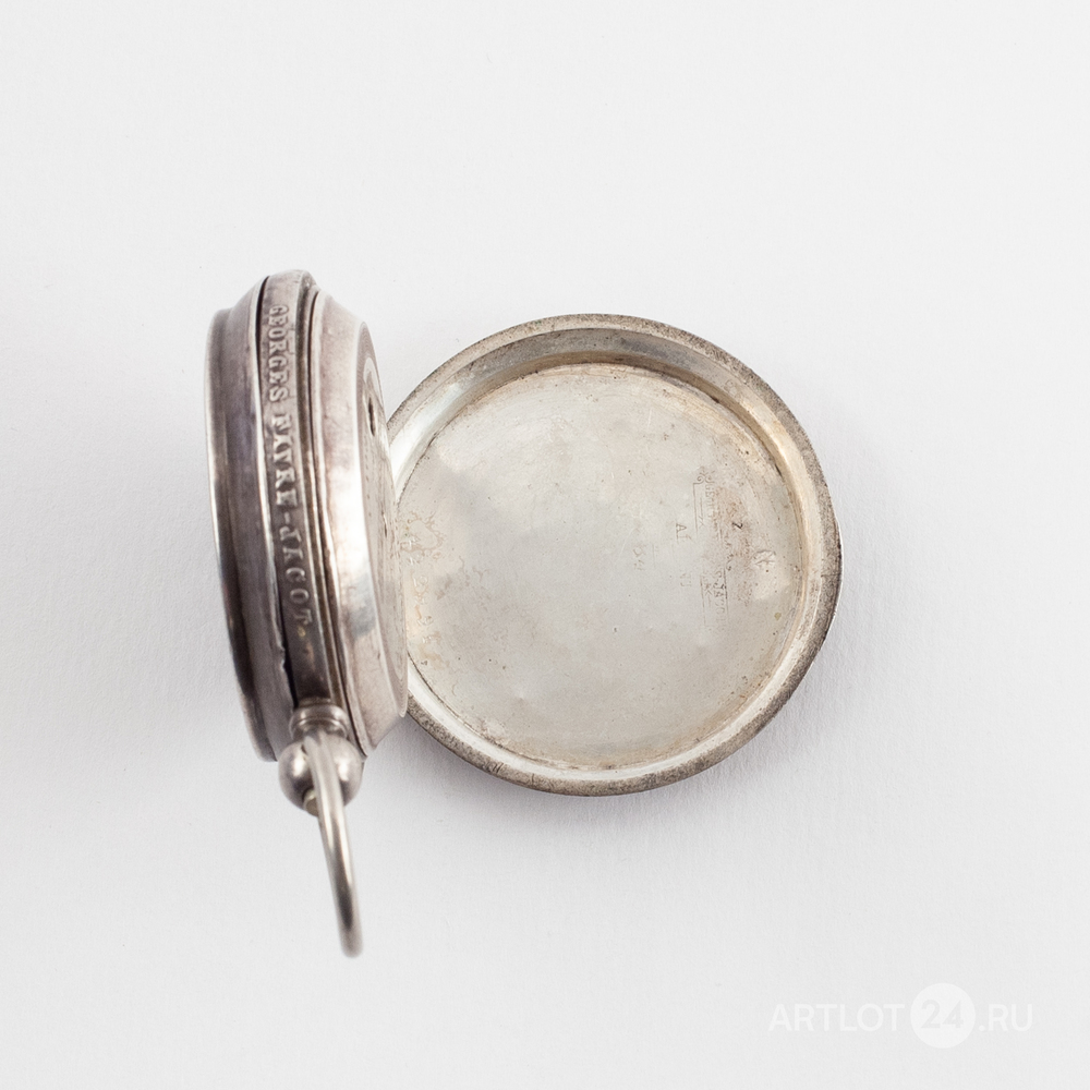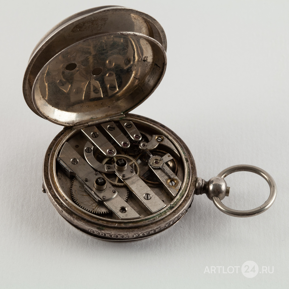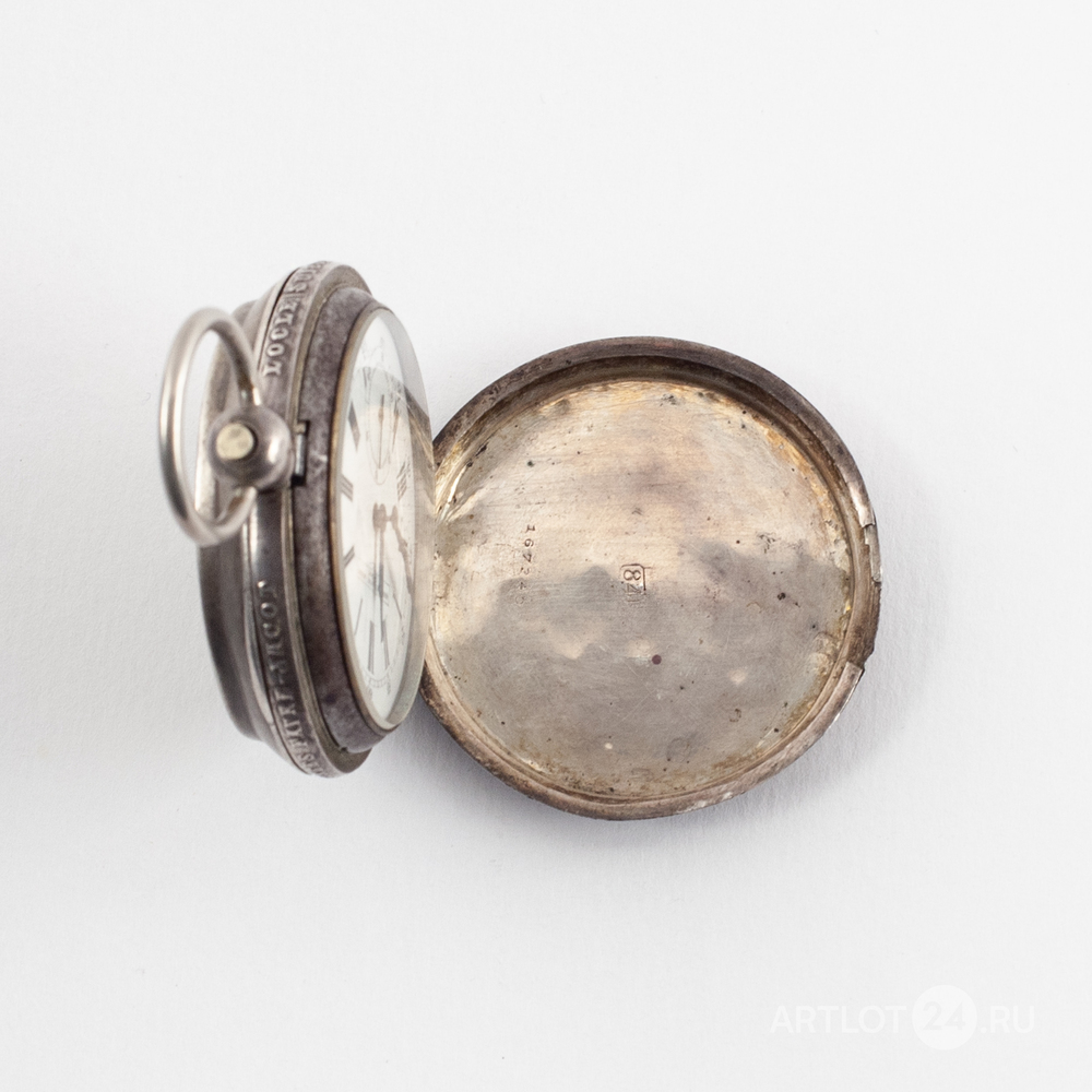 Белый металл (84 проба), штамп, гильоше, тип корпуса «барабан», завод ключом. На верхней крышке штампованное изображение мишени с кругами, увенчанной императорской короной, с перекрещенными винтовками и надписью: «За отличную стрельбу». Швейцария, Ле-Локл