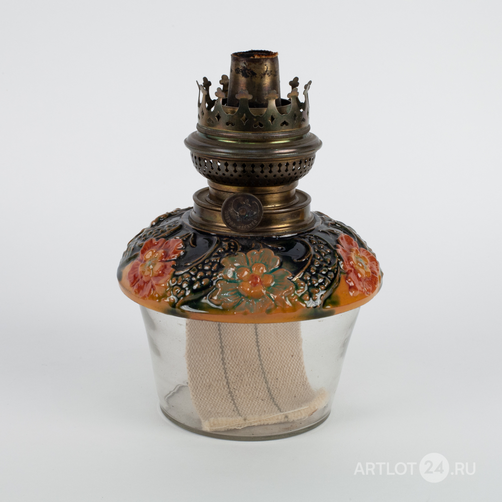 Керосиновый и свечной светильник на 7 светоточек с хрустальным обвесом. Шпиатр, латунь, литье, штамповка, бронзированный металл; майолика, полихромная роспись, стеклянные подвески, монтировка, подвес-утяжелитель, круглая марка на вентиле и головке механизма горелки - «Kosmos Brenner», Западная Европа, 1870-1905 годы, высота - 110 см, диаметр - 60 см