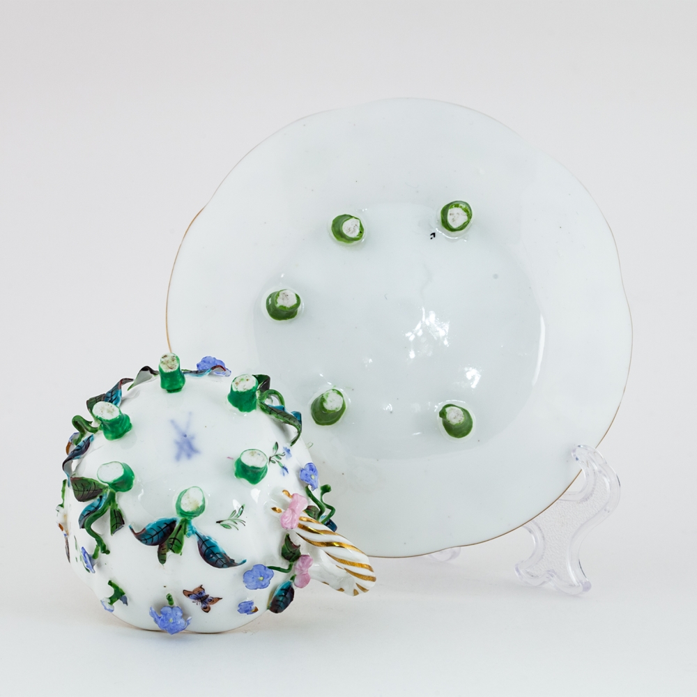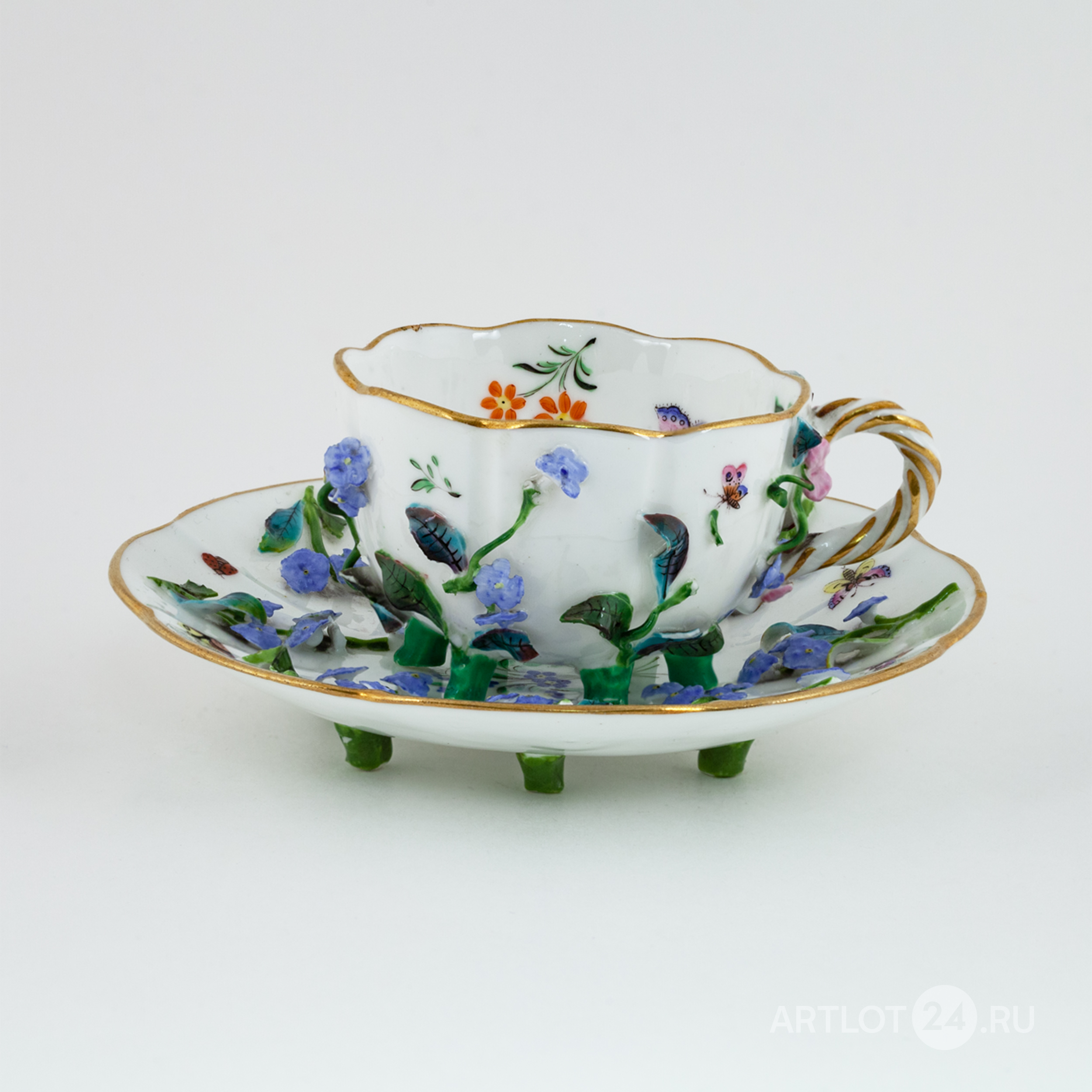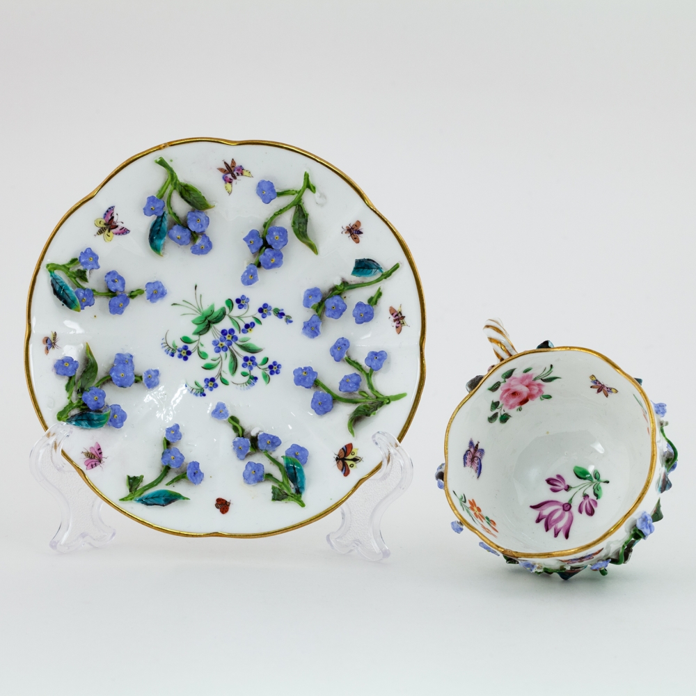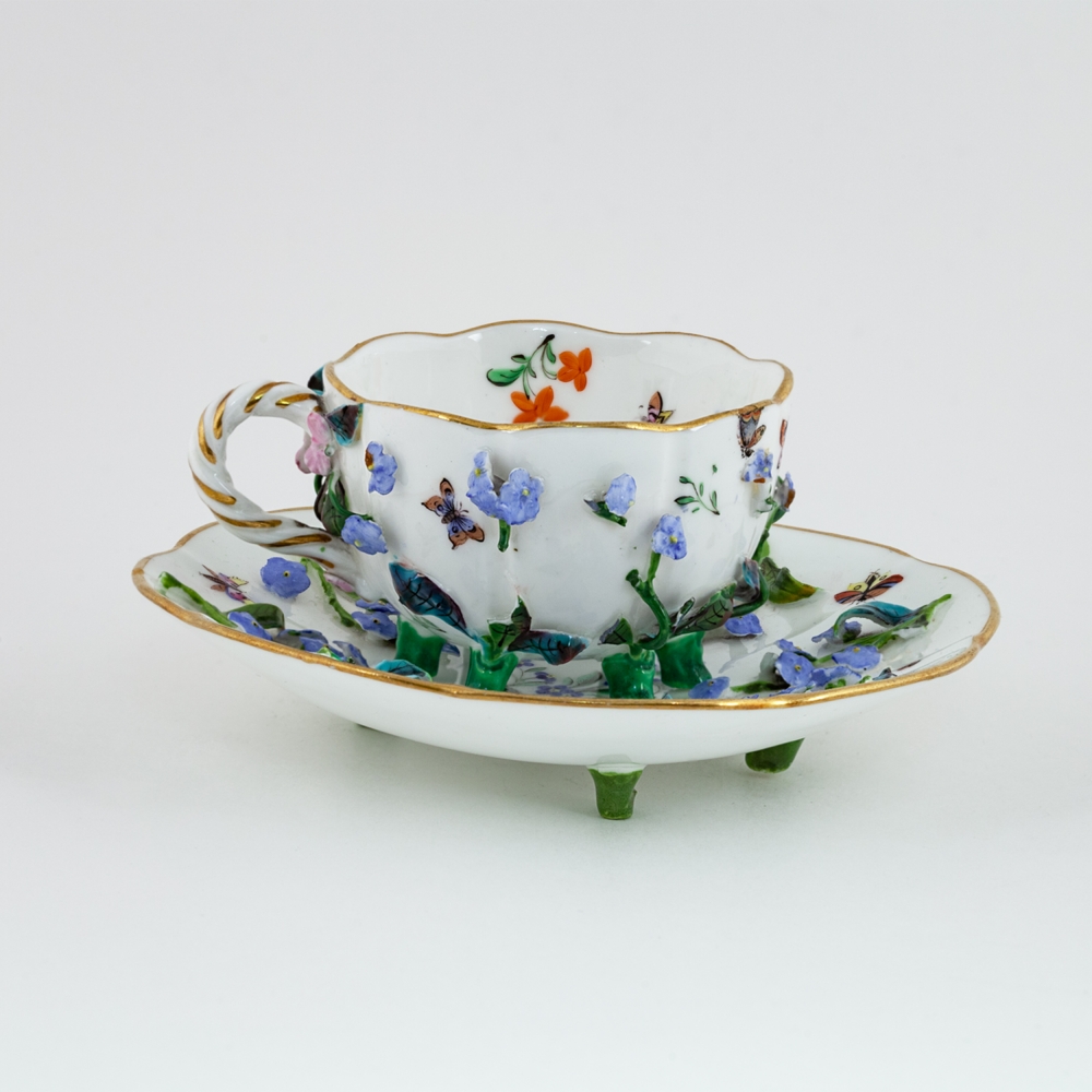 Фарфор, формовка, лепка, полихромная надглазурная роспись, золочение, на чашке клеймо подглазурное кобальтом в виде скрещенных мечей, Мейсен (Meissen), XIX век, высота – 5 см, диаметр блюдца – 12,5 см