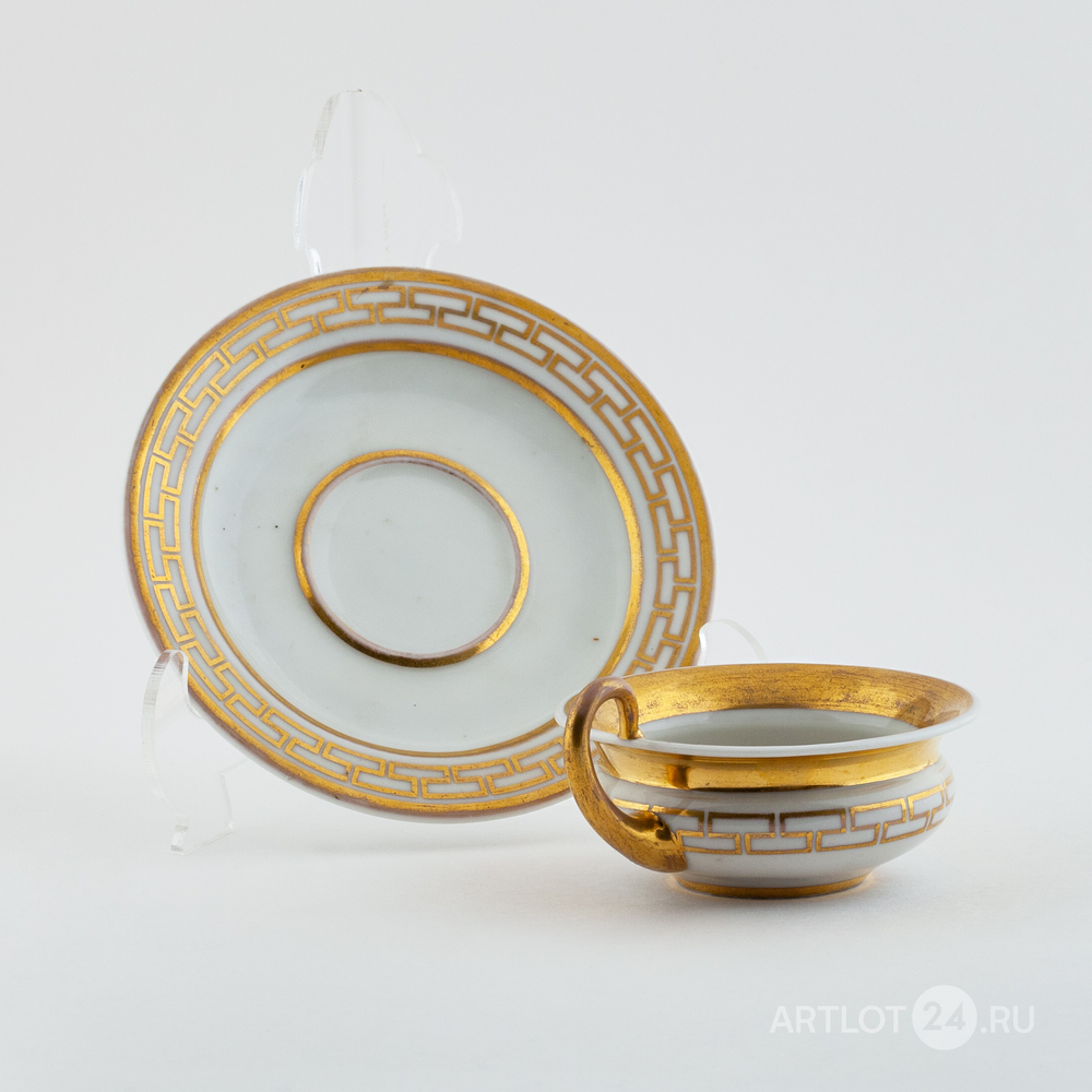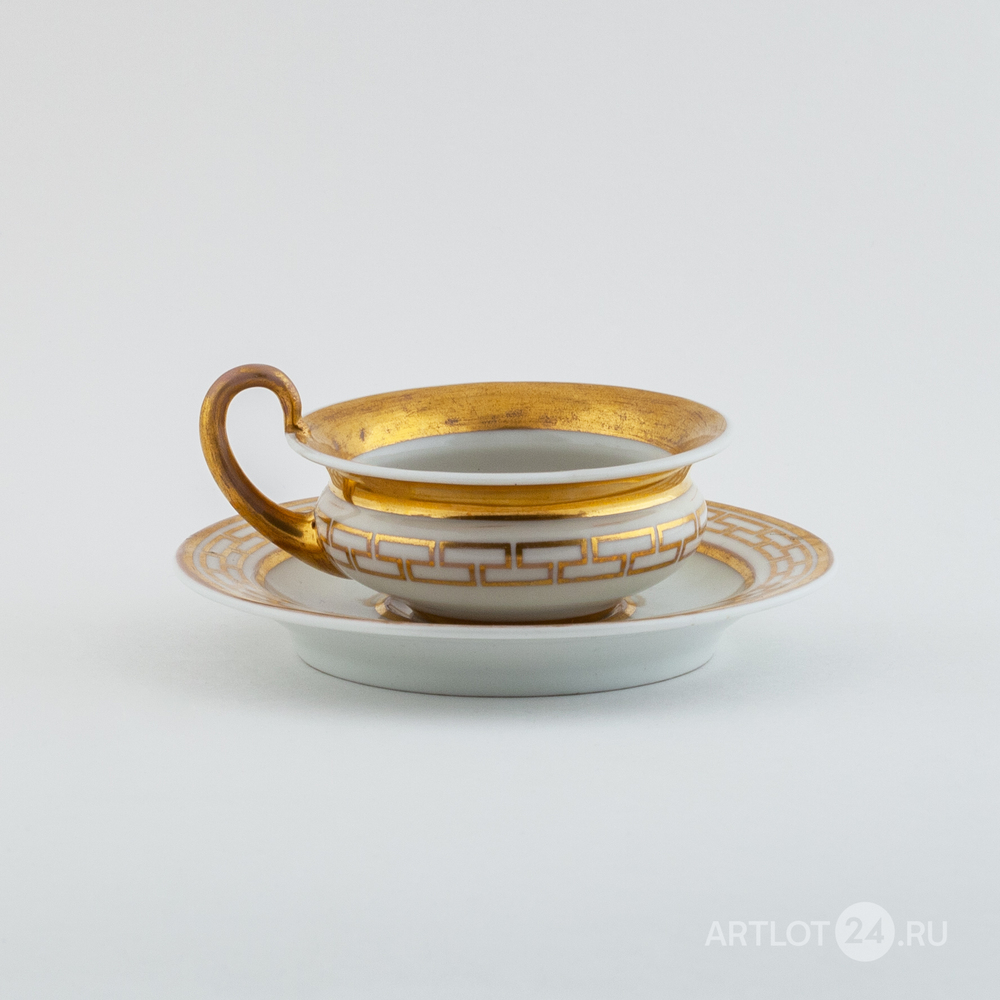 Фарфор, золочение, марка подглазурная кобальтом - совмещенное «АП» завода А. Попова, Россия, село Горбуново Дмитровского уезда Московской губернии, 1840-1850-е годы, высота – 4,3 см, диаметр блюдца – 13 см.