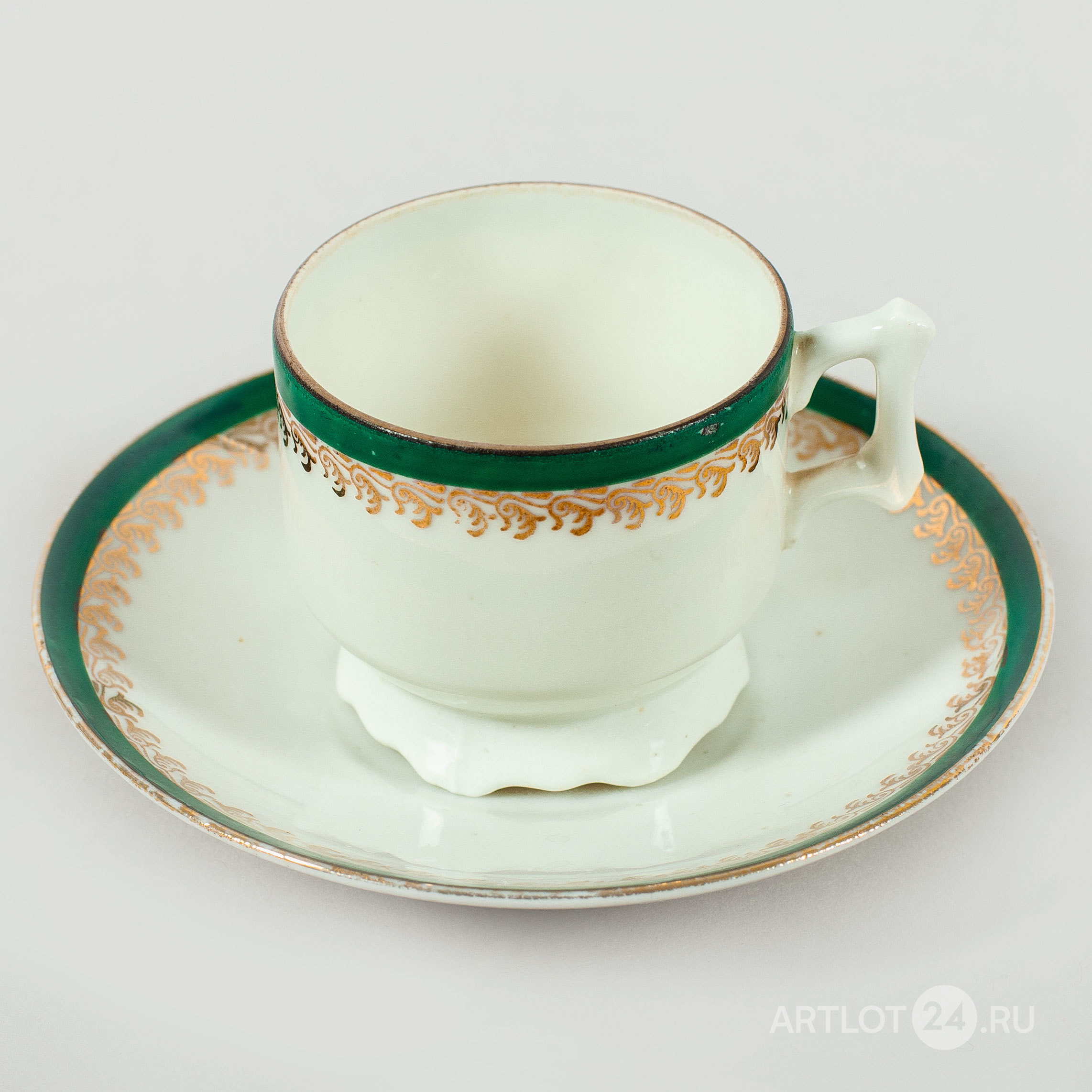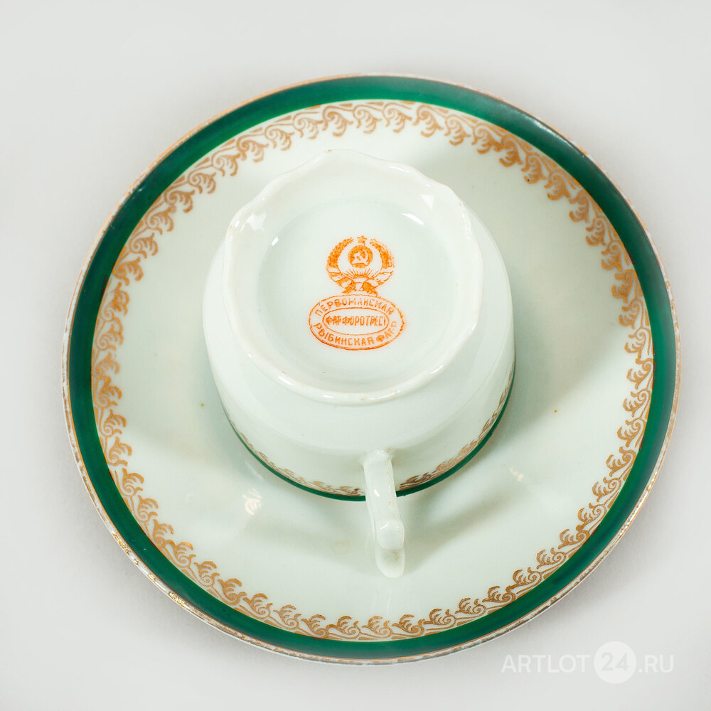Фарфор, зелёная лента, золочение, первомайский фарфоровый завод, красное надглазурное клеймо (1-й сорт), СССР, 1925-1930-е годы.