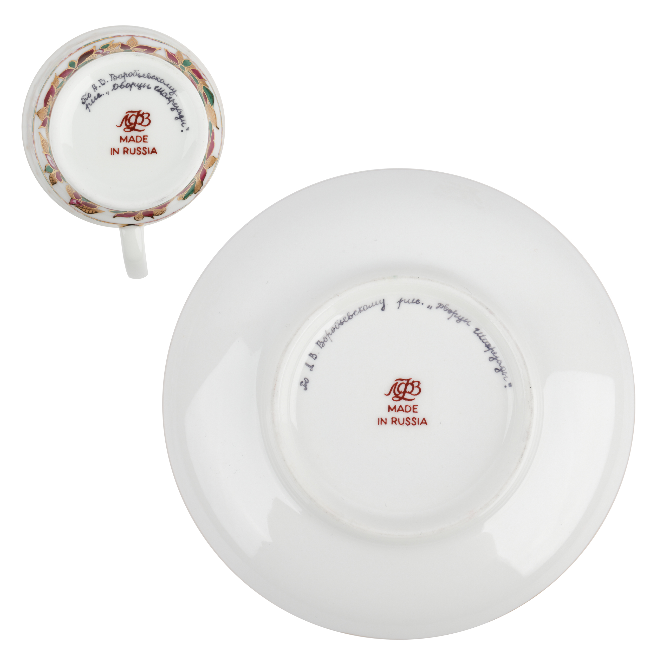 Костяной фарфор, ручная роспись, золочение. Марка: красная «ЛФЗ / MADE IN RUSSIA», подпись.