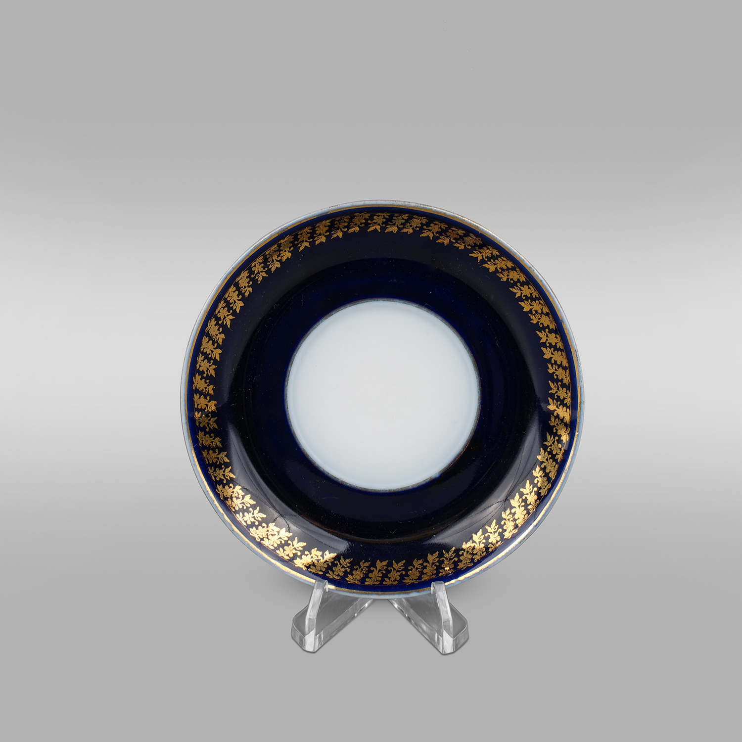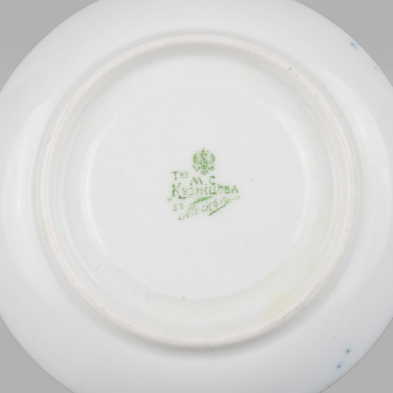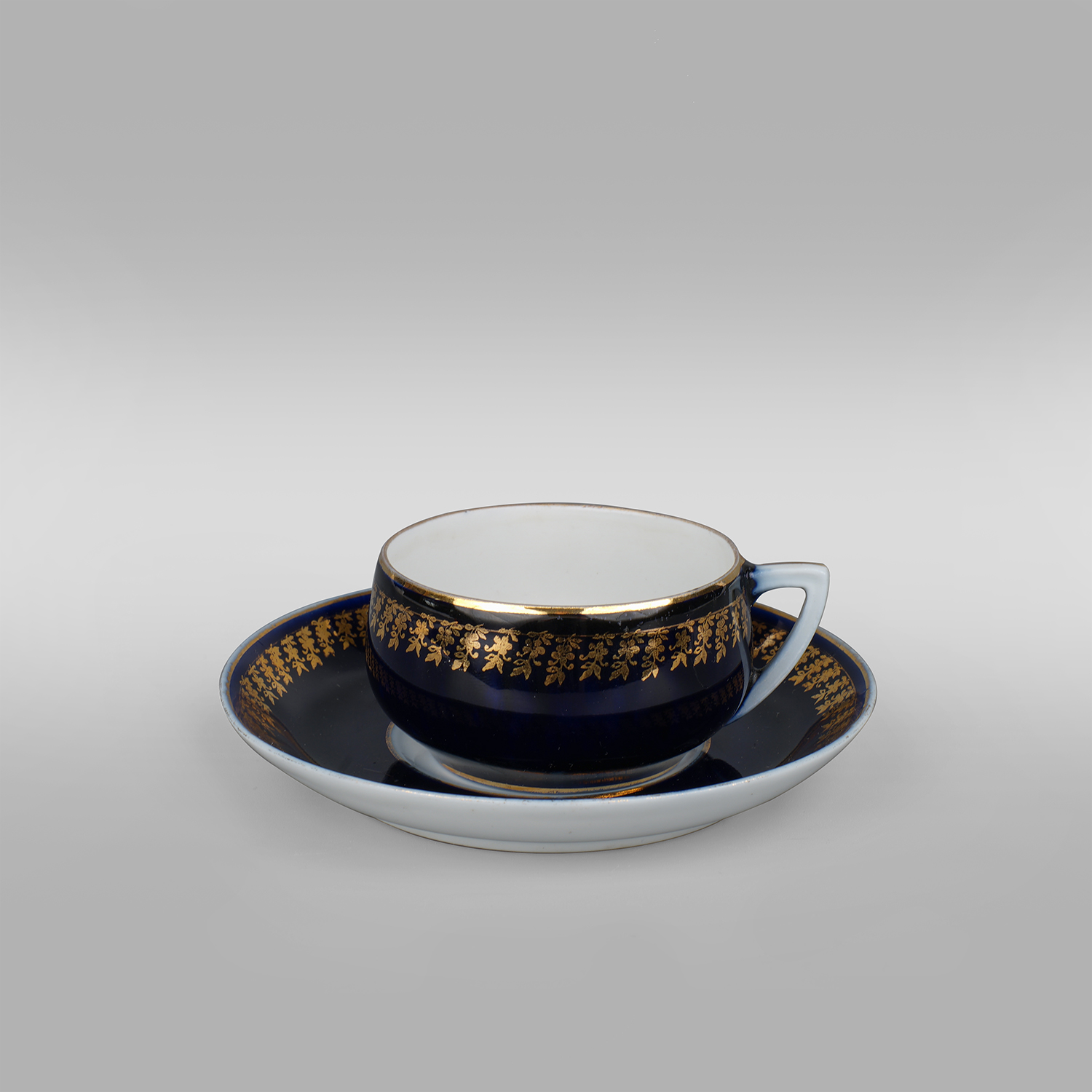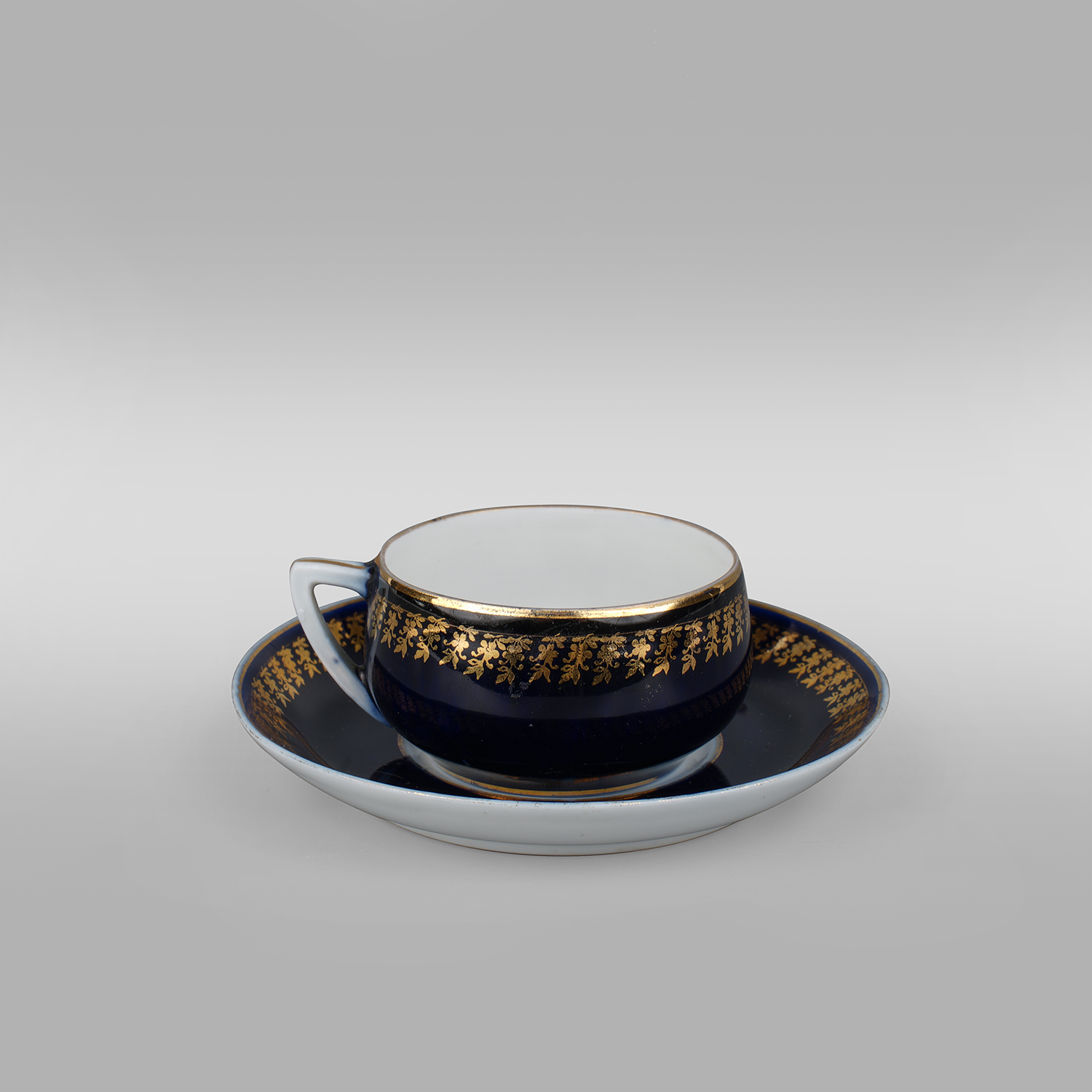 Фарфор, крытье кобальтом, золочение, зеленое надглазурное клеймо товарищества М.С. Кузнецова в Москве, 1889-1917 гг., высота чашки – 4 см, диаметр блюдца – 11,8 см