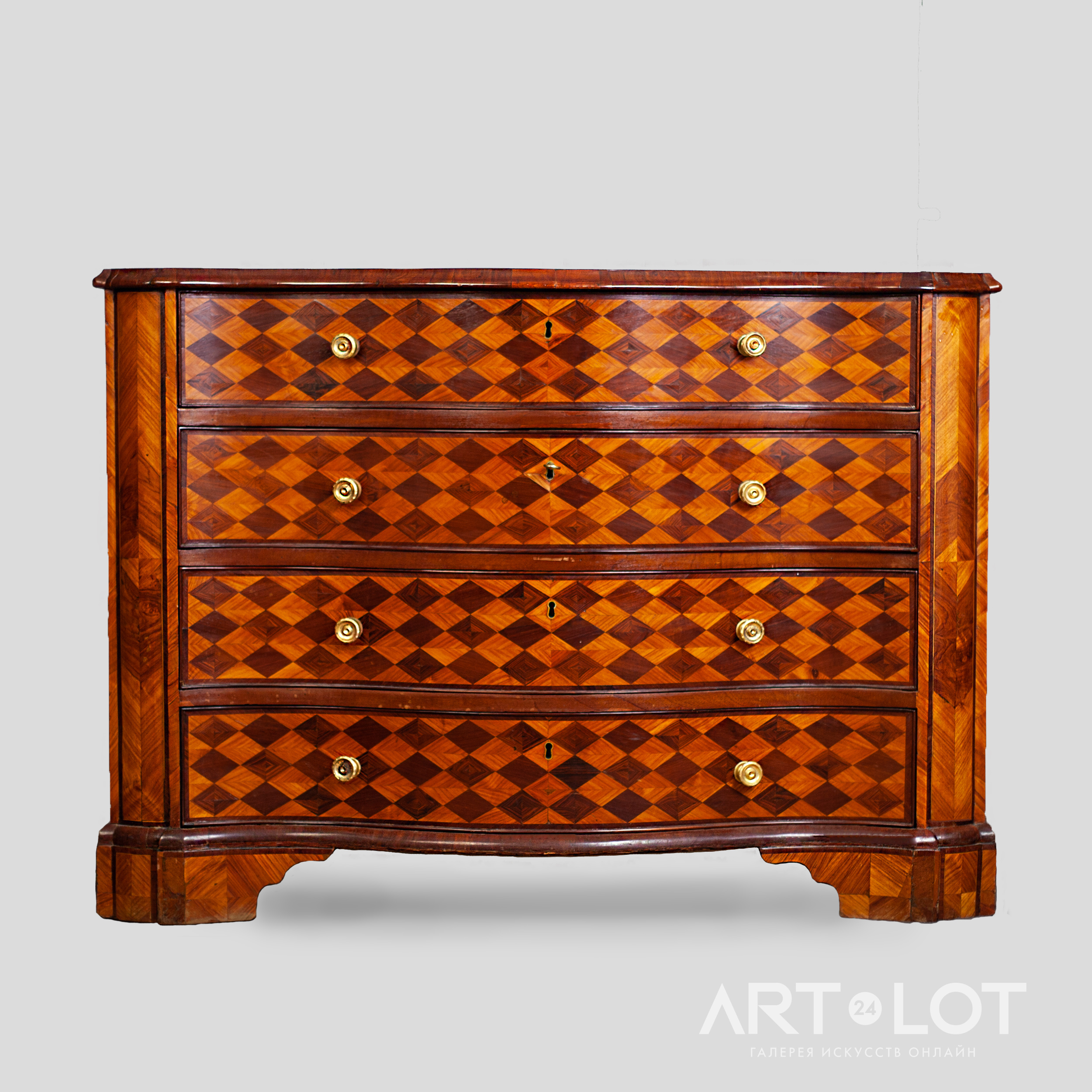 Четыре ящика. Хвойные породы (основа), красное дерево, дерево рода Дальбергий и др. плроды, паркетри, столярная работа. Россия, третья четверть XVIII века, размер (в/ш/г): 87х126х 72 см. Сопровождается заключением кандидата искусствоведения Т.Б. Семеновой.