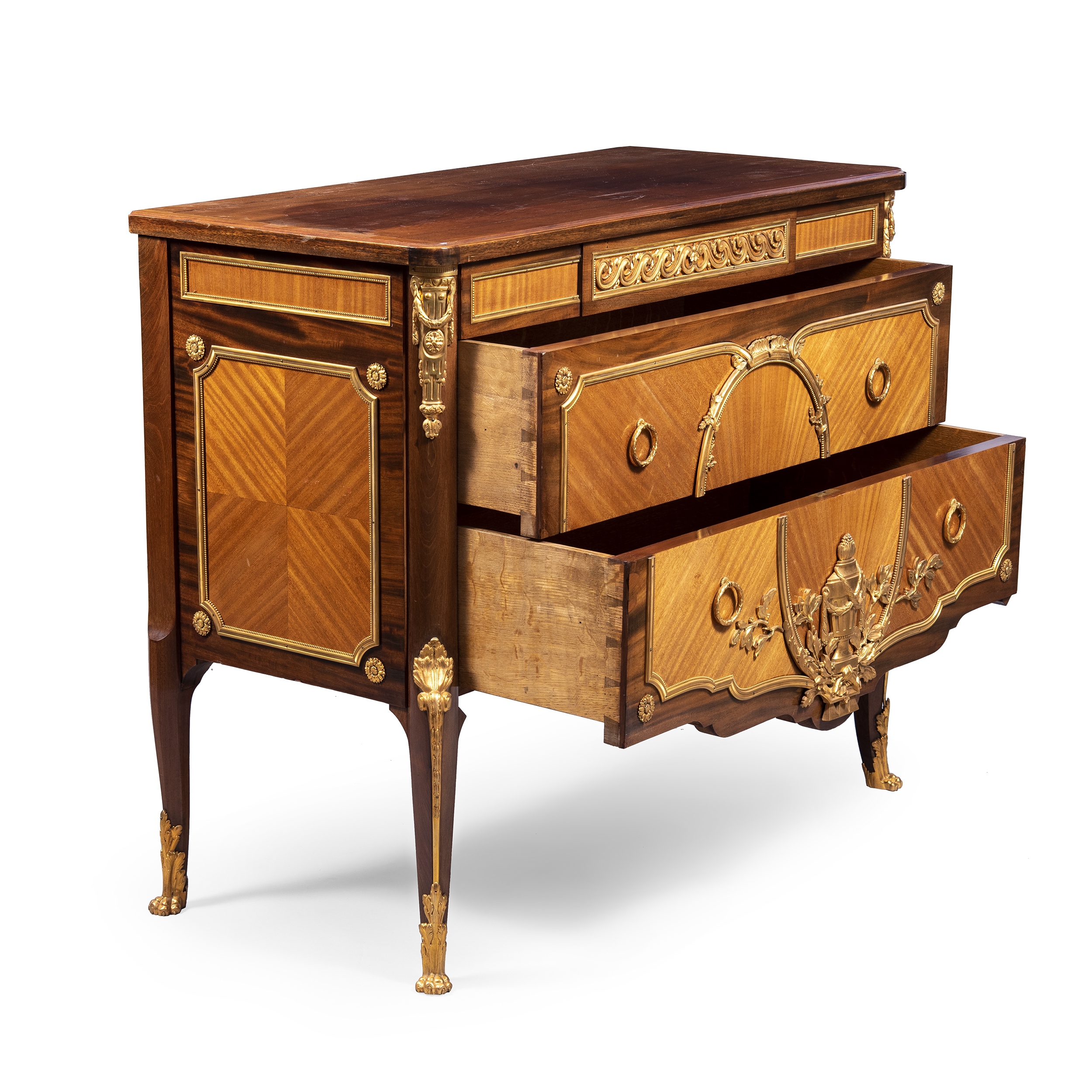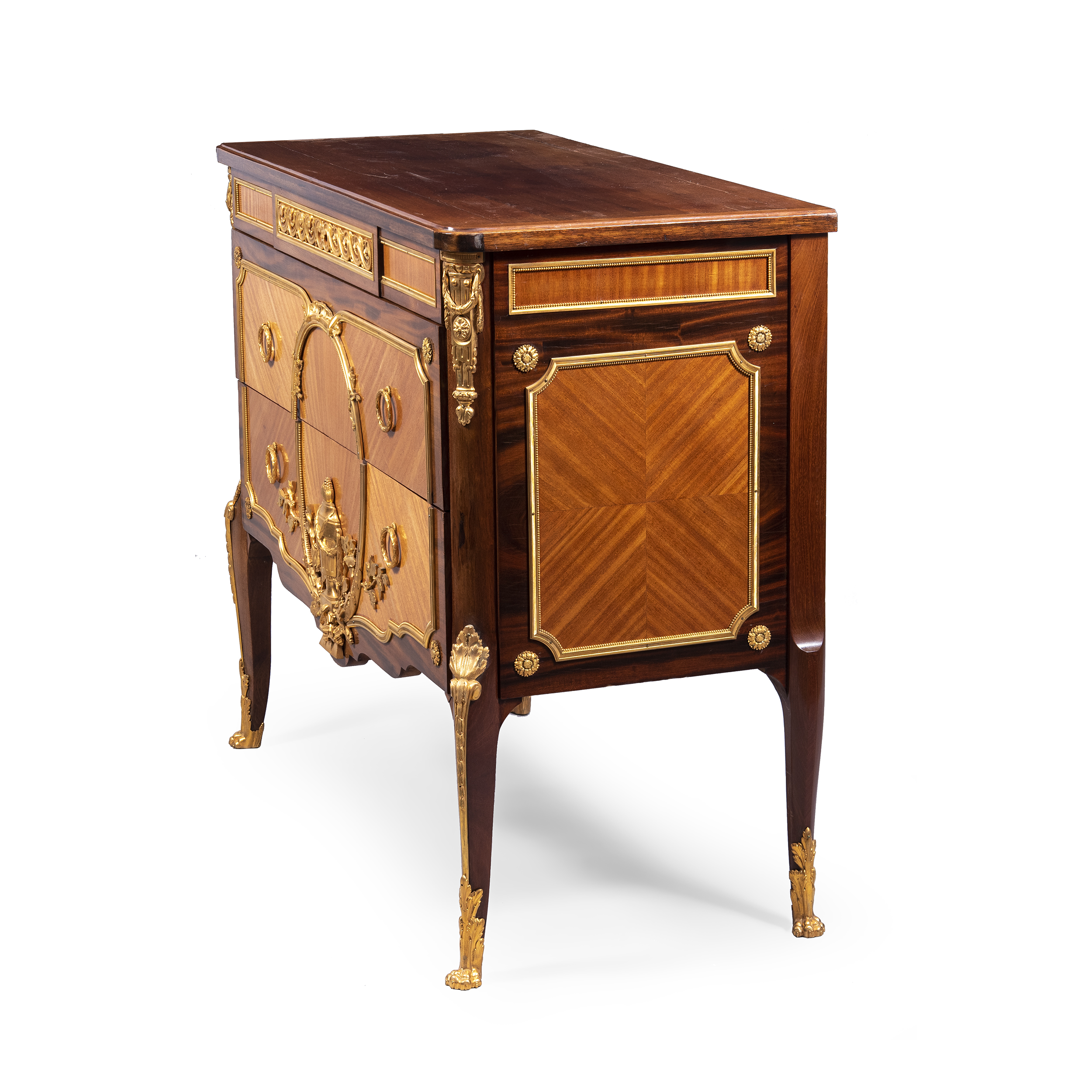 Дерево, маркетри, бронза, литье, чеканка, золочение.