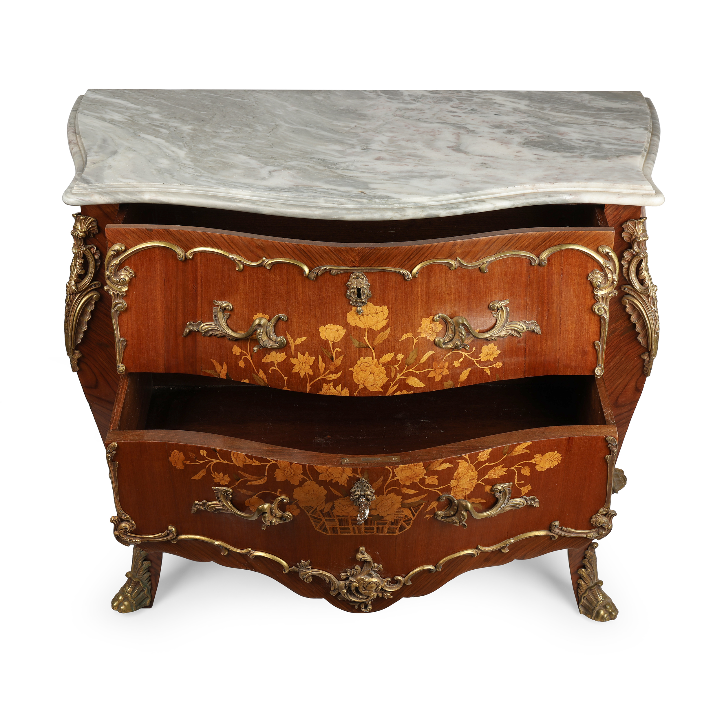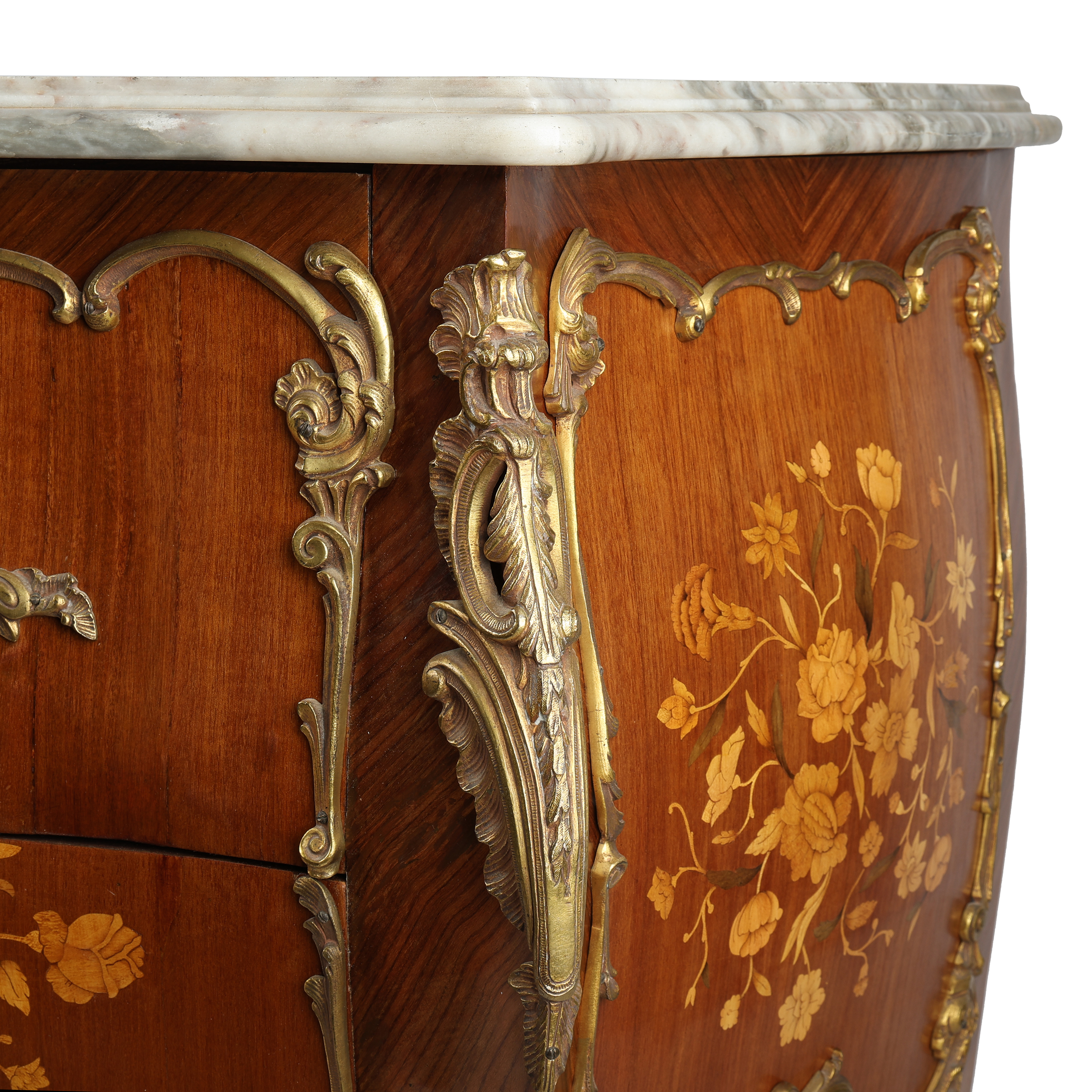 Фанерование различными породами дерева, маркетри, накладки золоченой бронзы, мраморная столешница.