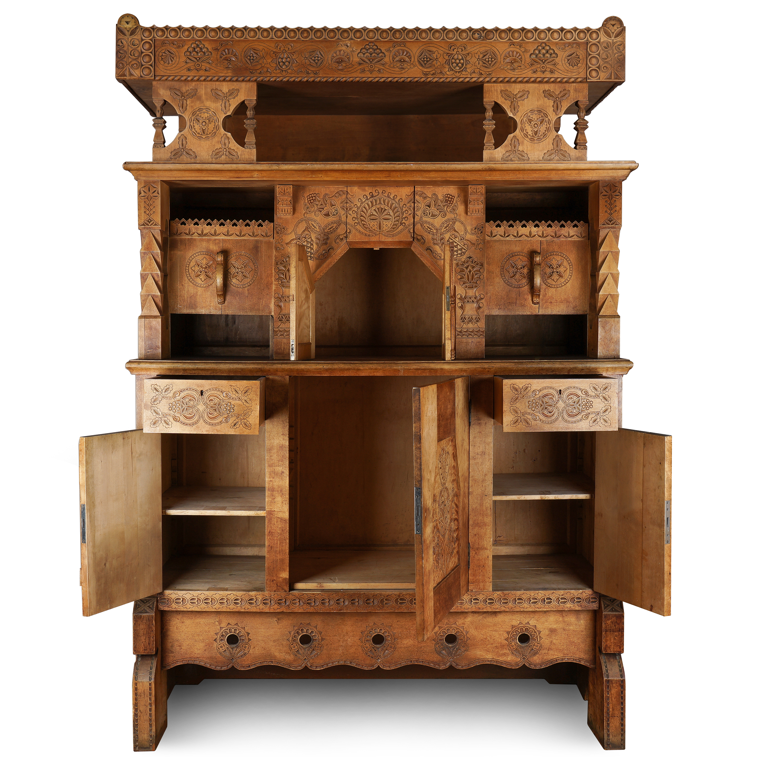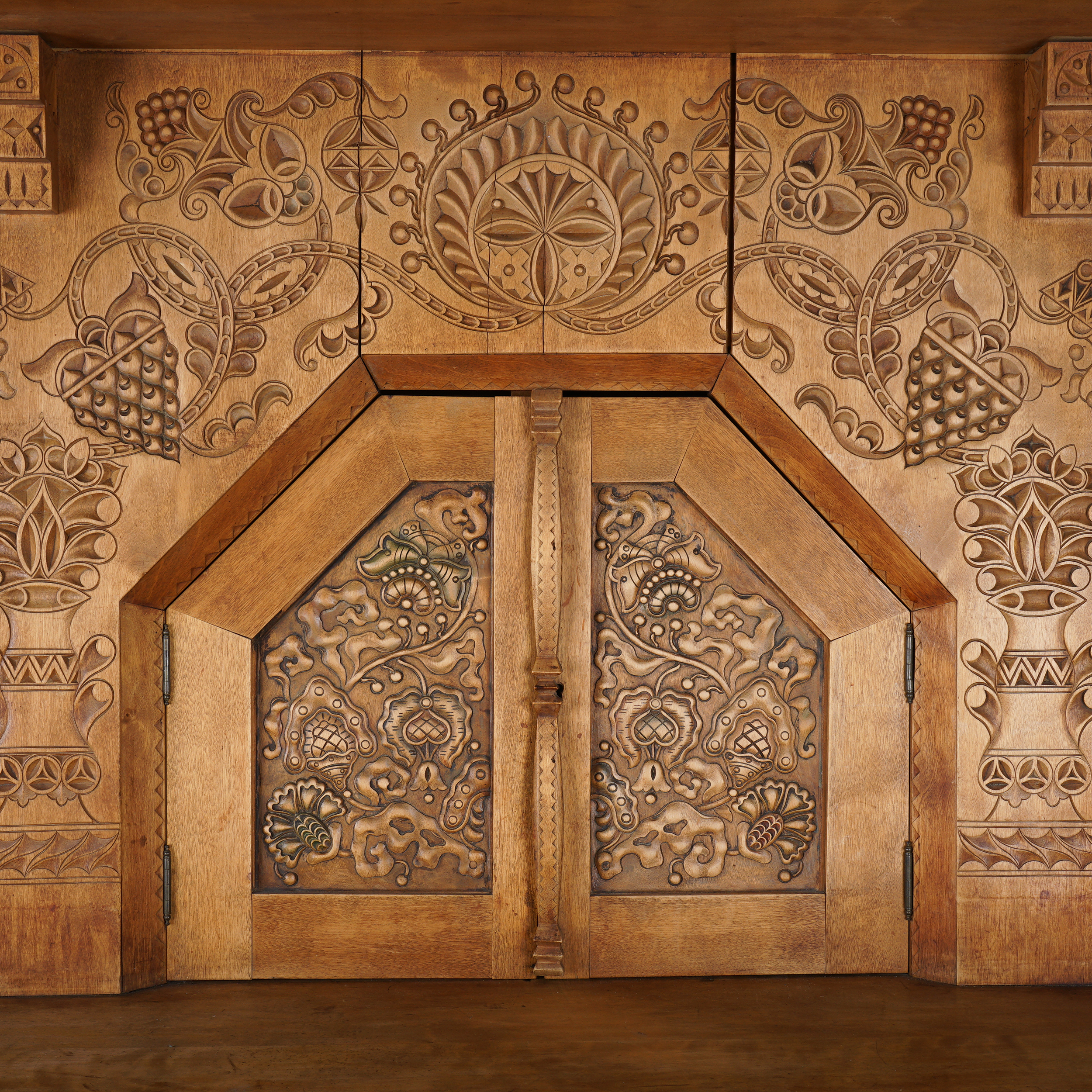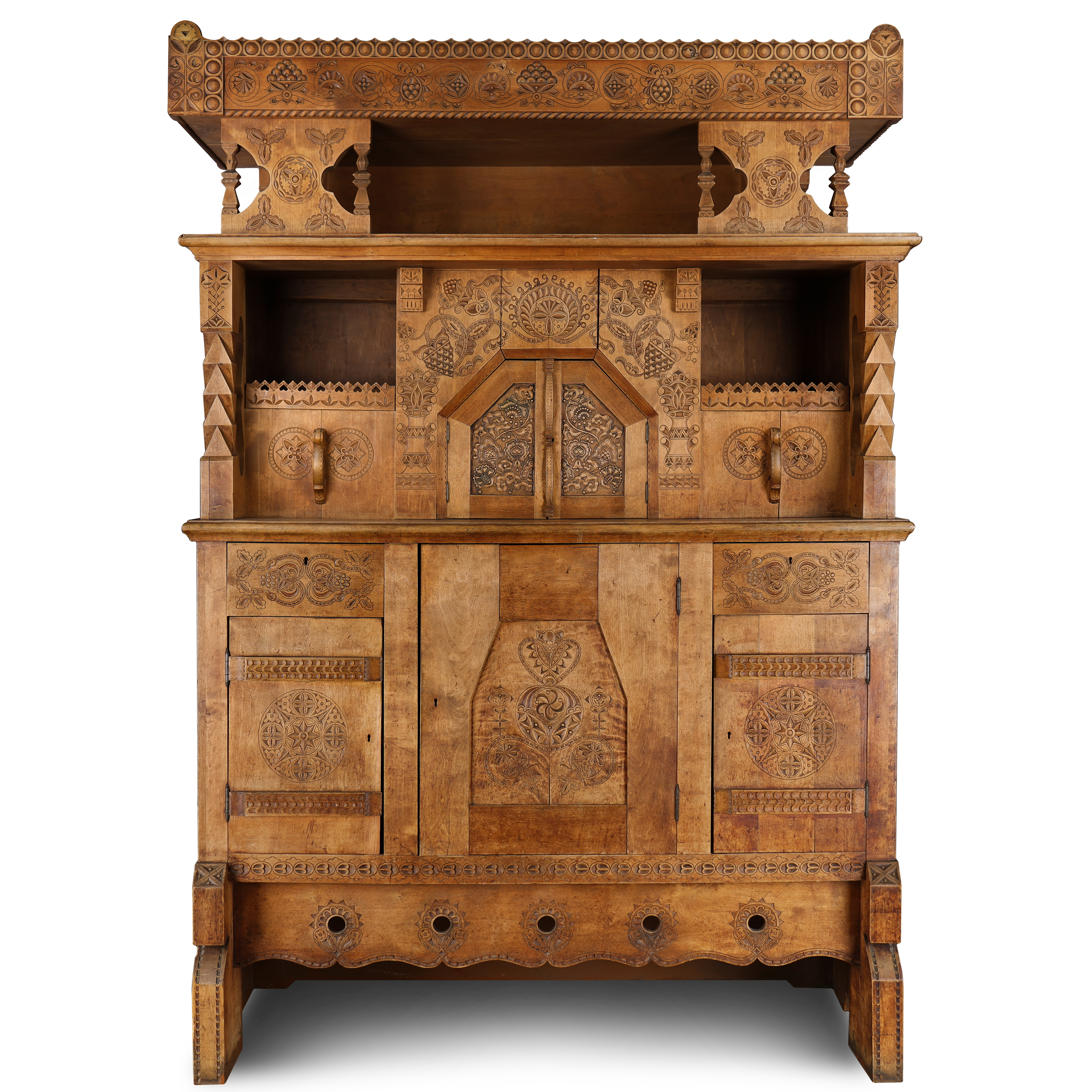 Состоит: Буфет, 12 стульев, полка, письменный стол и настольная рама для фотографии. Дерево, плоско-выемчатая резьба, рельефная резьба. Проект В.И. Черченко, мебельная мастерская Полтавского губернского земства «Древодельня», Россия, Полтава, 1910-е годы. Размеры: (в/ш/г)