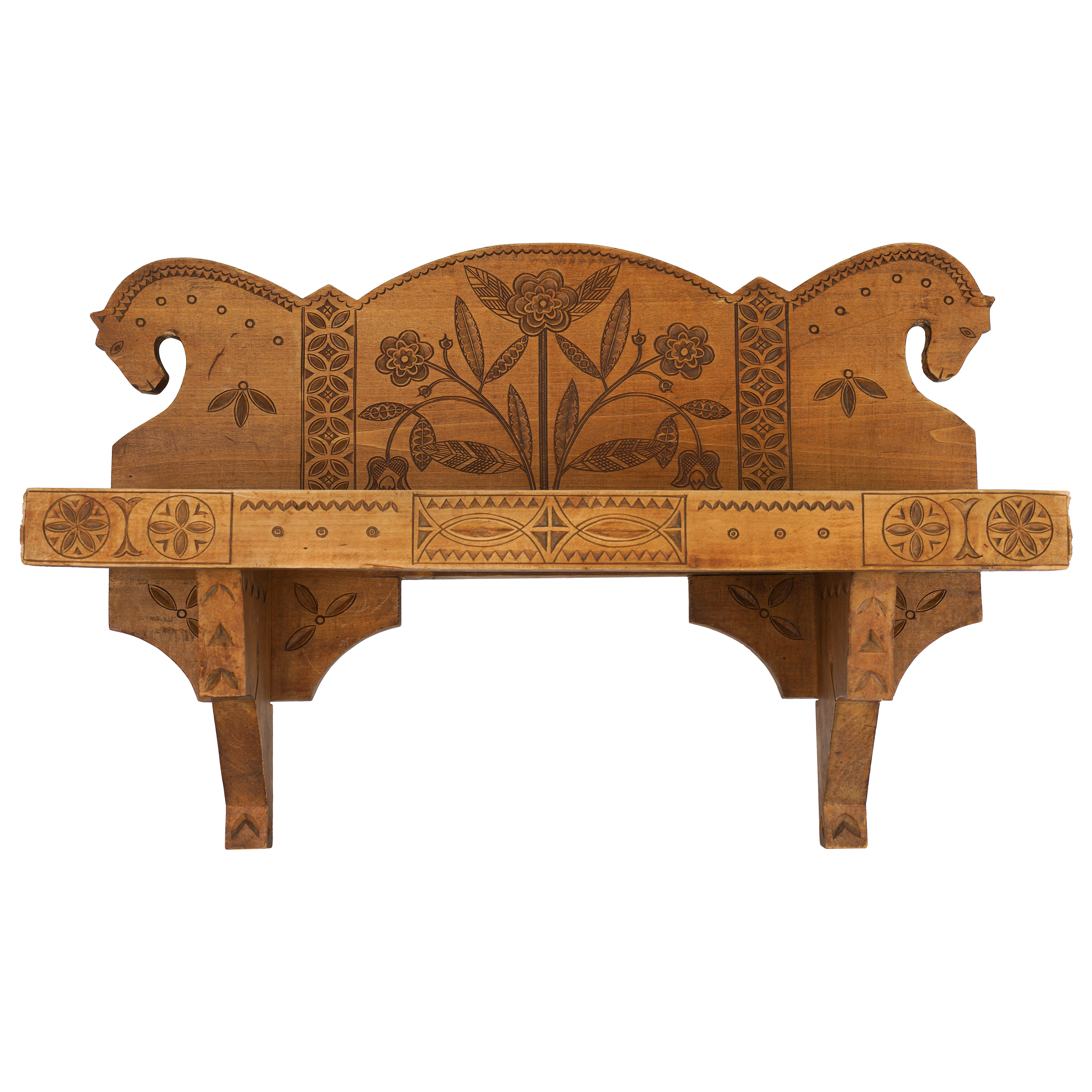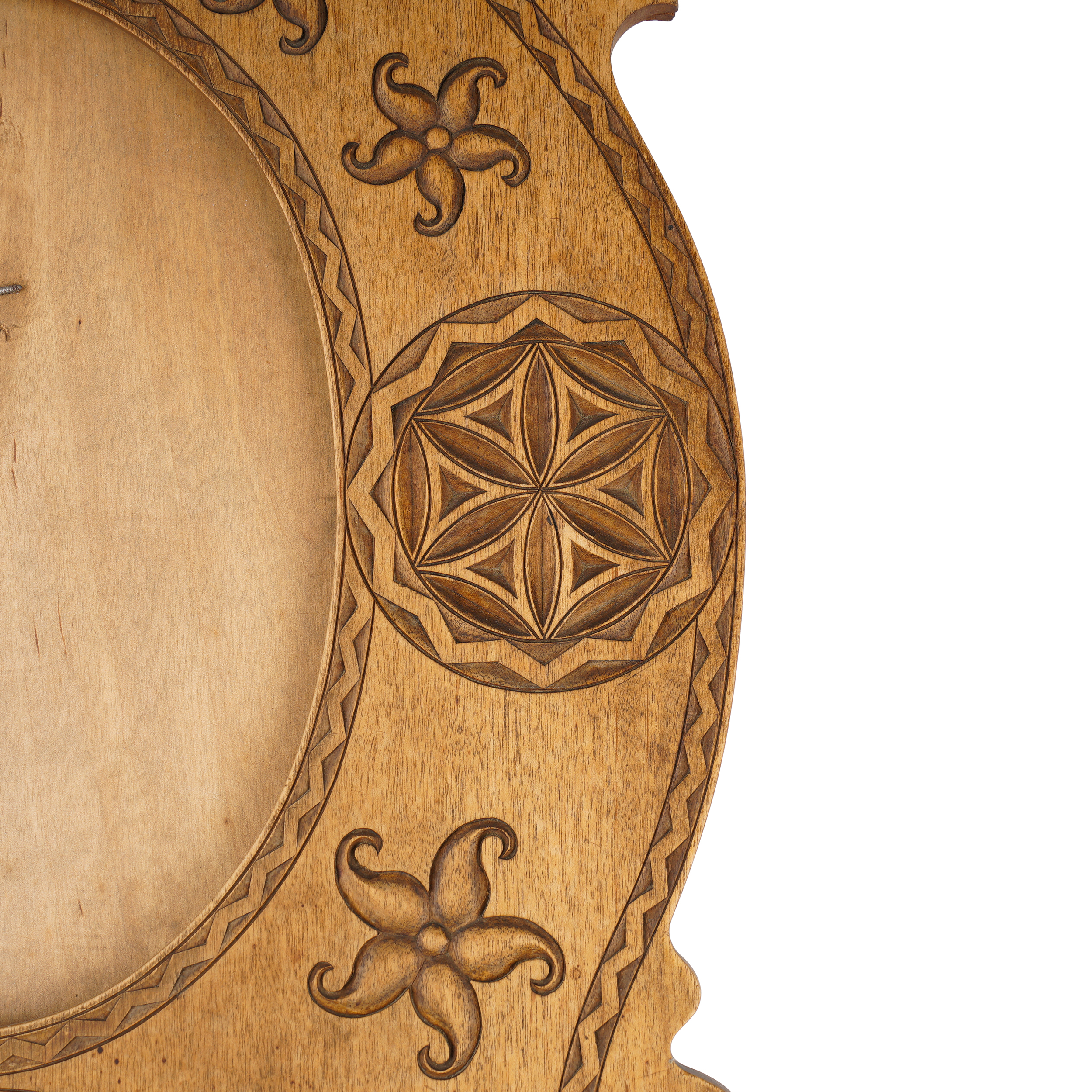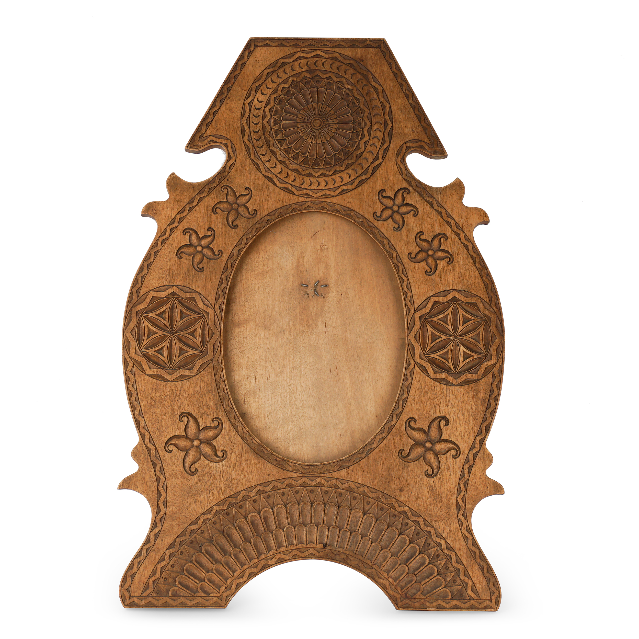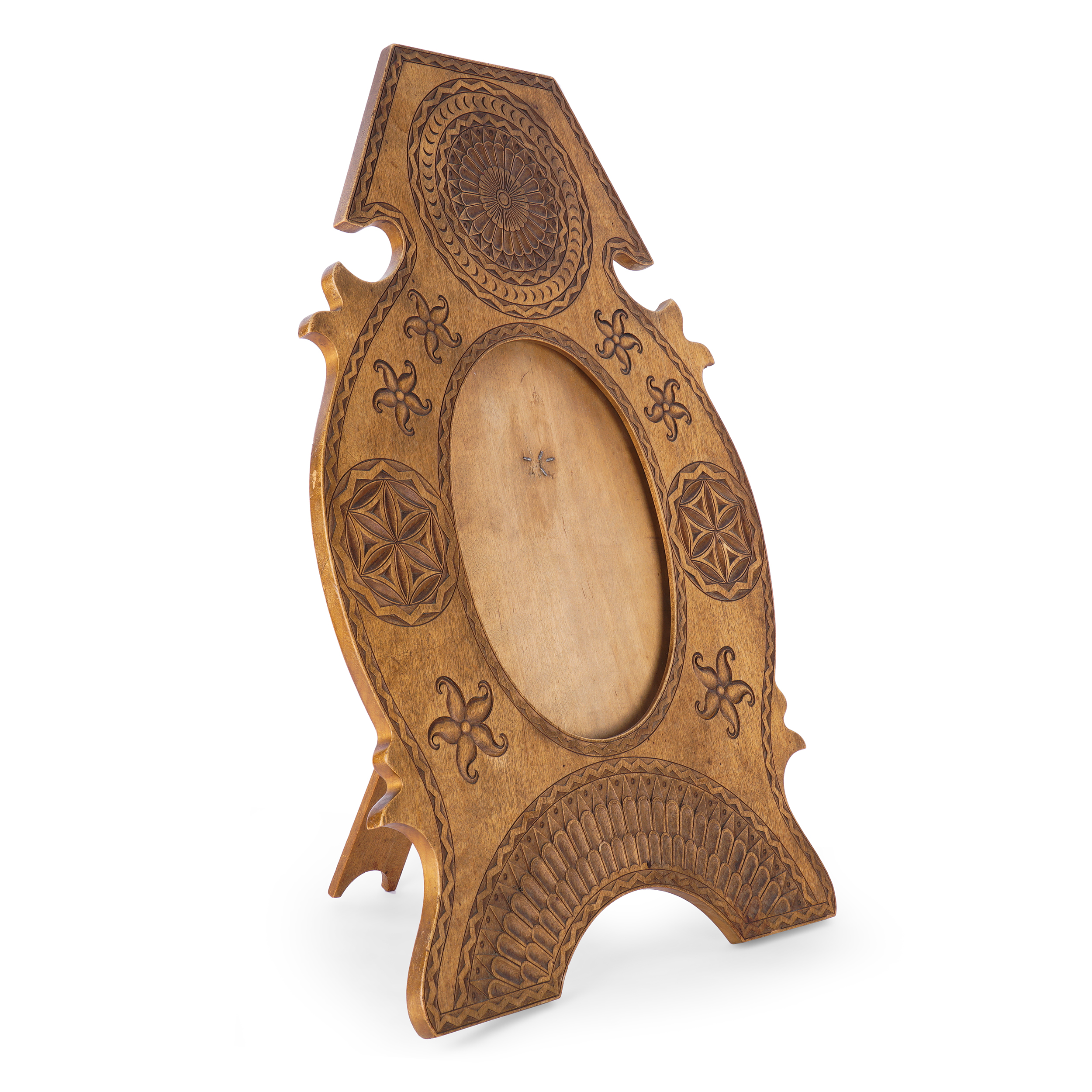 Состоит: Буфет, 12 стульев, полка, письменный стол и настольная рама для фотографии. Дерево, плоско-выемчатая резьба, рельефная резьба. Проект В.И. Черченко, мебельная мастерская Полтавского губернского земства «Древодельня», Россия, Полтава, 1910-е годы. Размеры: (в/ш/г)