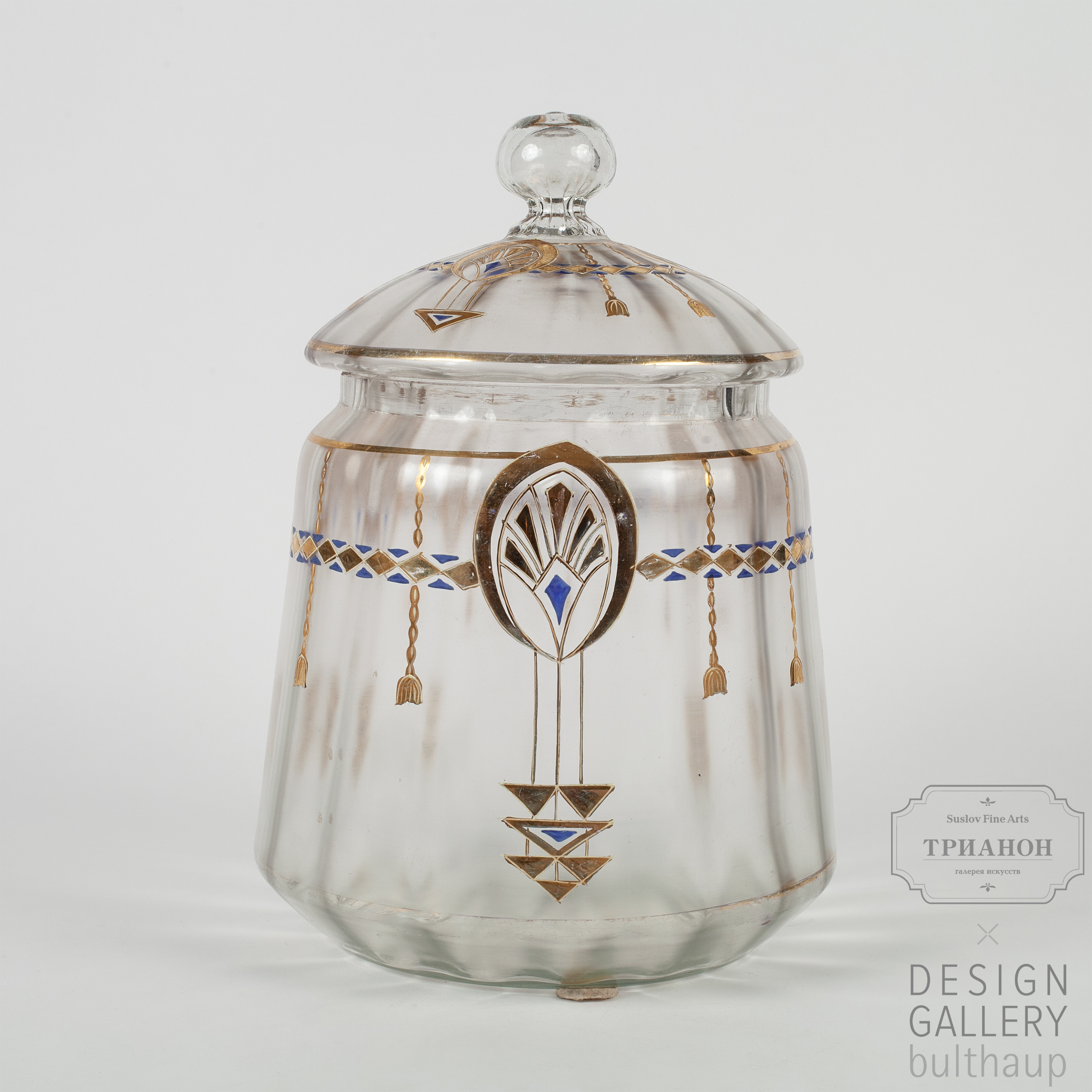 Крюшонница имеет гармоничную и строгую форму с расширяющимся к основанию туловом, что придает сосуду особую устойчивость и визуальную основательность. Ее силуэт венчается плотно прилегающей крышкой. Декор предмета строится на эффектном контрасте прозрачного стекла, благородного орнаментального золочения и тонкой работы монохромными эмалями. Геометрические линии и характерные для начала XX века стилизованные элементы, напоминающие веер или раскрывающийся бутон, подчеркивают линейную эстетику ар-нуво: природные мотивы переплетаются с графической четкостью. Основное назначение этого предмета заключается в торжественной подаче крюшона – прохладительного напитка из вина, ликера и свежих фруктов. Это центральный элемент праздничной сервировки, превращающий процесс угощения гостей в красивый светский ритуал.