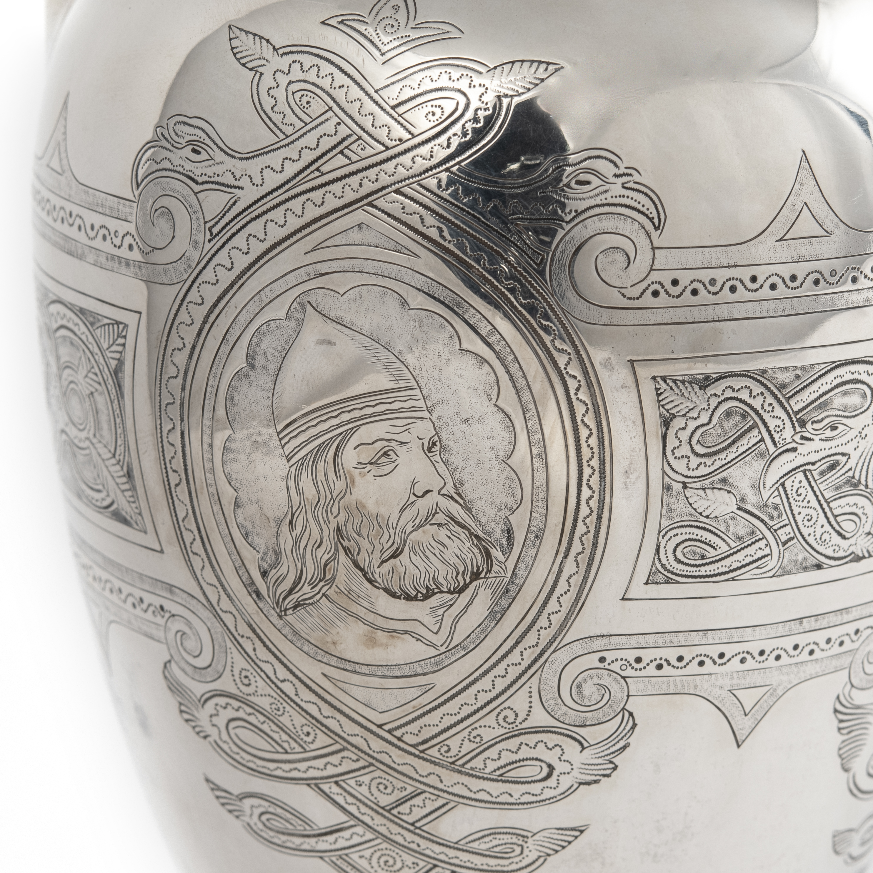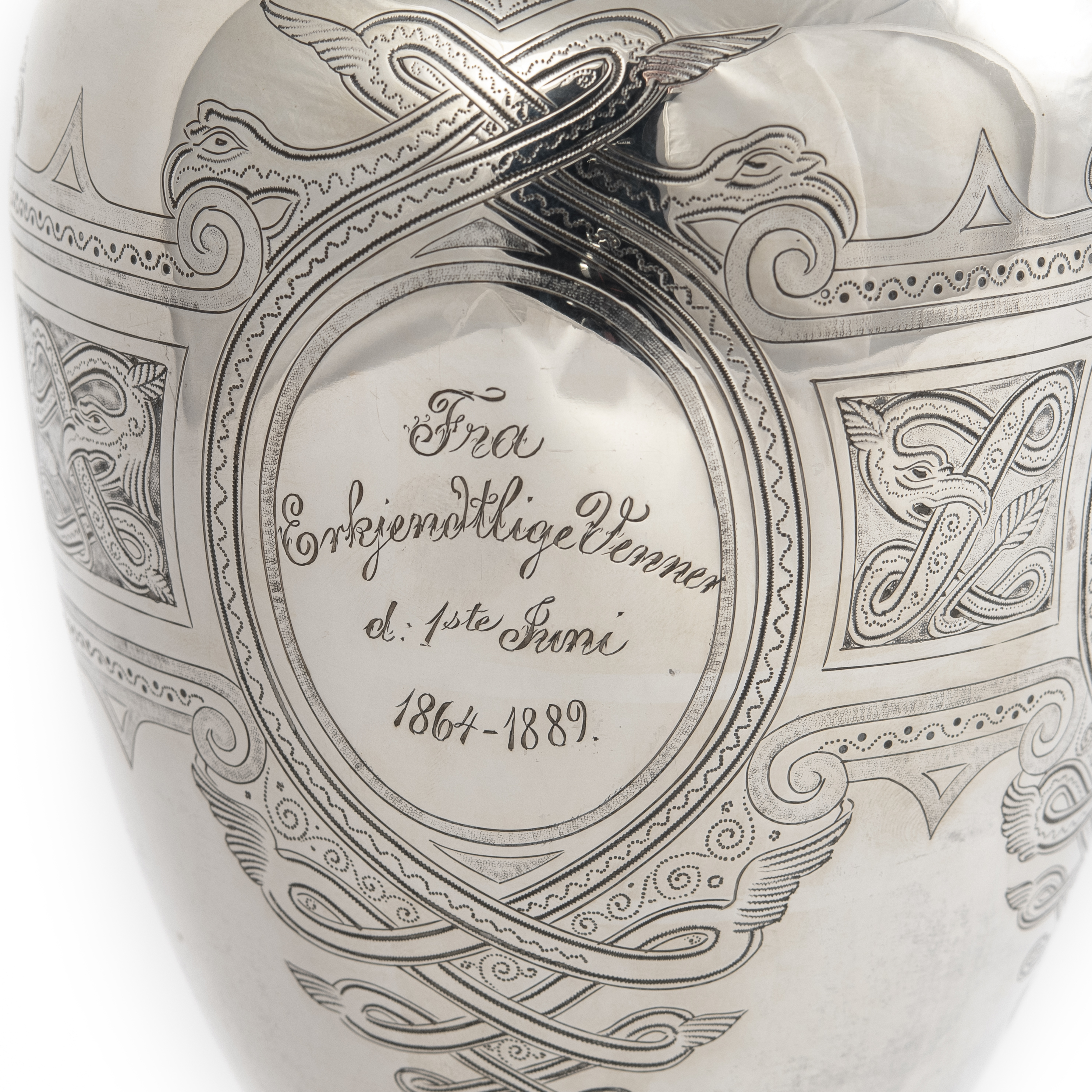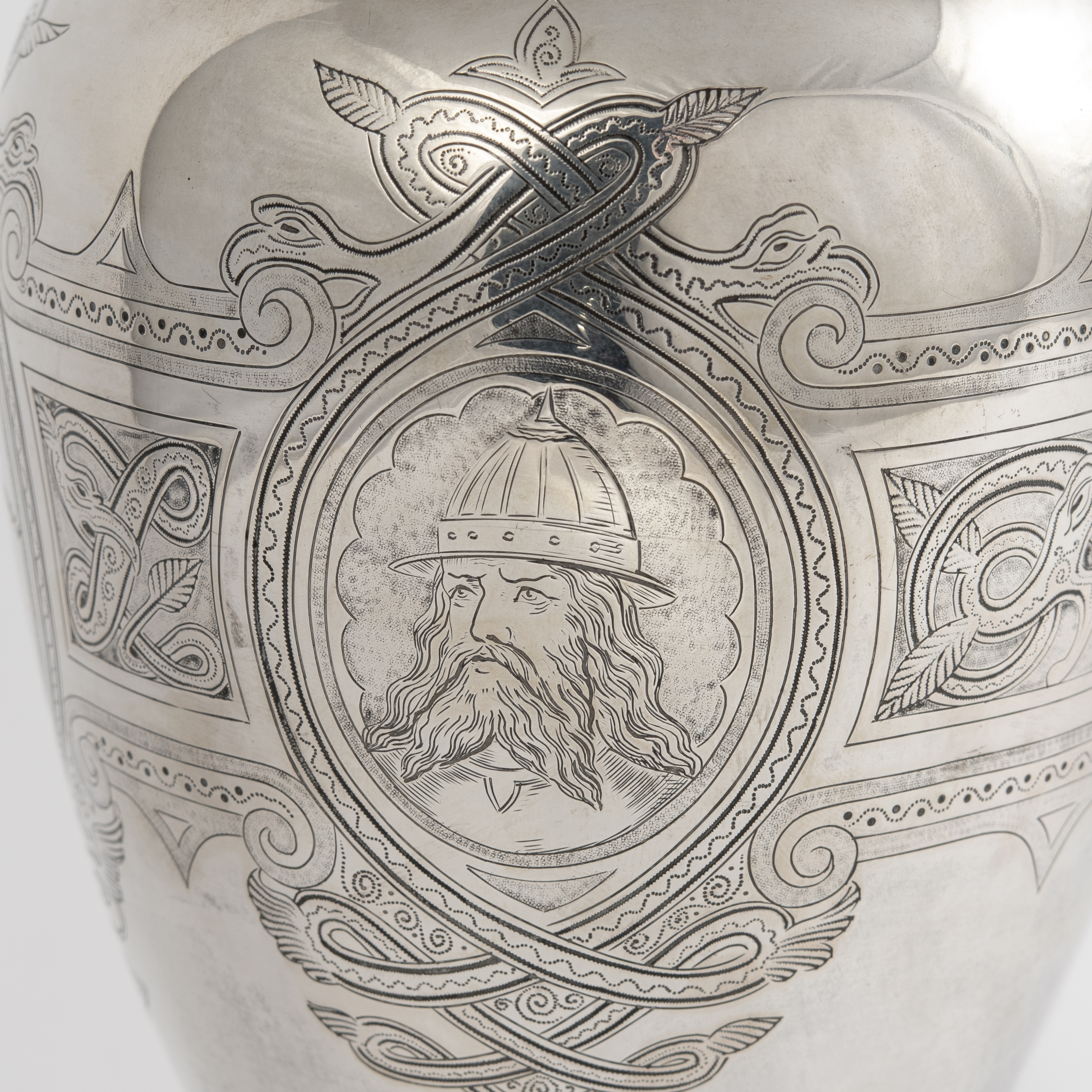 Серебро, литье, полировка, резьба штихелем, гравированная надпись на датском языке «Fra Erkjendtlige Venner d: 1 ste guni 1864-1889» - «От преданных друзей 1864-1889 гг», в картушах расположены гравированные изображения витязей.