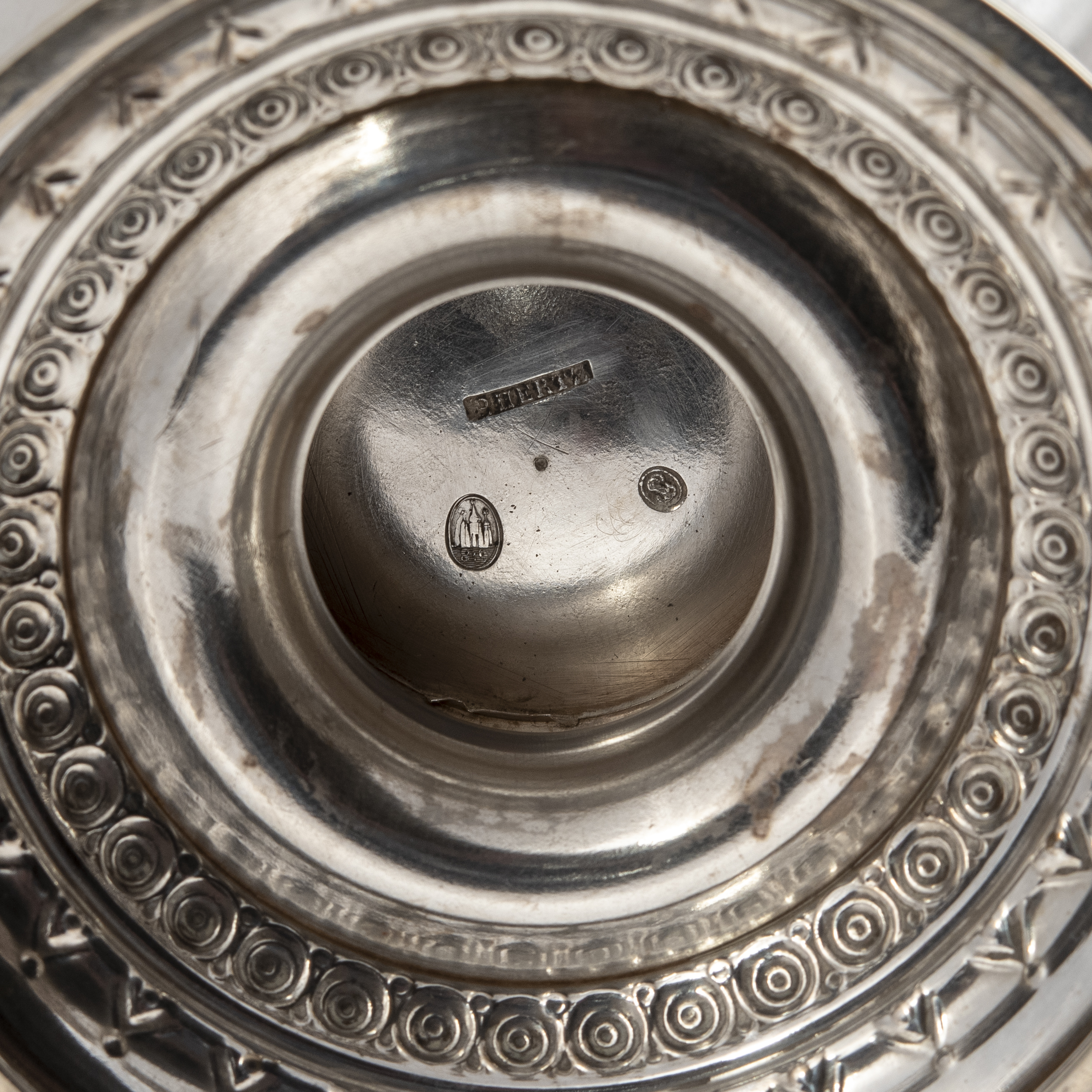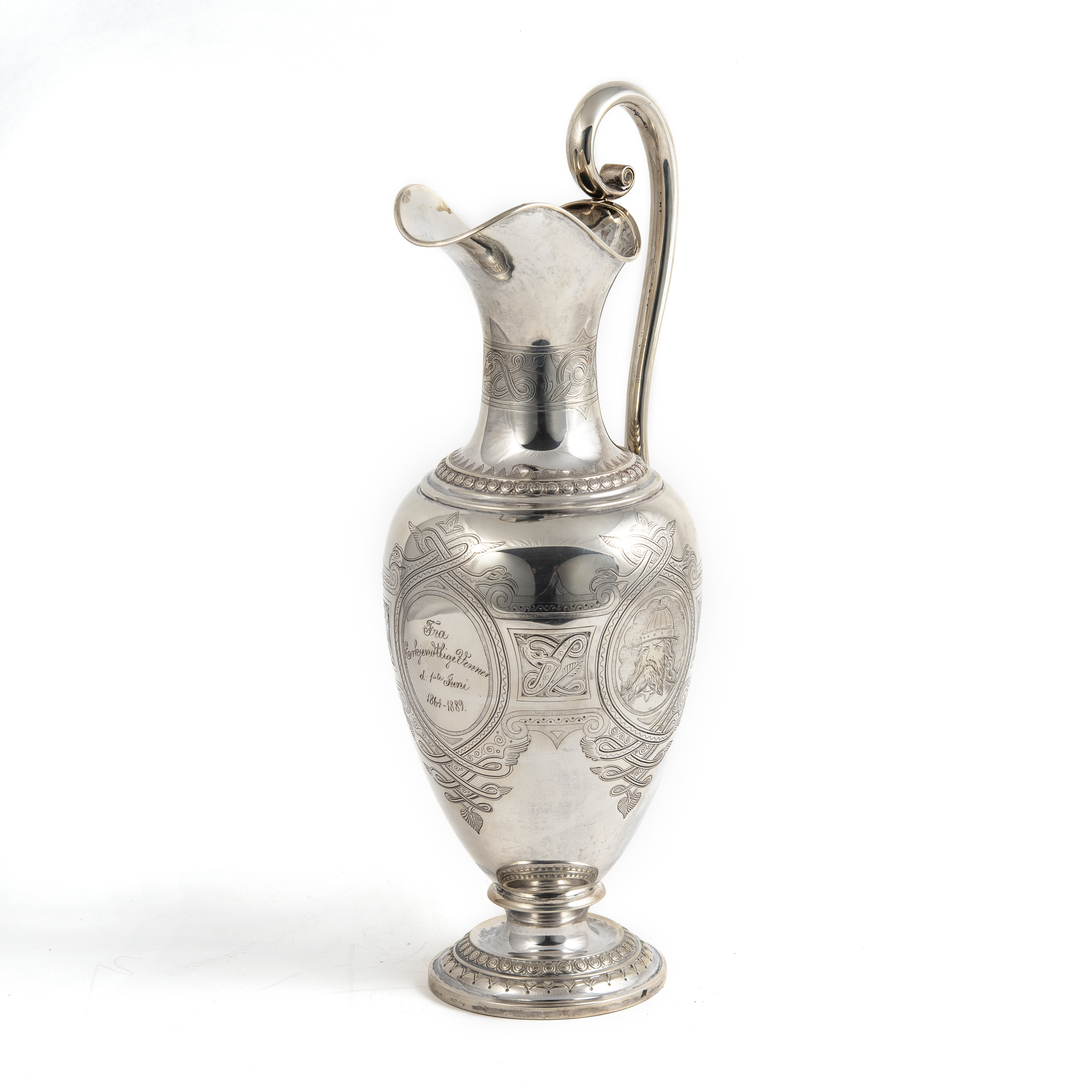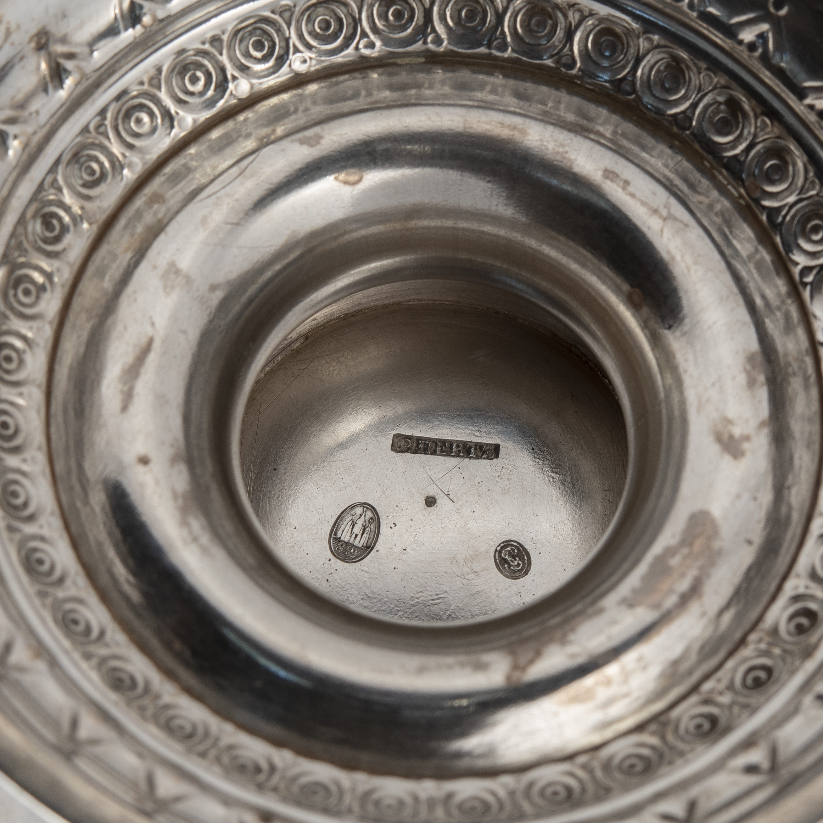 Серебро, литье, полировка, резьба штихелем, гравированная надпись на датском языке «Fra Erkjendtlige Venner d: 1 ste guni 1864-1889» - «От преданных друзей 1864-1889 гг», в картушах расположены гравированные изображения витязей.