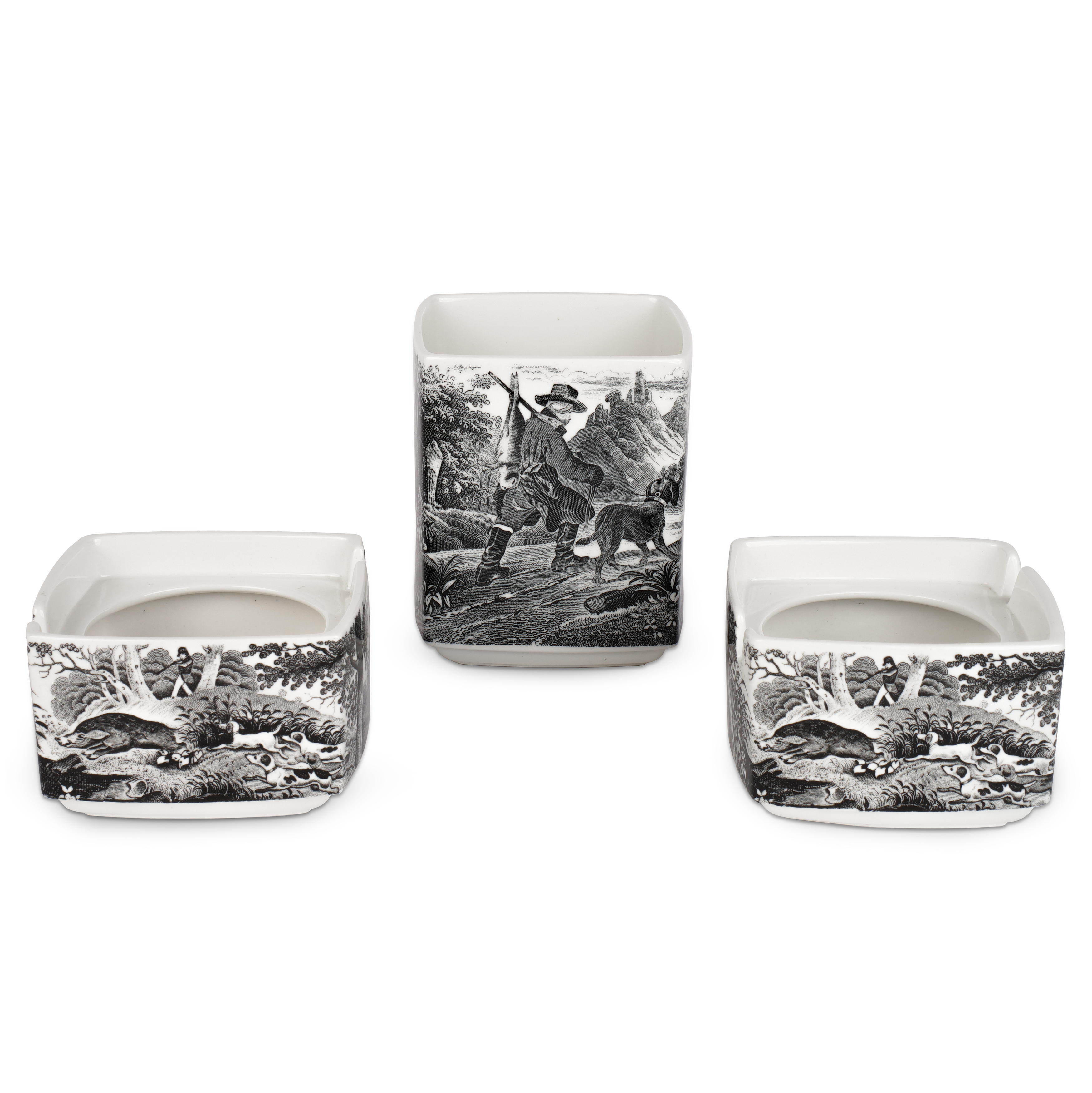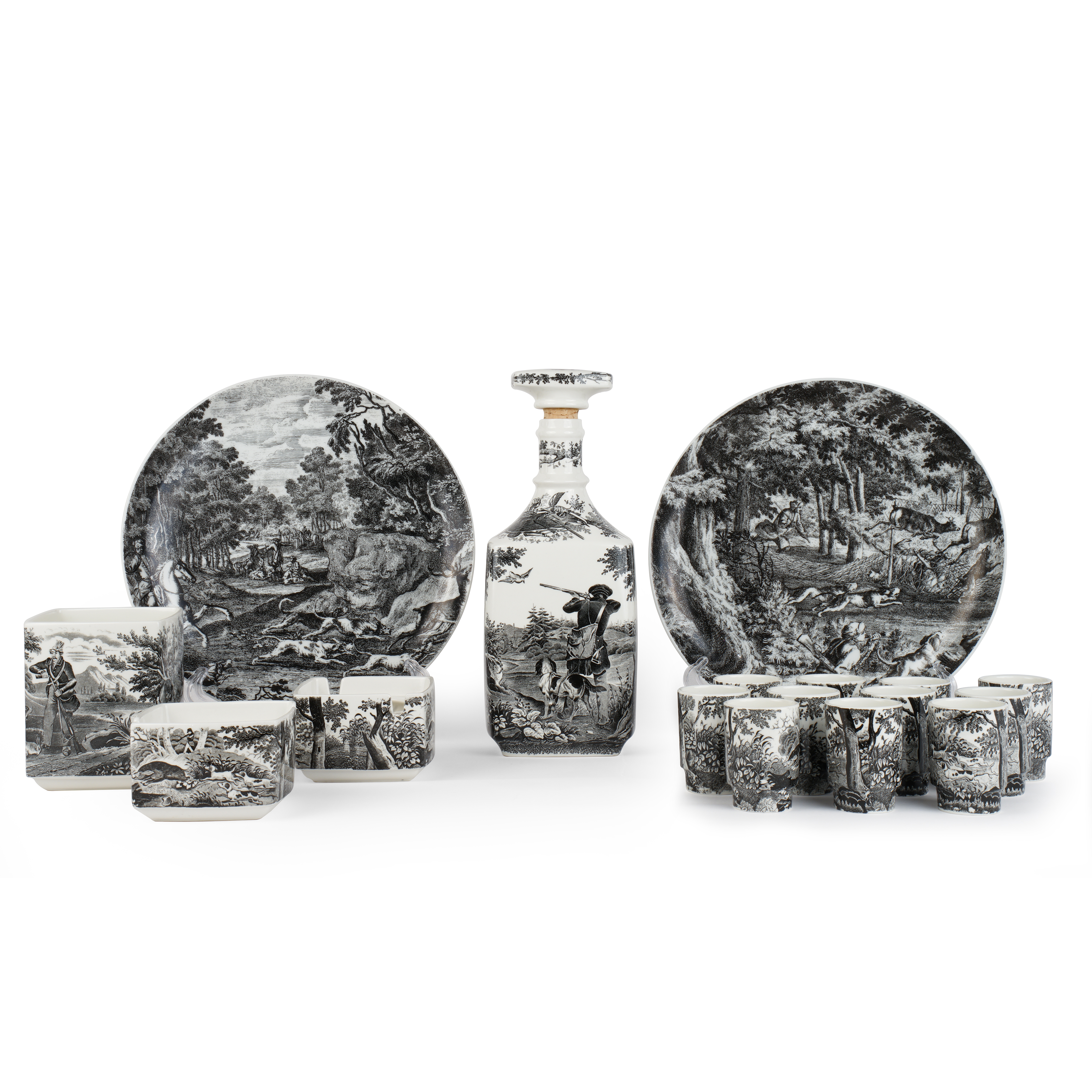 Фарфор, монохромная печать, клейма «Villeroy & Boch, Mettlach», «Uhlenhorst-Studio», мануфактура Виллерой & Бох, серия «Artemis», Германия, вторая половина ХХ века, высота штофа - 24 х 9 х 5 см, объем - 0,5 л, диаметр тарелок - по 23,5 см, пепельницы - 5 х 8,5 см, стакан - 10 х 8,5 см, высота стопок - по 6 см