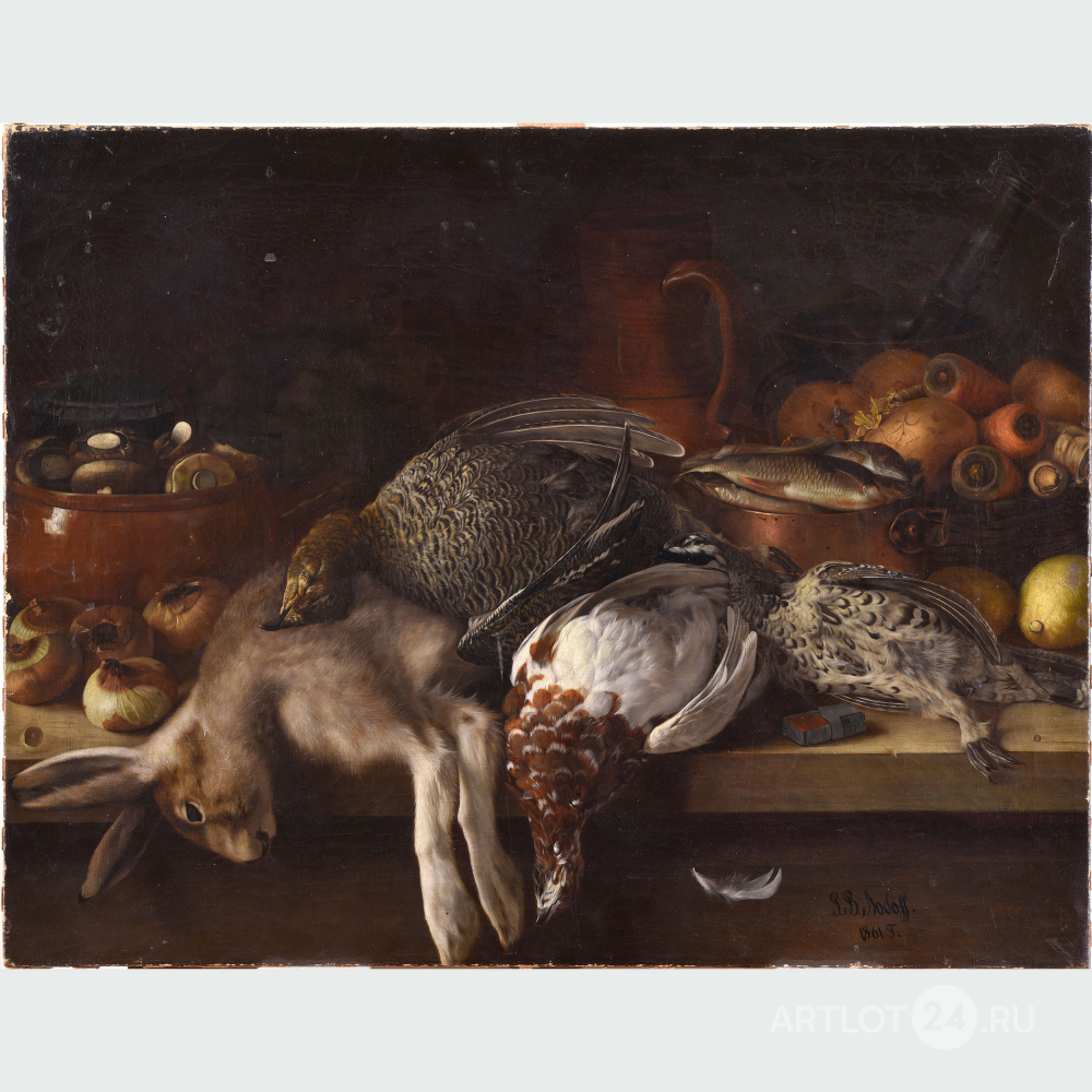Натюрморт в стилистике фламандских и голландских натюрмортов XVII века. Холст, масло, справа внизу подпись и дата «Р.В. Лобоff 1861 Г.», Василий Алексеевич Лобов (1828 - ?), Россия, середина XIX века, размеры: холста 58 х 75,3 см, в раме: 77 х 93 см.