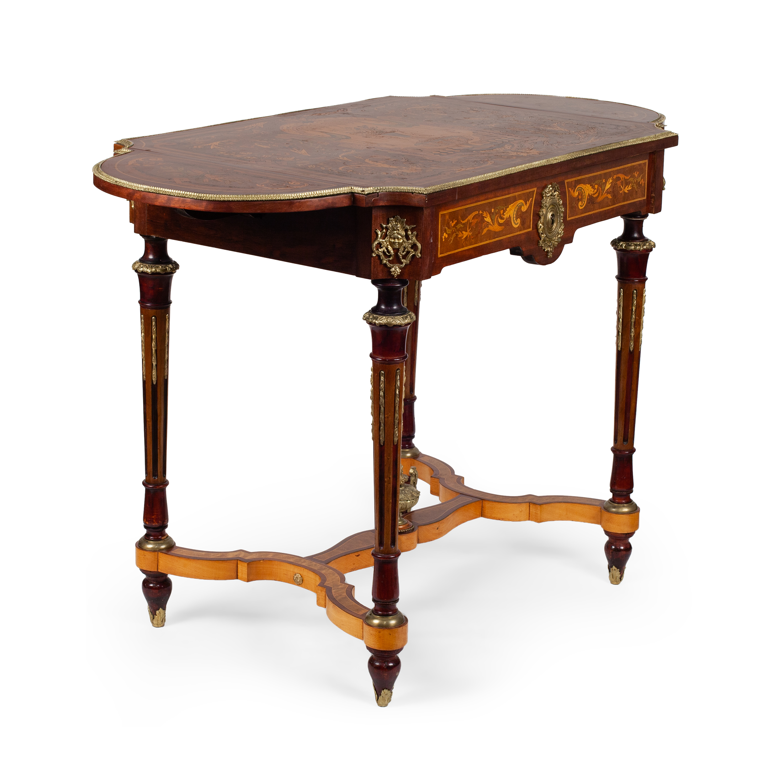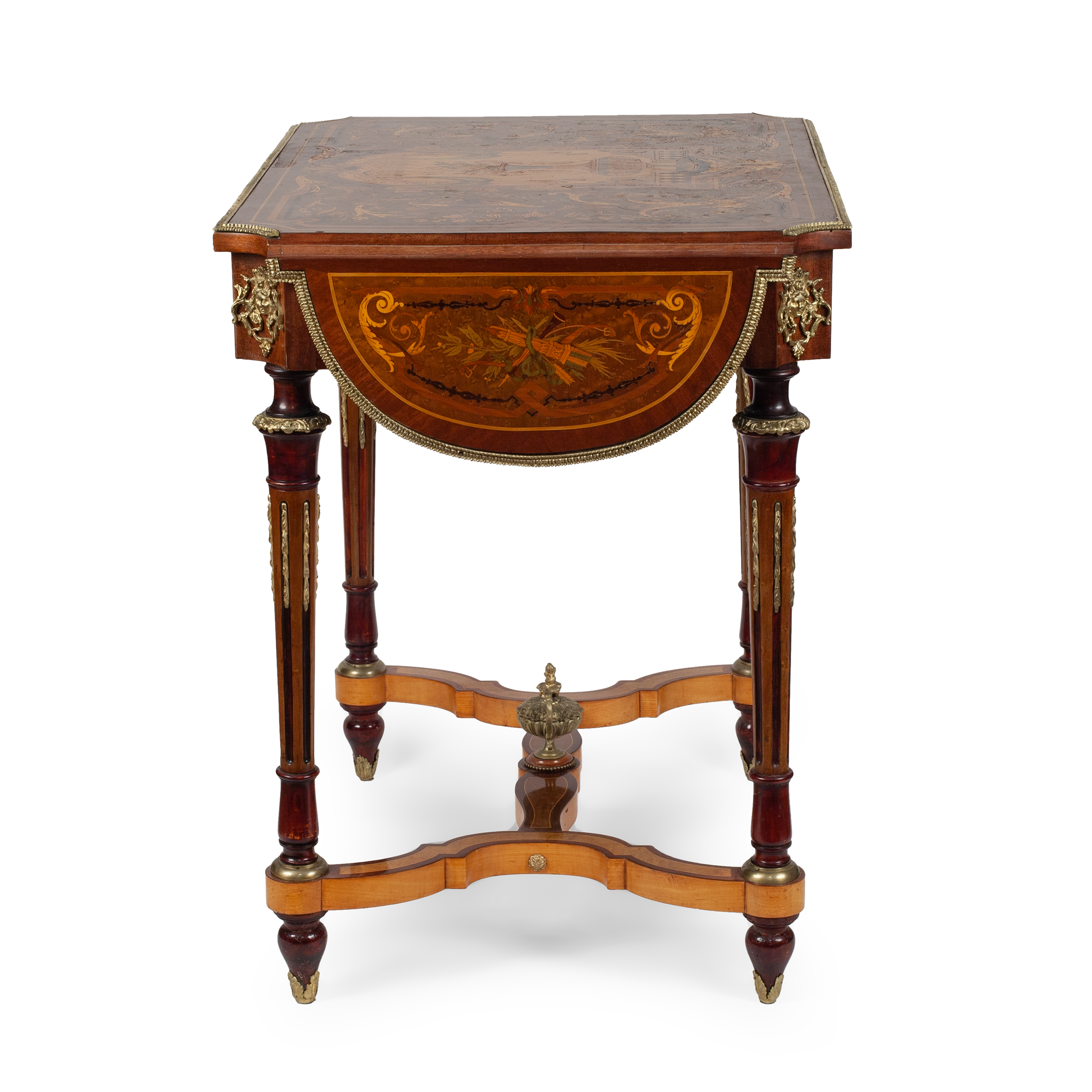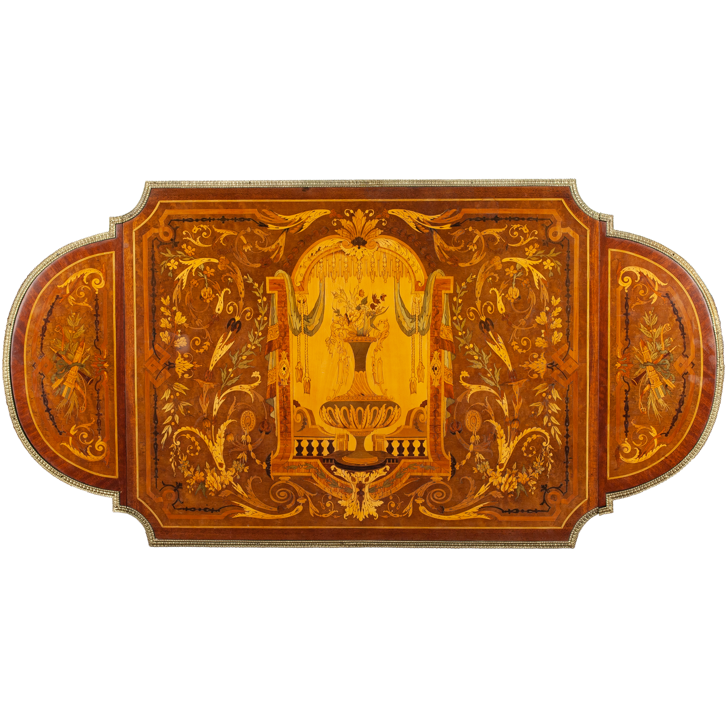 Дерево (основа), шпонирование, техника маркетри (инкрустация ценными породами дерева: розовое дерево, палисандр, груша), металлические накладки, бронза. Западная Европа, конец XIX века, размер: высота 76 см, длина 78 см, ширина 57 см