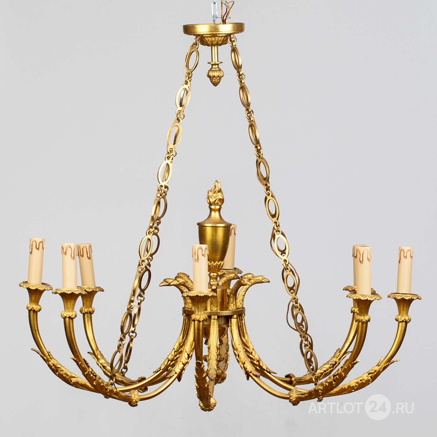 На 8 светоточек, основание каждого рожка выполнено в виде головы орла. Бронза, литье, чеканка, монтировка, Европа, конец XIX века, высота - 70 см, диаметр - 65 см