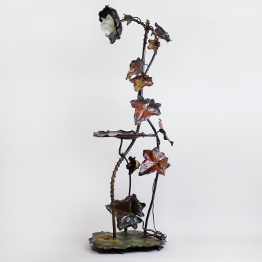 Люстра на четыре светоточки в стиле французского мастера Жана Новерди. Латунь, цветное многослойное стекло "monart", выдувание, шлифовка, травление, предположительно Jean Noverdy, Франция, 1920-1930-е годы, высота - 70 см