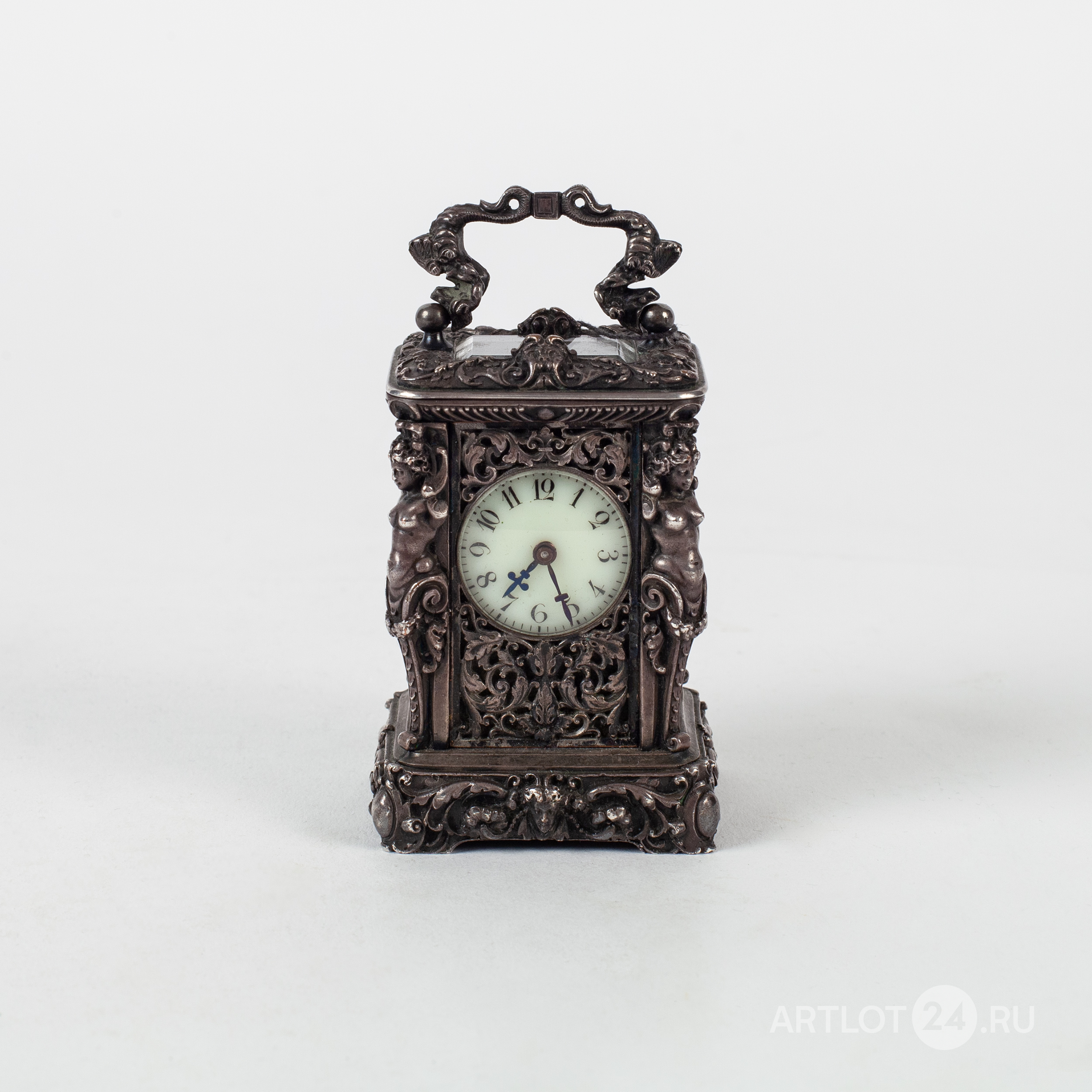 Дорожный будильник в кожаном футляре. Корпус украшен фигурами кариатид и флоральным декором, ручка выполнена в виде дельфинов. Бронза, посеребрение, литье, чеканка, эмалевый циферблат с арабскими цифрами, на плате механизма «Aiguilles», на ложементе футляра с орнаментальным золочением «Beaumont & Cie, Lyon», Франция, вторая половина XIX века, размер часов (в/ш/г): 8 х 4,5 х 3,5 см, футляра: 9 х 6,5 х 5,5 см