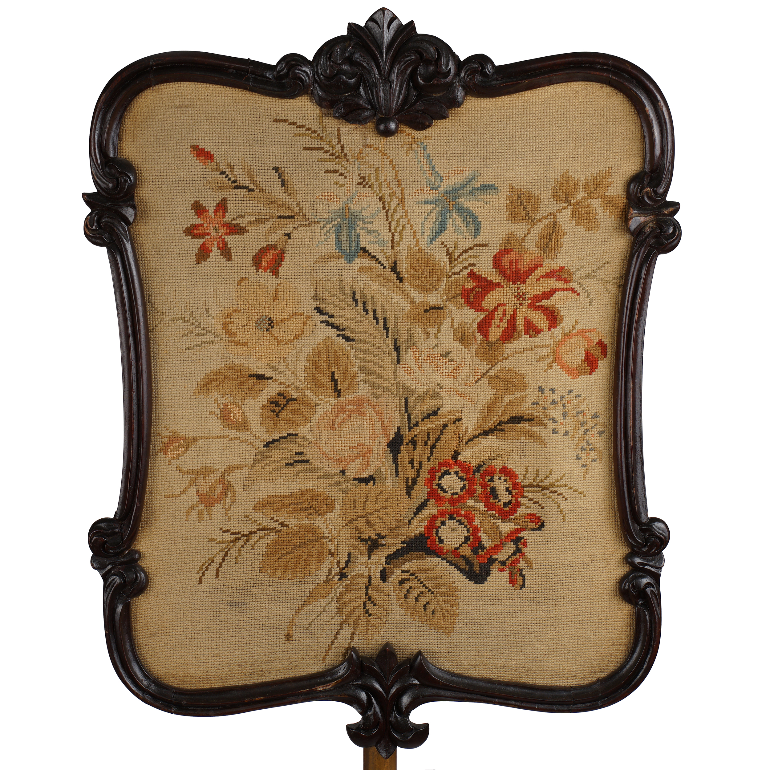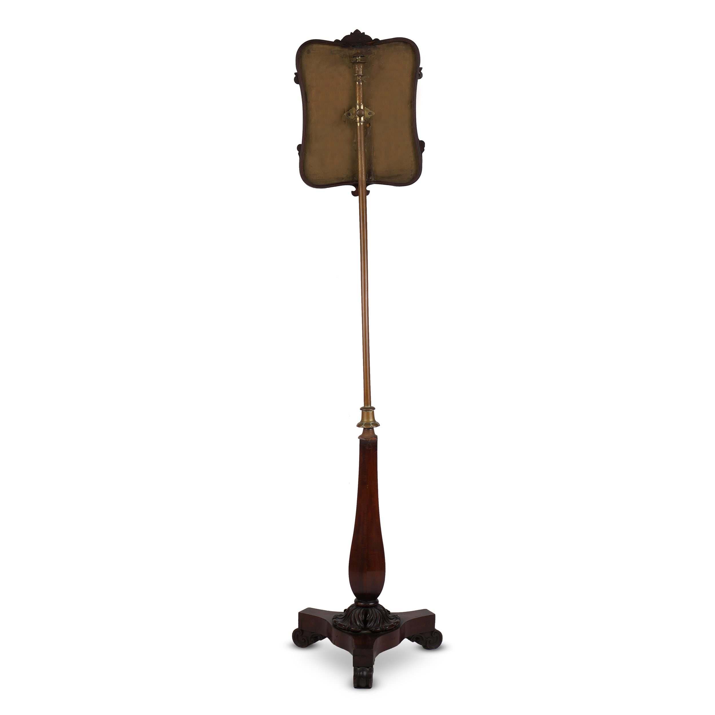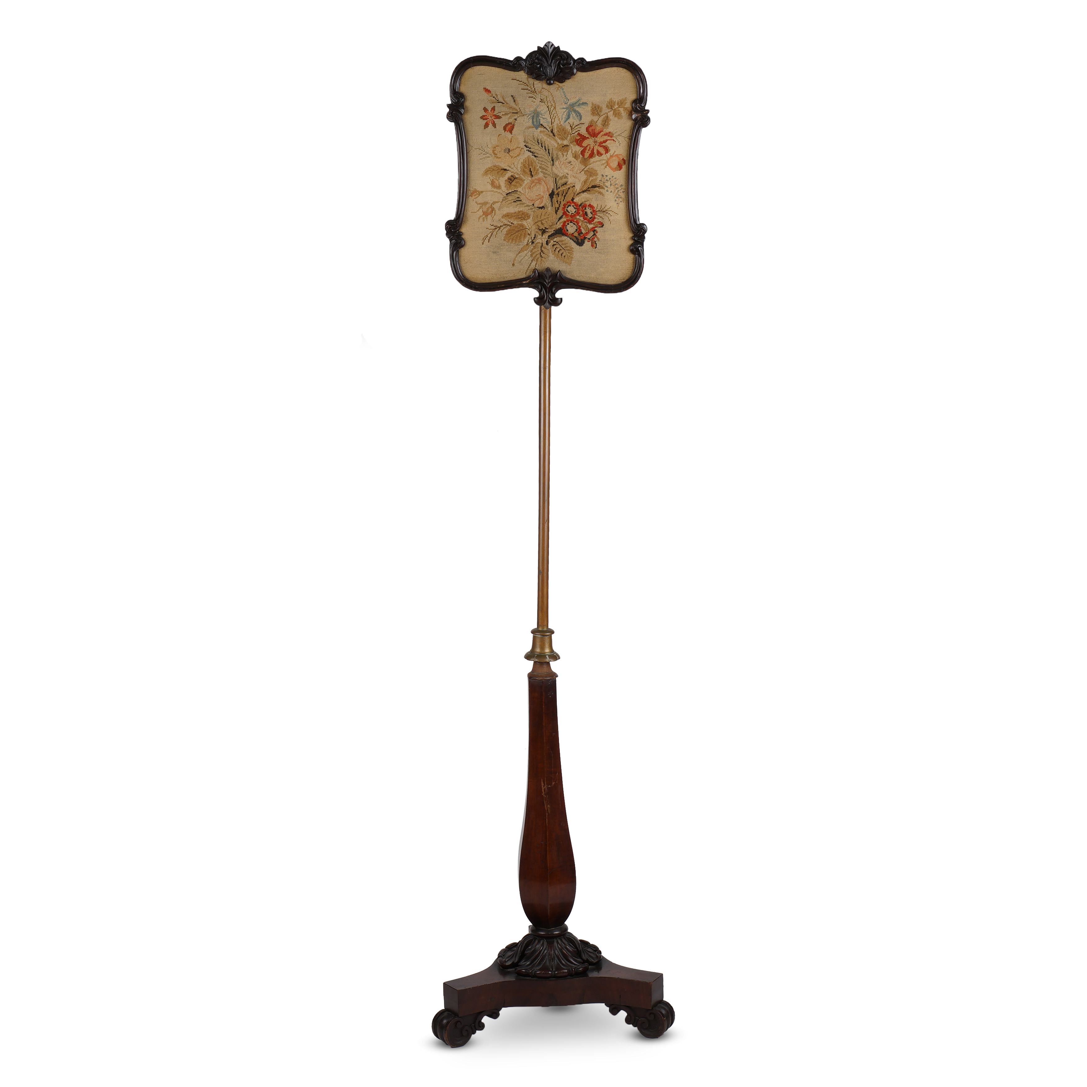 Напольный декоративный экран, защищающий от источника яркого света. Красное дерево, резьба, фанерование, тонировка, латунь, окраска, вышивка, шёлк, Россия, 1830-1840-е годы, высота - 160 см, мах длина основания - 40 см