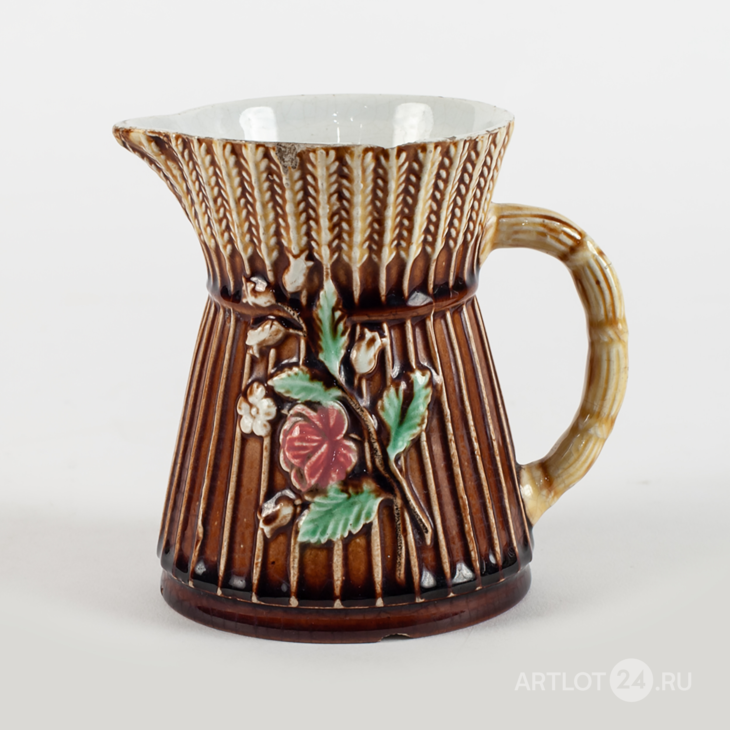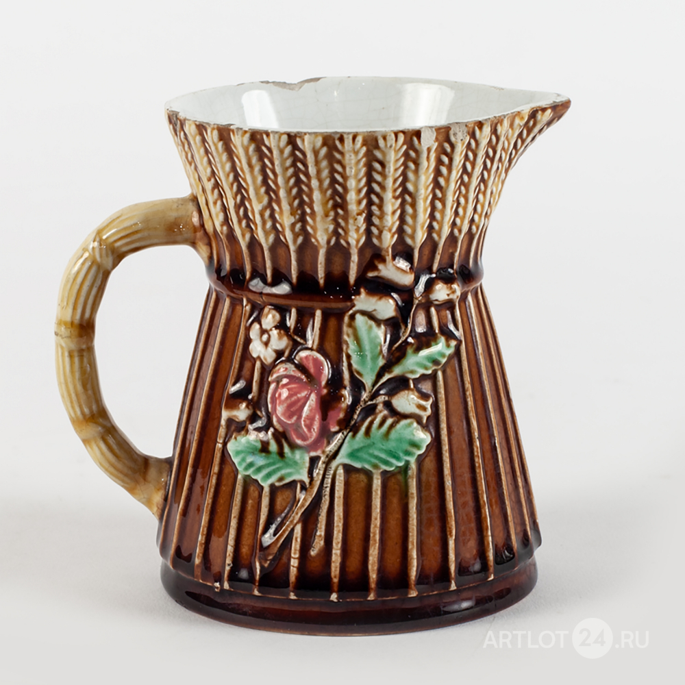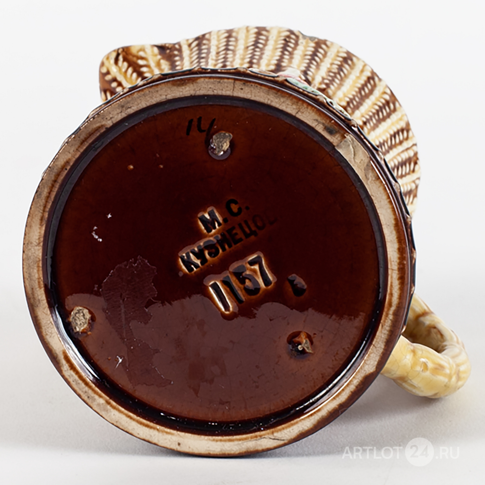 Выполнен в виде рельефных пшеничных колосьев, украшенных цветочной веткой. Фаянс, рельеф, подглазурная полихромная роспись, в тесте клеймо «М.С. Кузнецов», номера «7157» и «5» оттисками в массе, от руки «14» надглазурно, Россия, завод Товарищества М.С. Кузнецова, конец XIX – начало XX века, высота - 10, 2 см, диаметр основания - 8 см, диаметр верха - 7,5 см